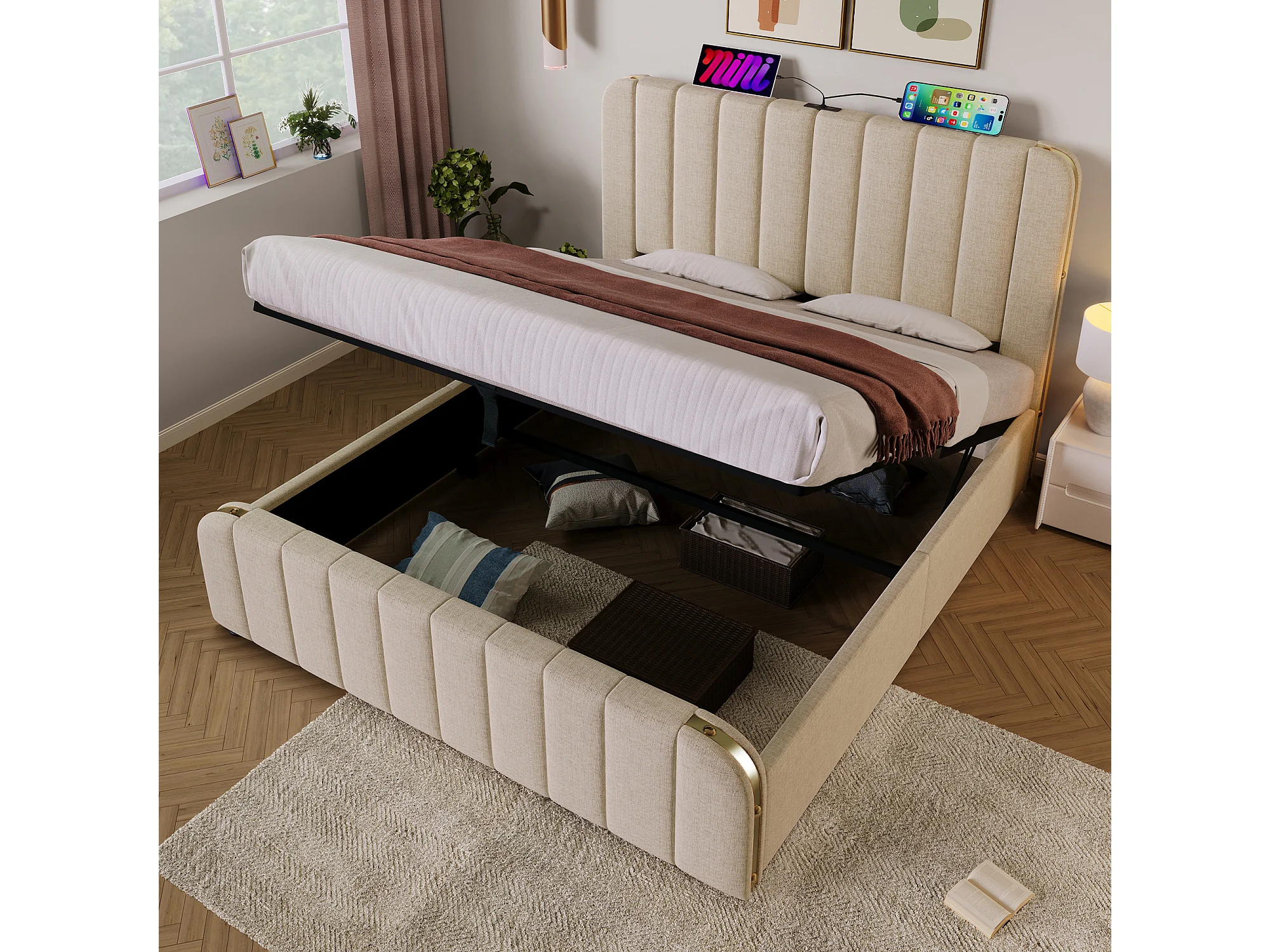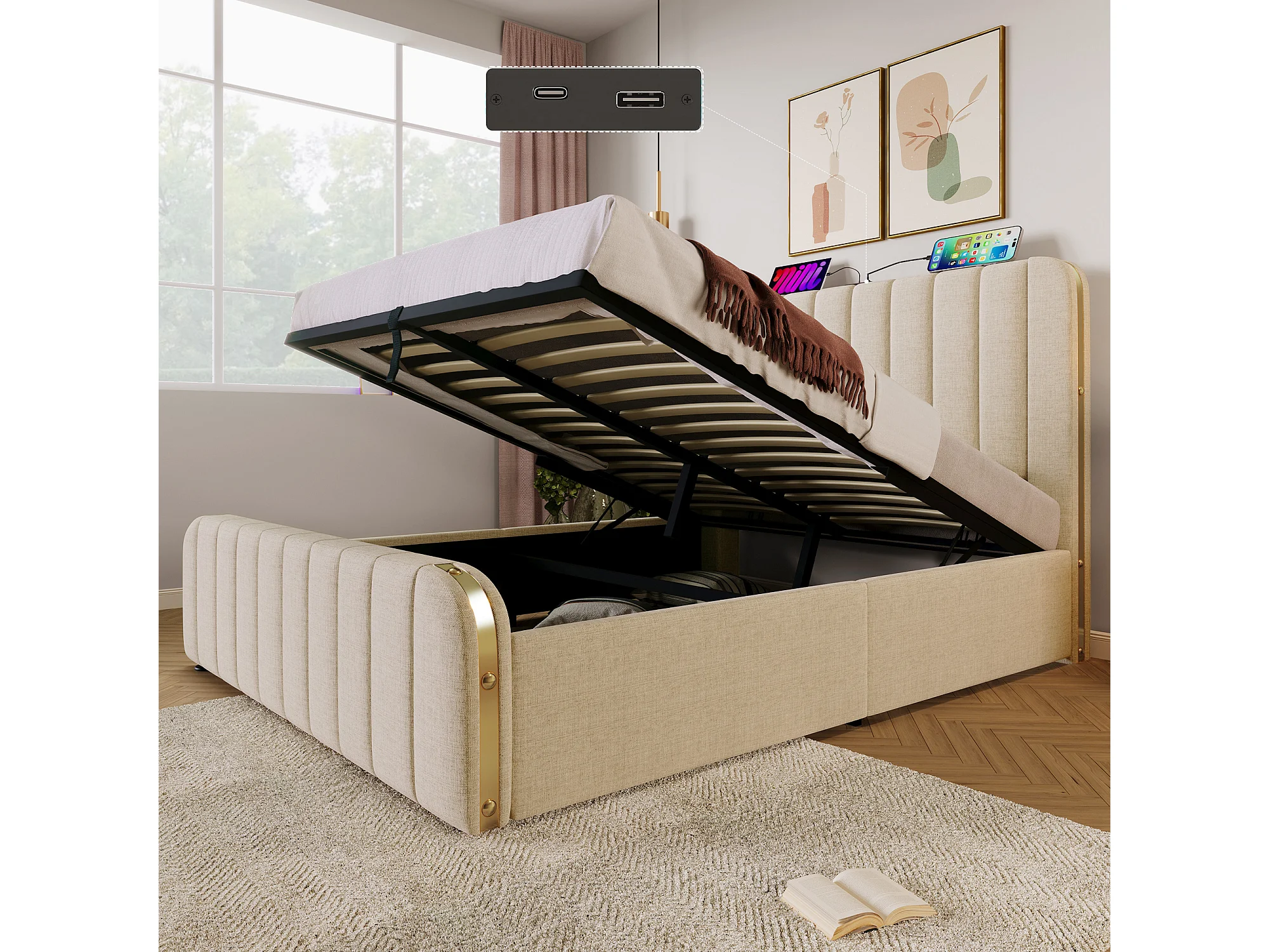Lit coffre capitonné double - 160 x 200 cm - avec tête de lit + USB Type-C + rangement hydraulique - lin - beige
