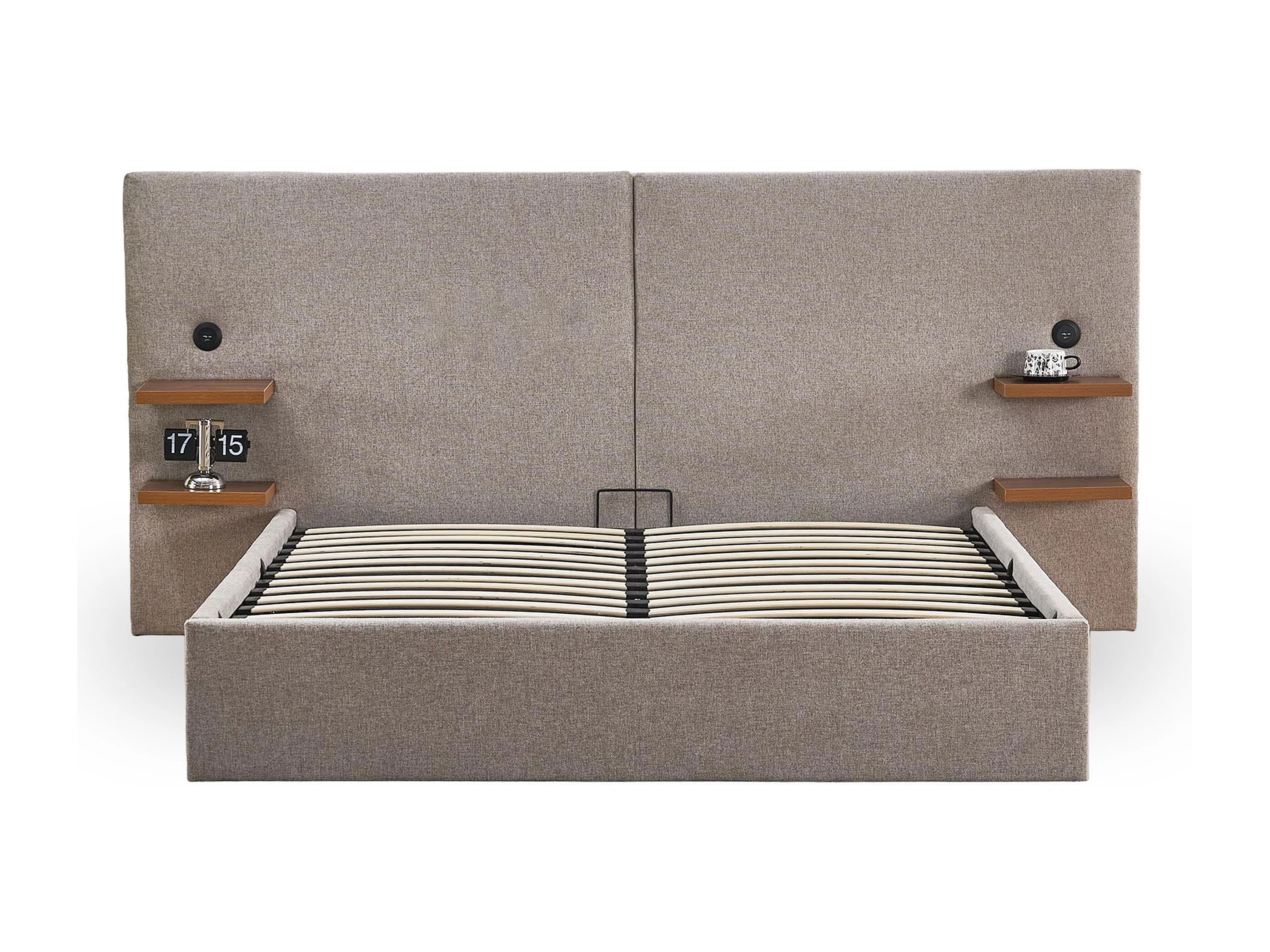 Lit-coffre complet avec tablettes et ports USB intégrés Lukas 160x200cm Tissu Taupe clair