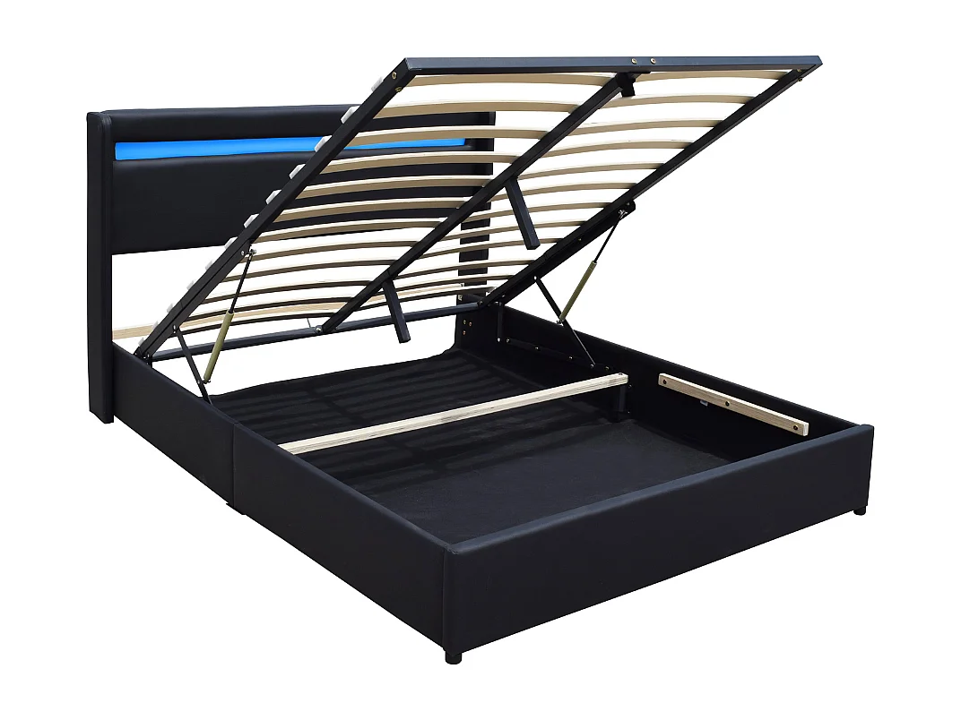 Lit coffre dehoussable 140x200 cm avec tête de lit LED et 14 lattes - Montage rapide - Revêtement PVC simili facile d'entretien