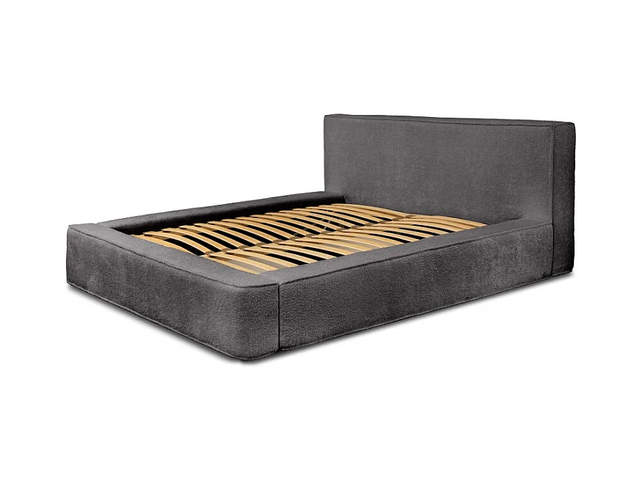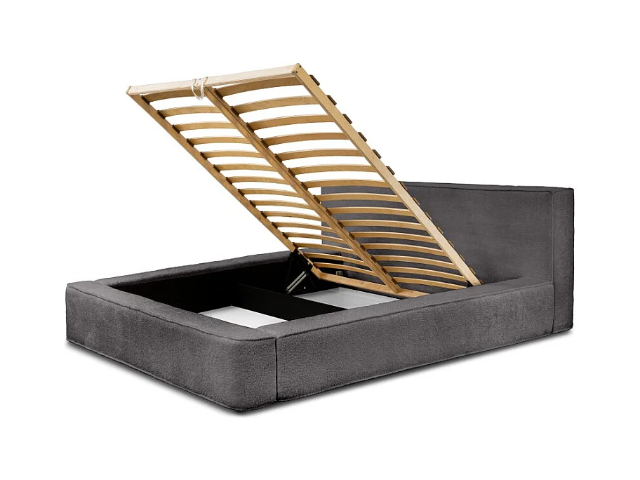 Lit coffre VELORA – Gris cendré bouclé – 180x200 cm – Tissu velours doux – Sommier relevable – Rangement intégré