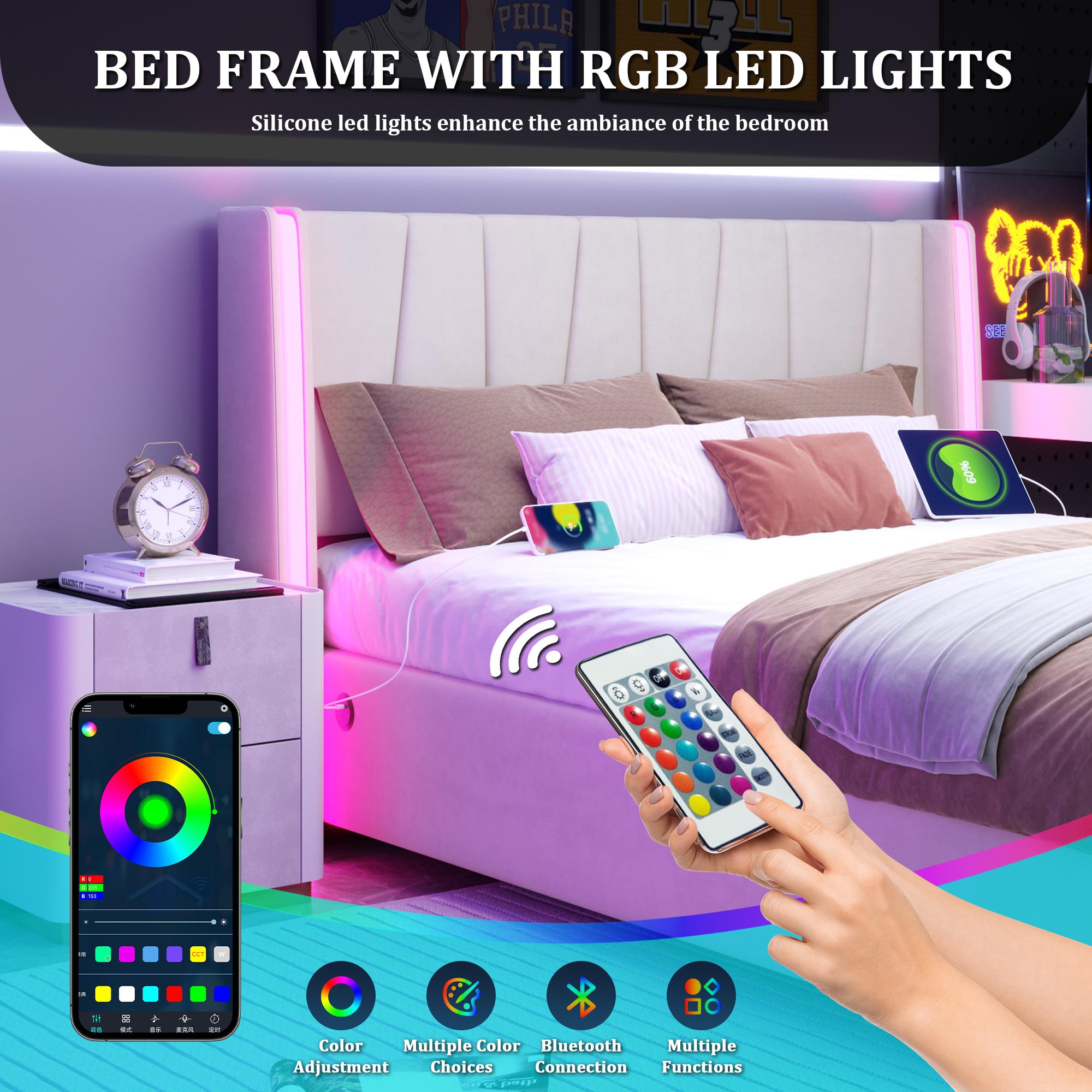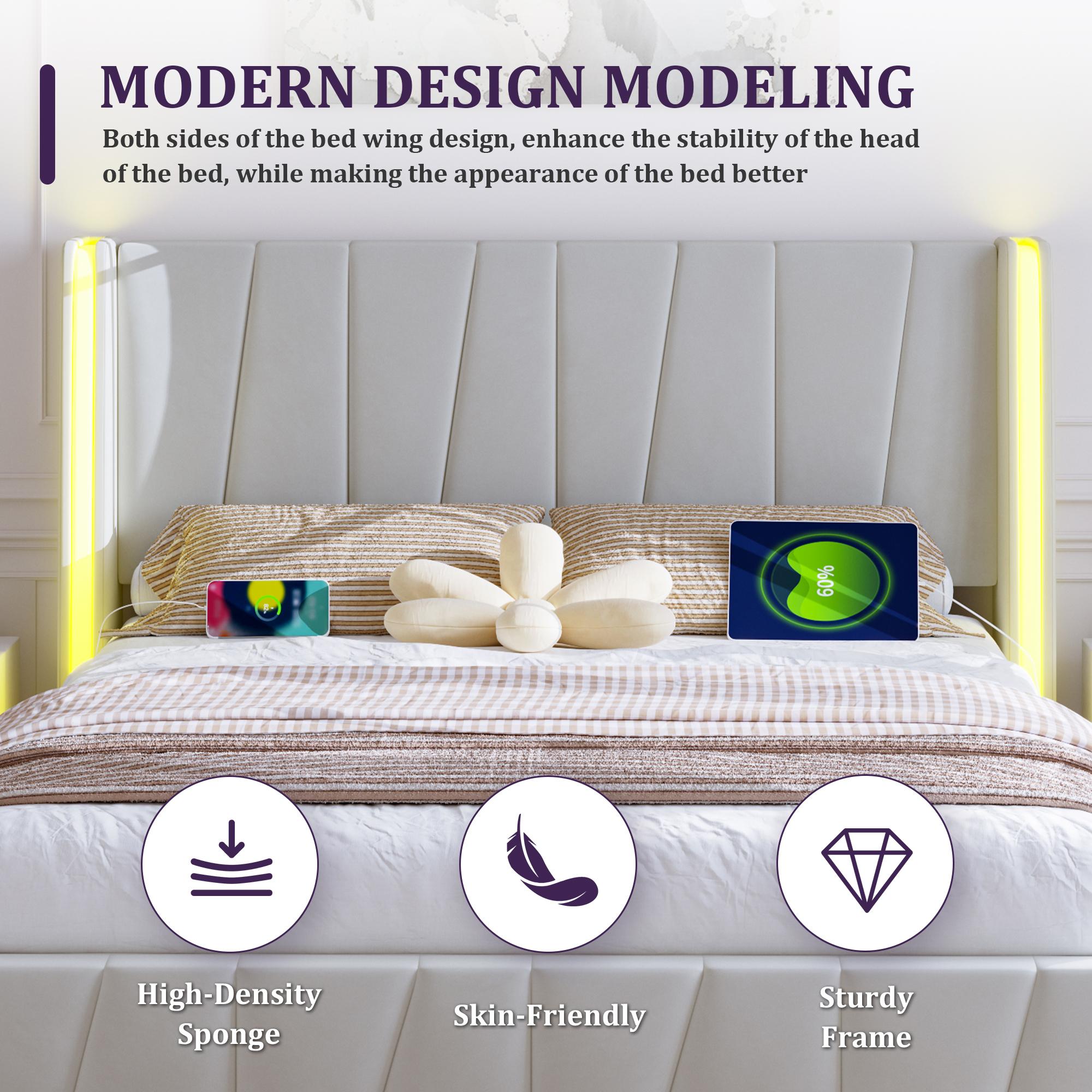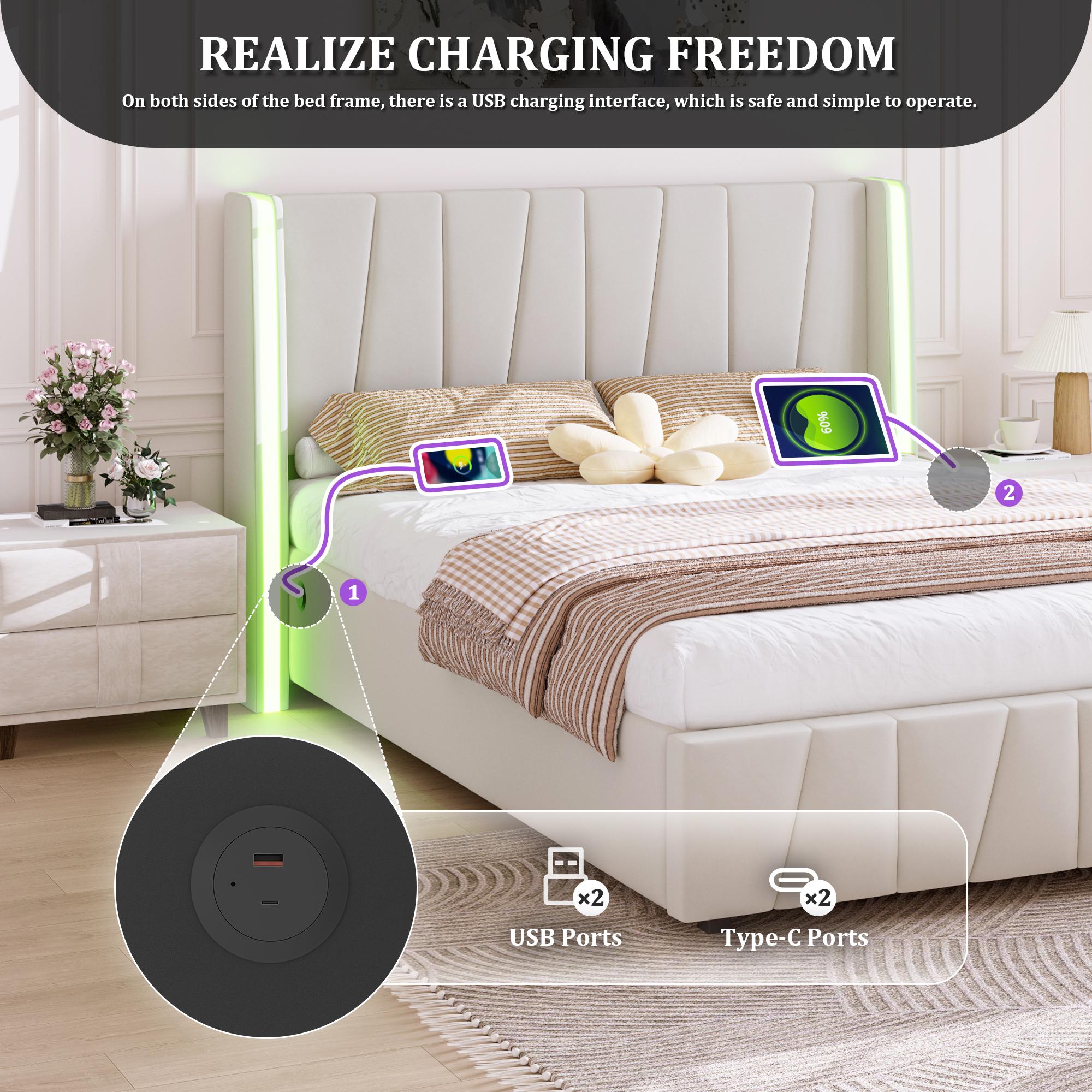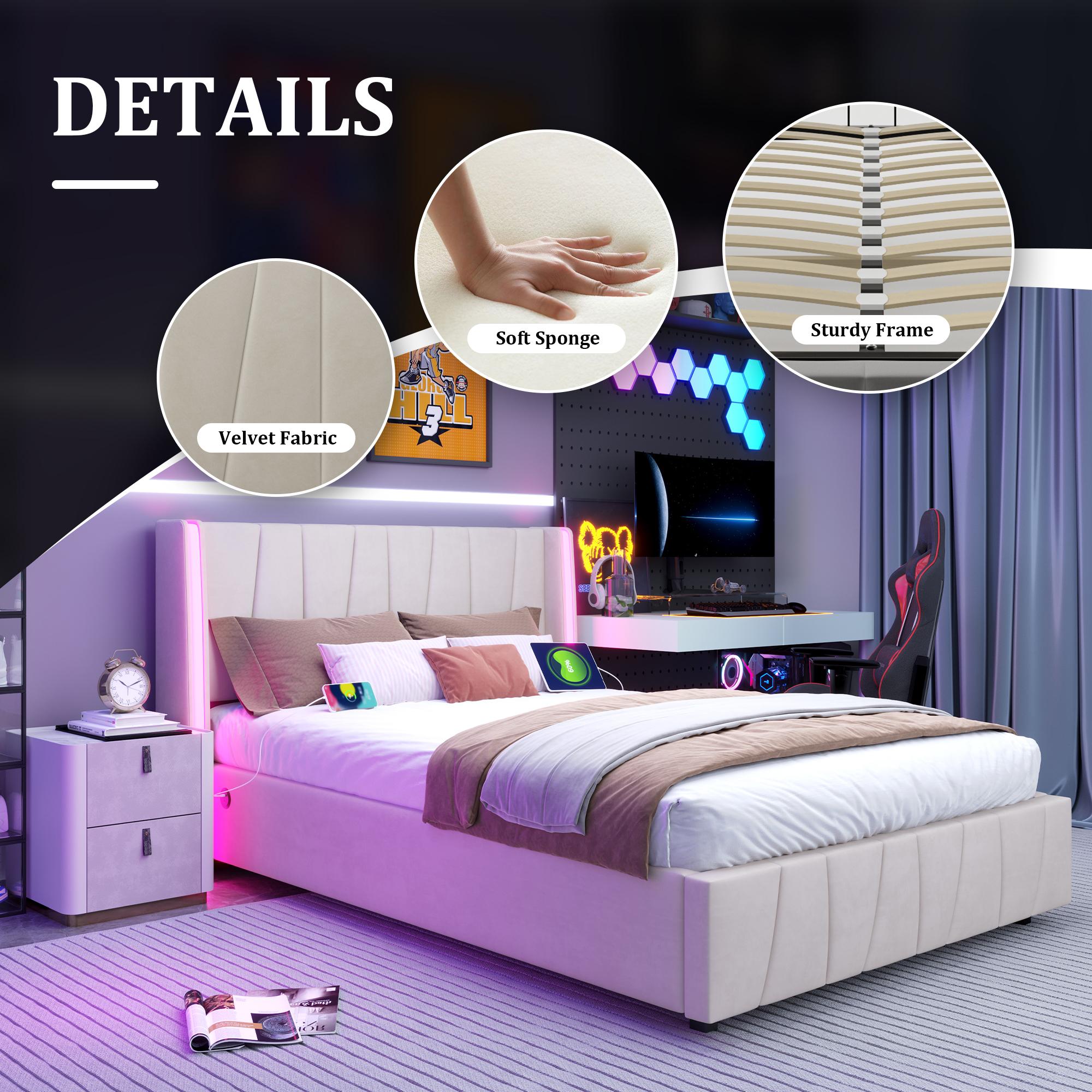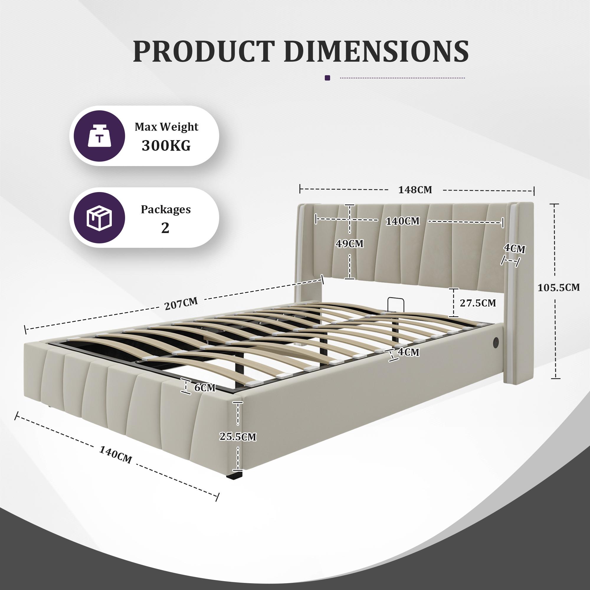 Lit coffre 140×200 cm - Lit rembourré en velours beige - avec tête de lit haute - LED et ports USB + Type‑C – Confort, style et praticité