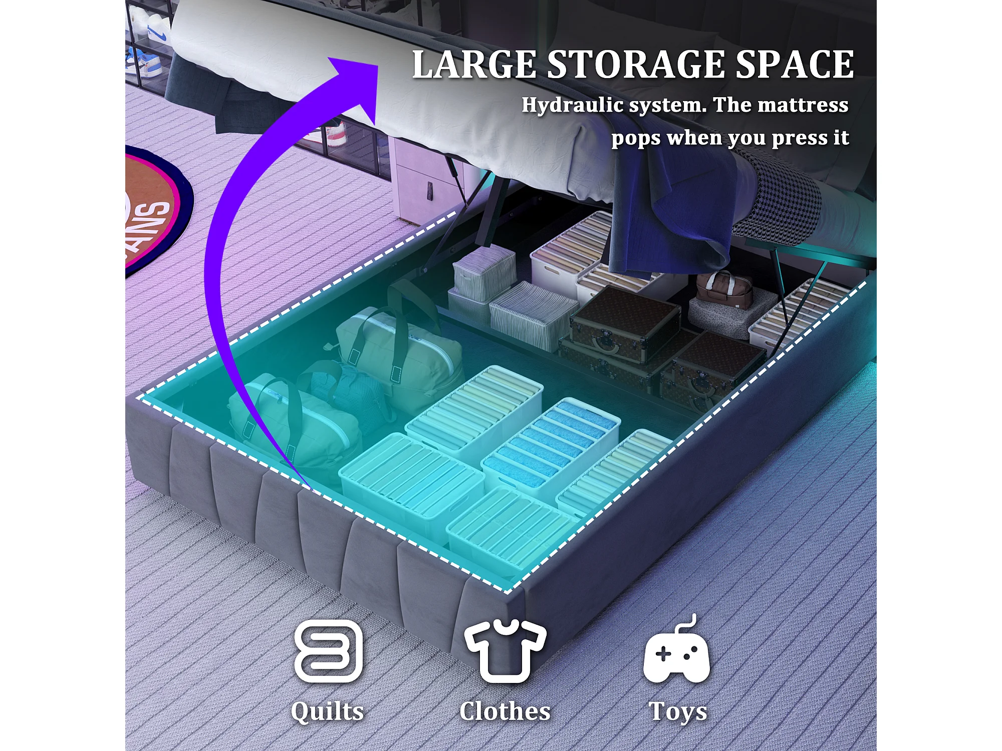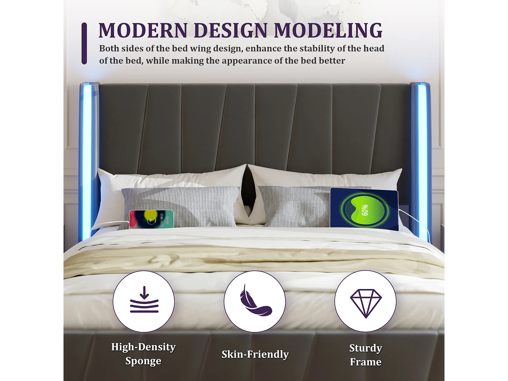 Lit coffre 160×200 cm - Lit rembourré en velours gris - avec tête de lit haute - LED et ports USB + Type‑C – Confort, style et praticité