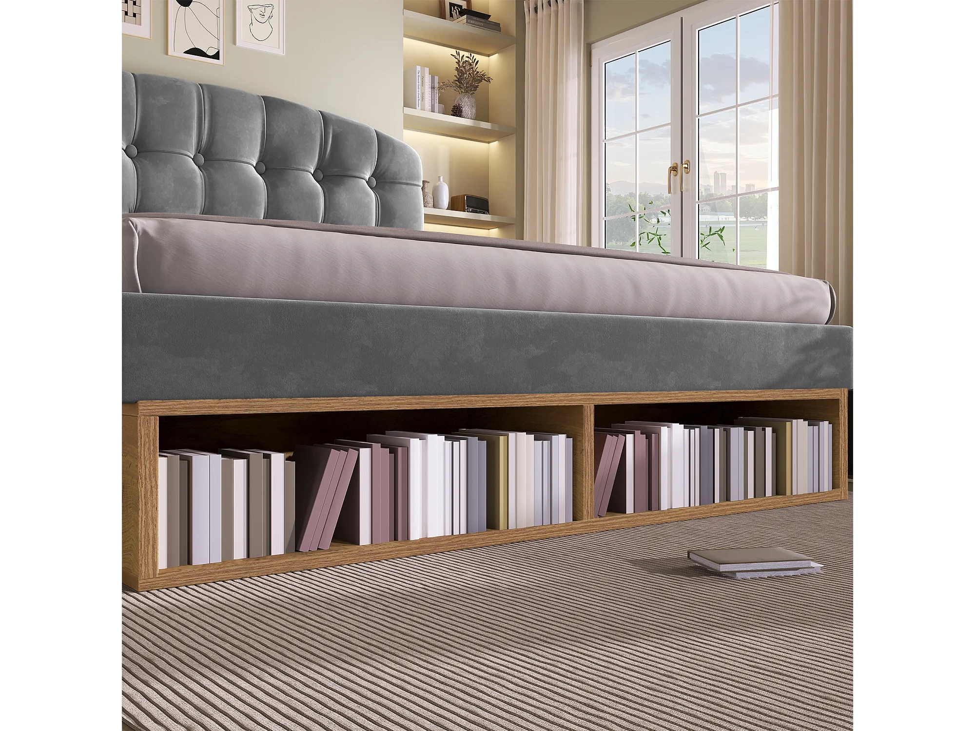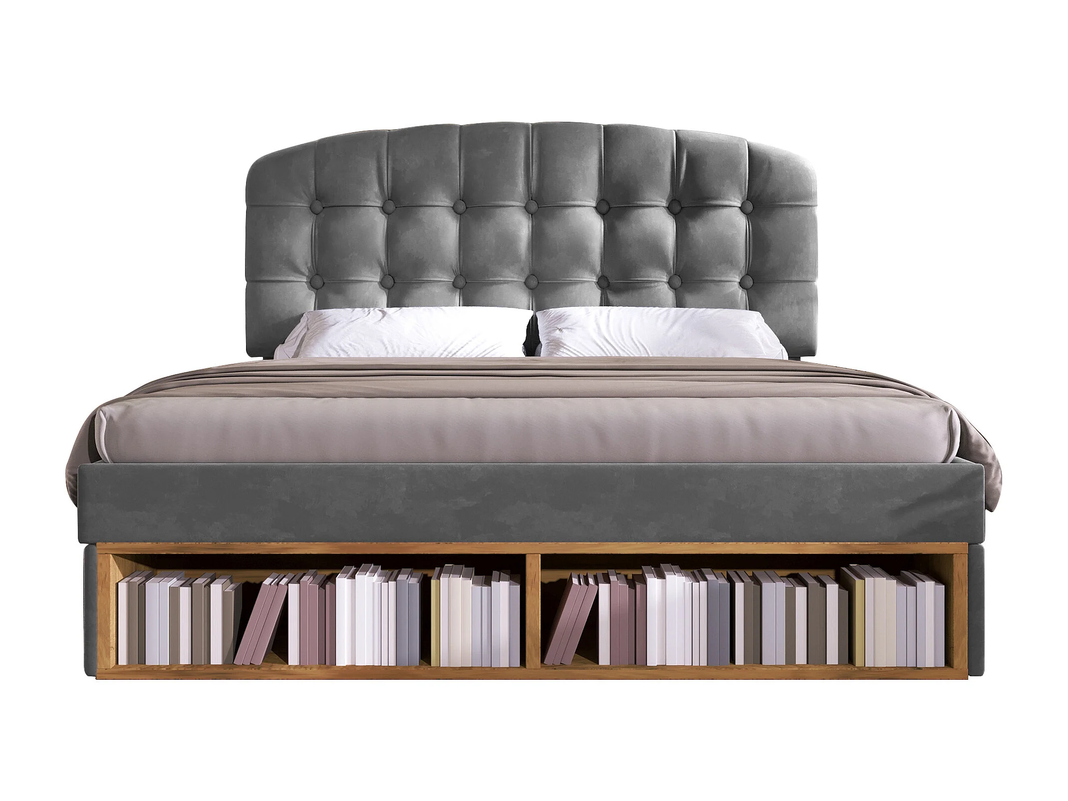 Lit coffre double - 140 x 190 cm - avec tête de lit réglable + tiroirs + étagères - velours - gris