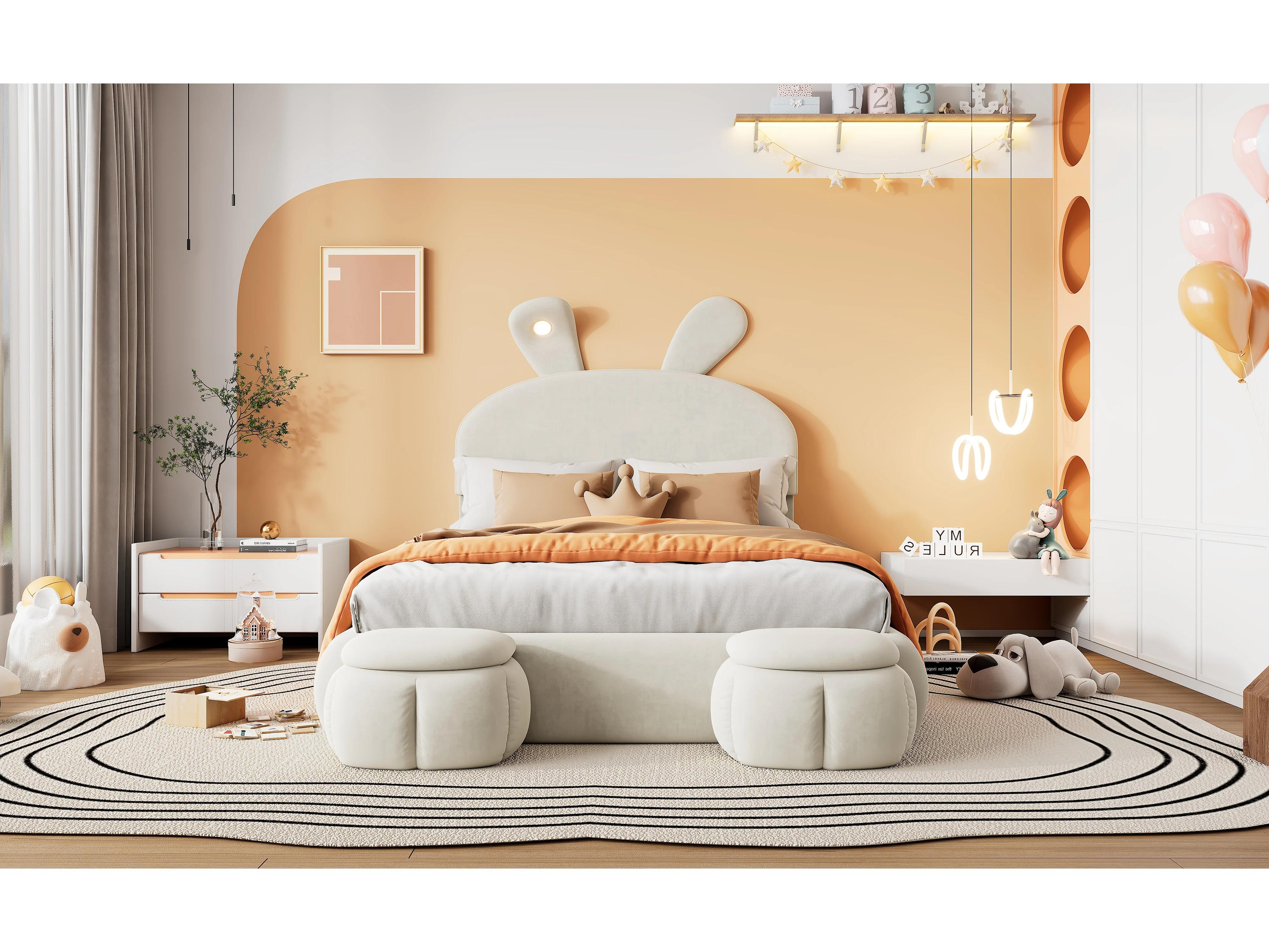 Lit coffre double - 140 x 200 cm - avec 2 tabourets de rangement - oreilles de lapin avec LEDs - Velours - beige