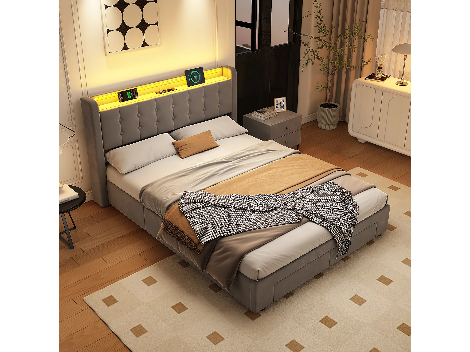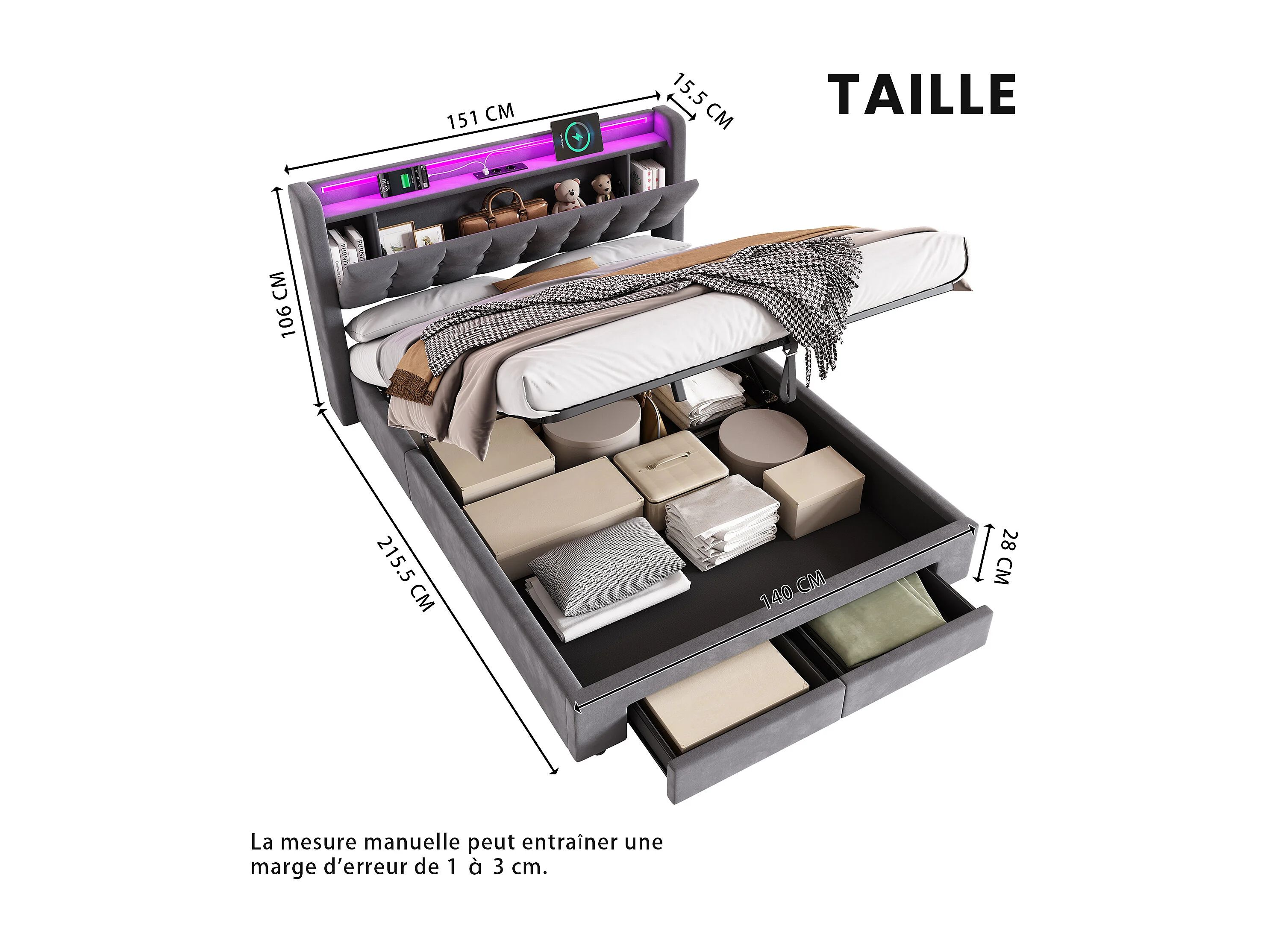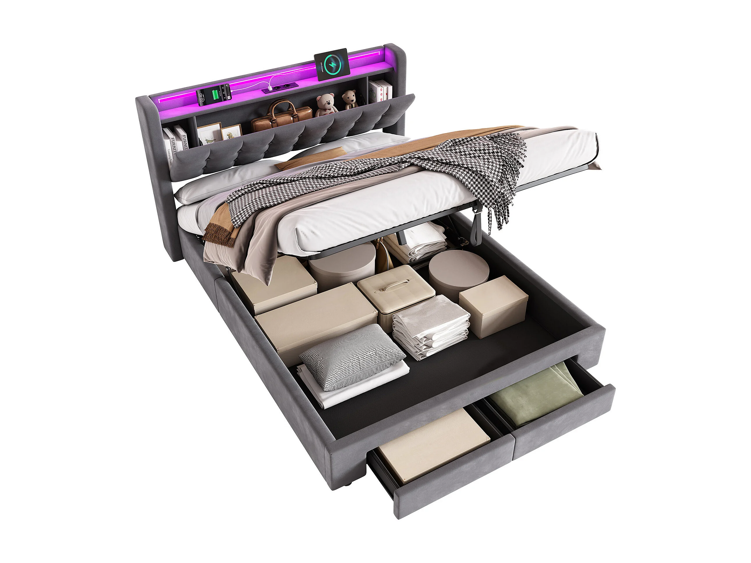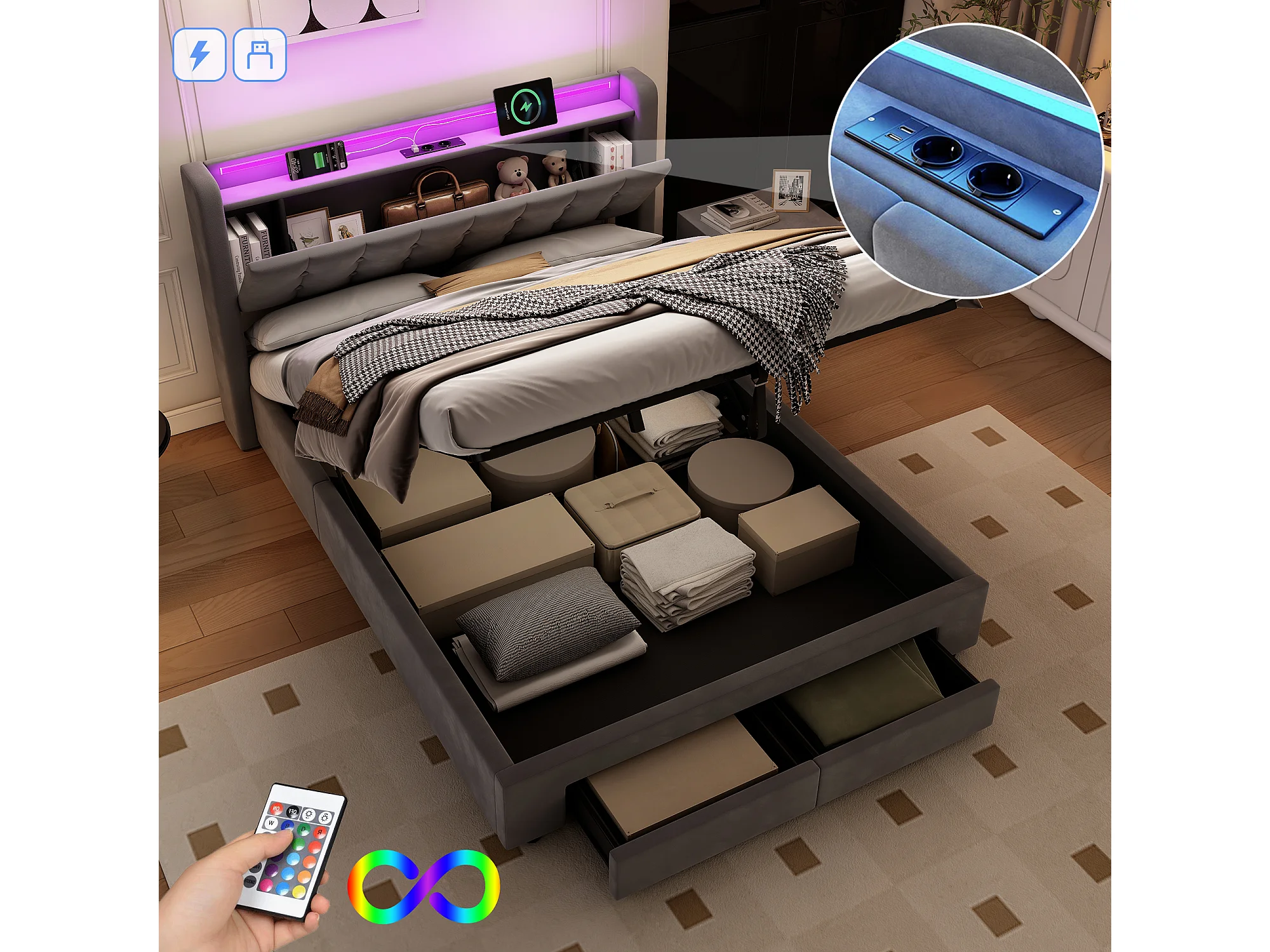 Lit coffre double 140x200cm avec 2 tiroirs, prise et tête de lit de rangement -Velours hollandais - Gris