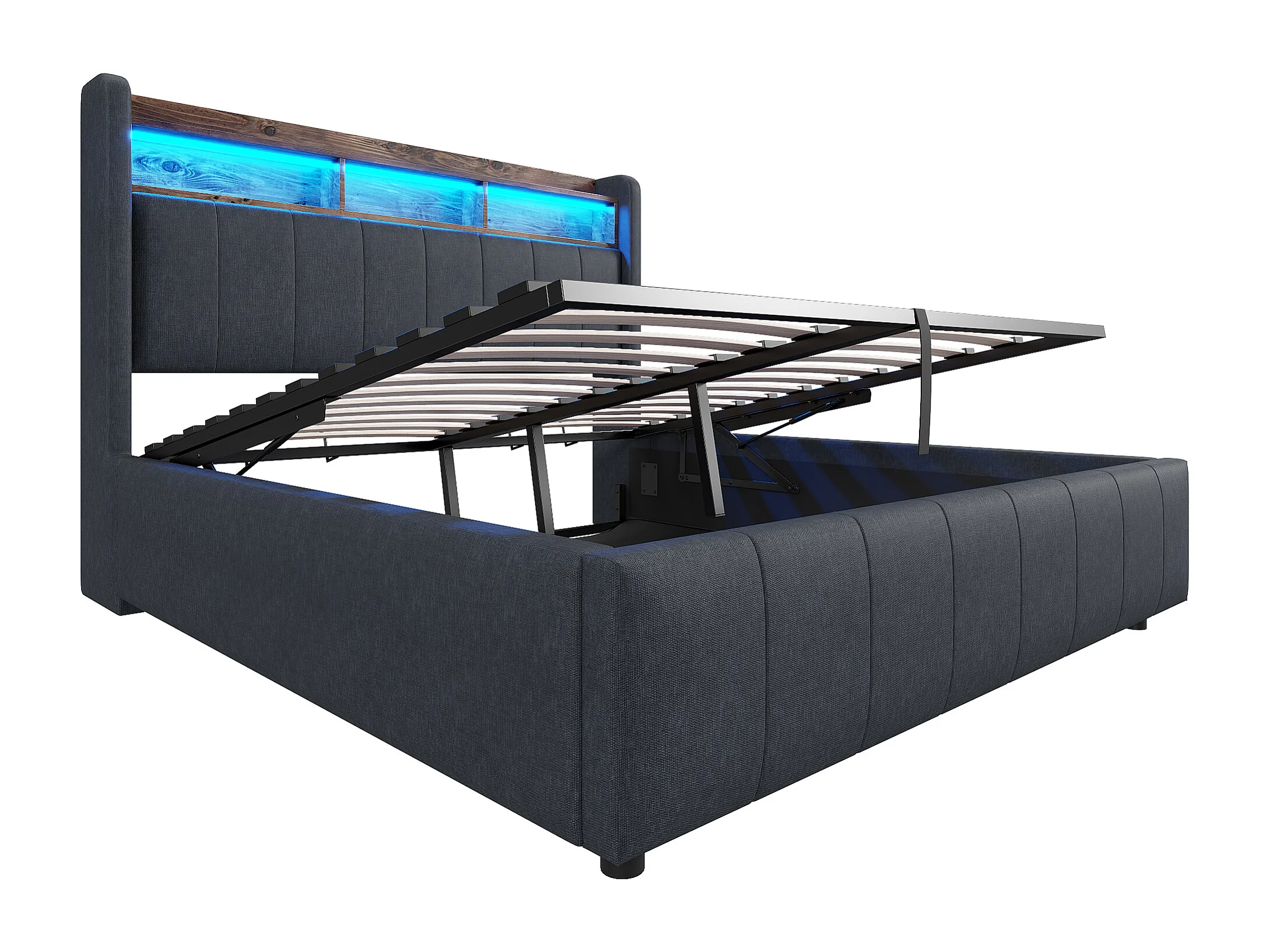 Lit coffre double 140x200cm, LED et prise USB, étagères, rangement, tissu en fond, Lin gris, sans matelas