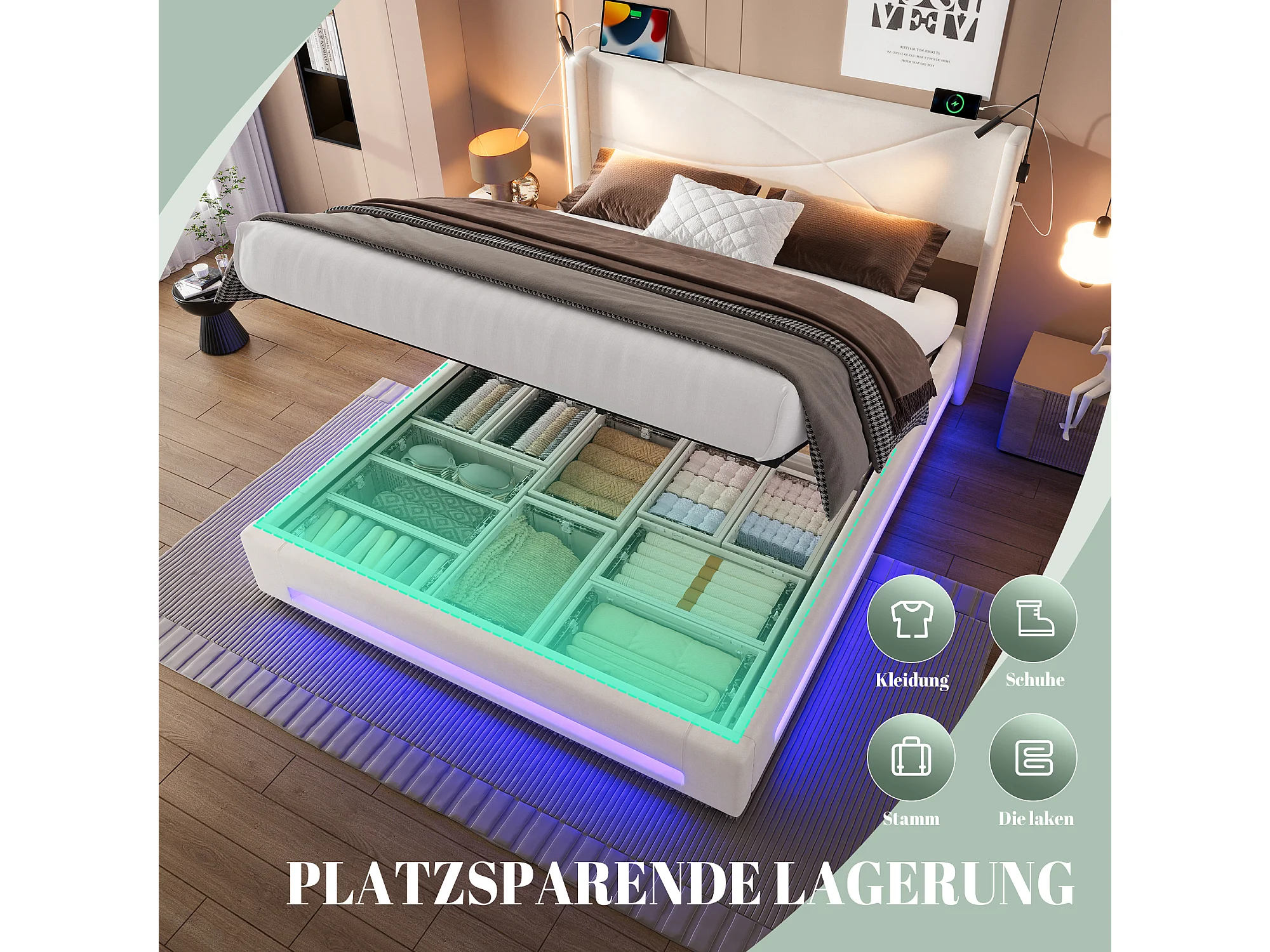 Lit coffre double - 160 x 200 cm - avec 2 lampes de lecture + Leds + rangement hydraulique + USB - velours - beige