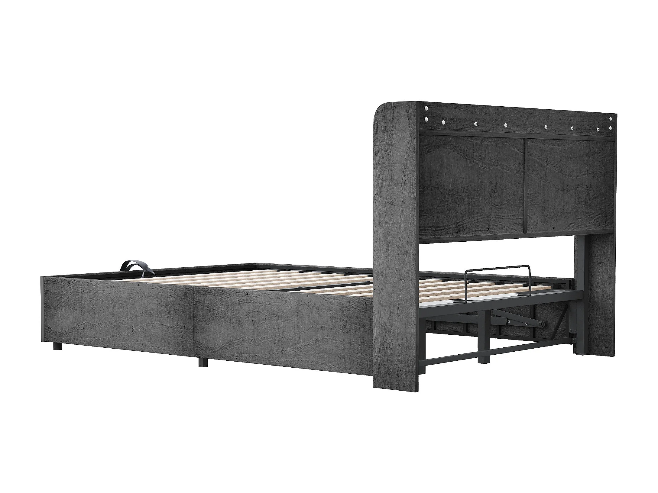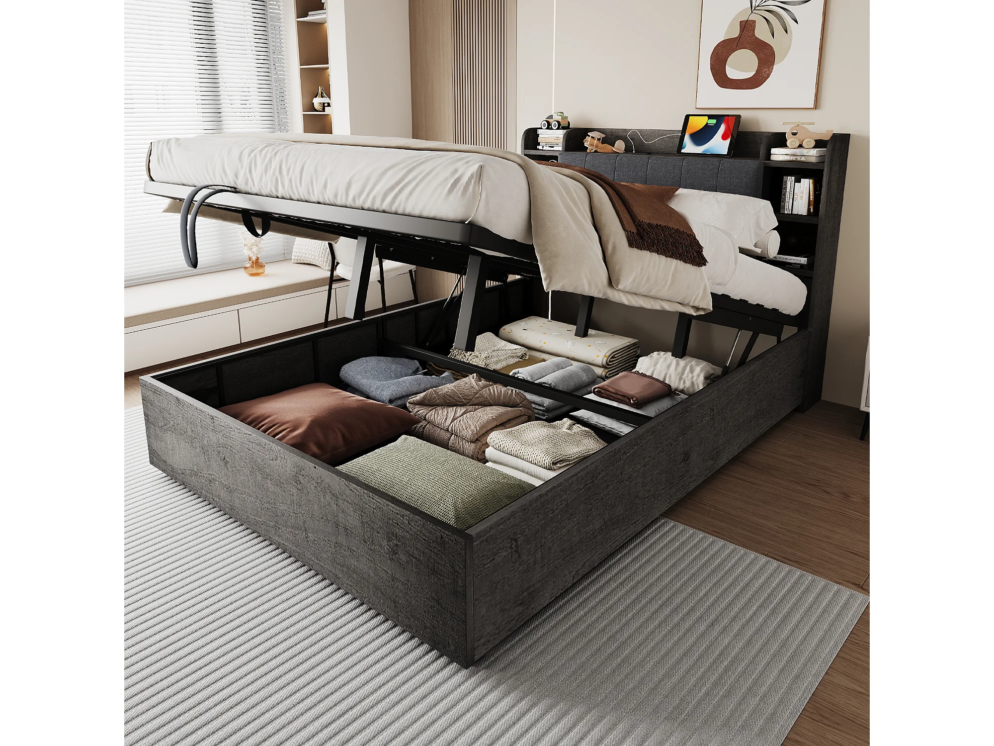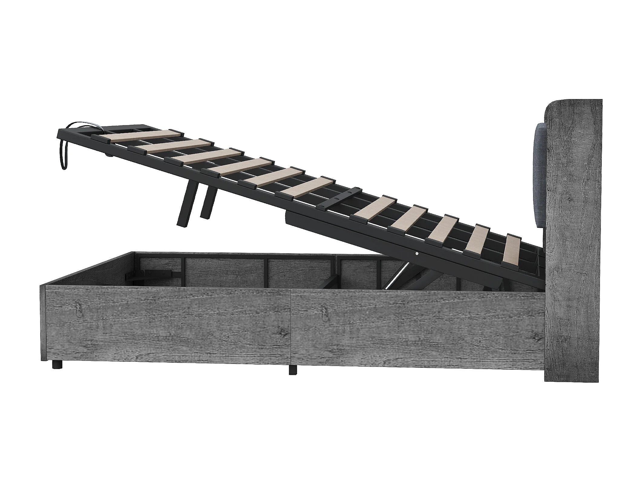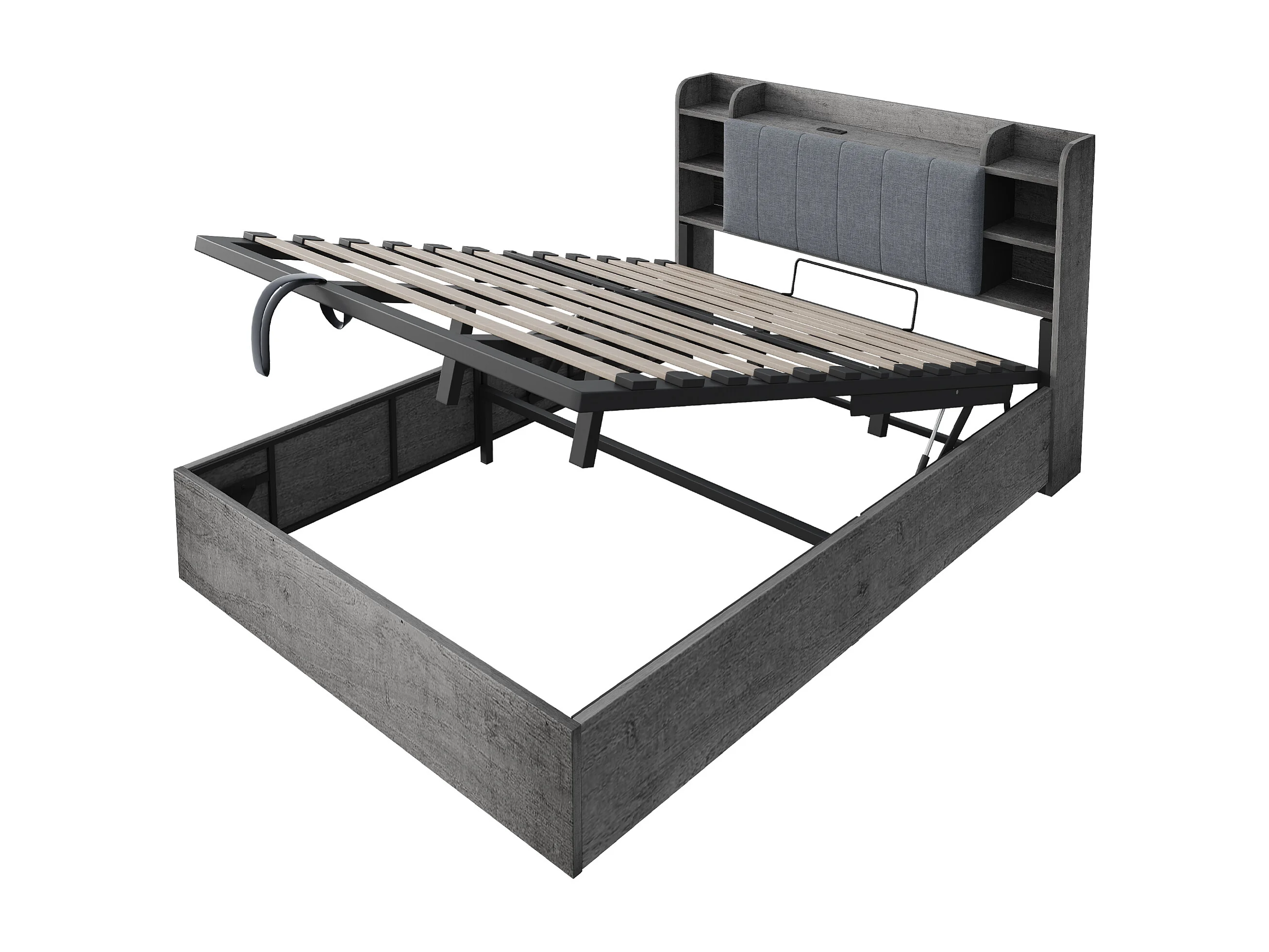 Lit coffre double - 180 x 200 cm - avec rangement hydraulique + tête de lit + USB - MDF - gris