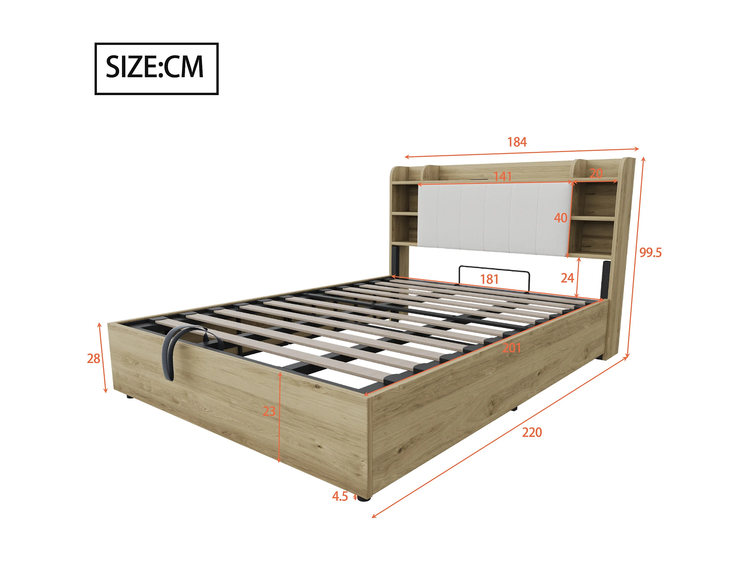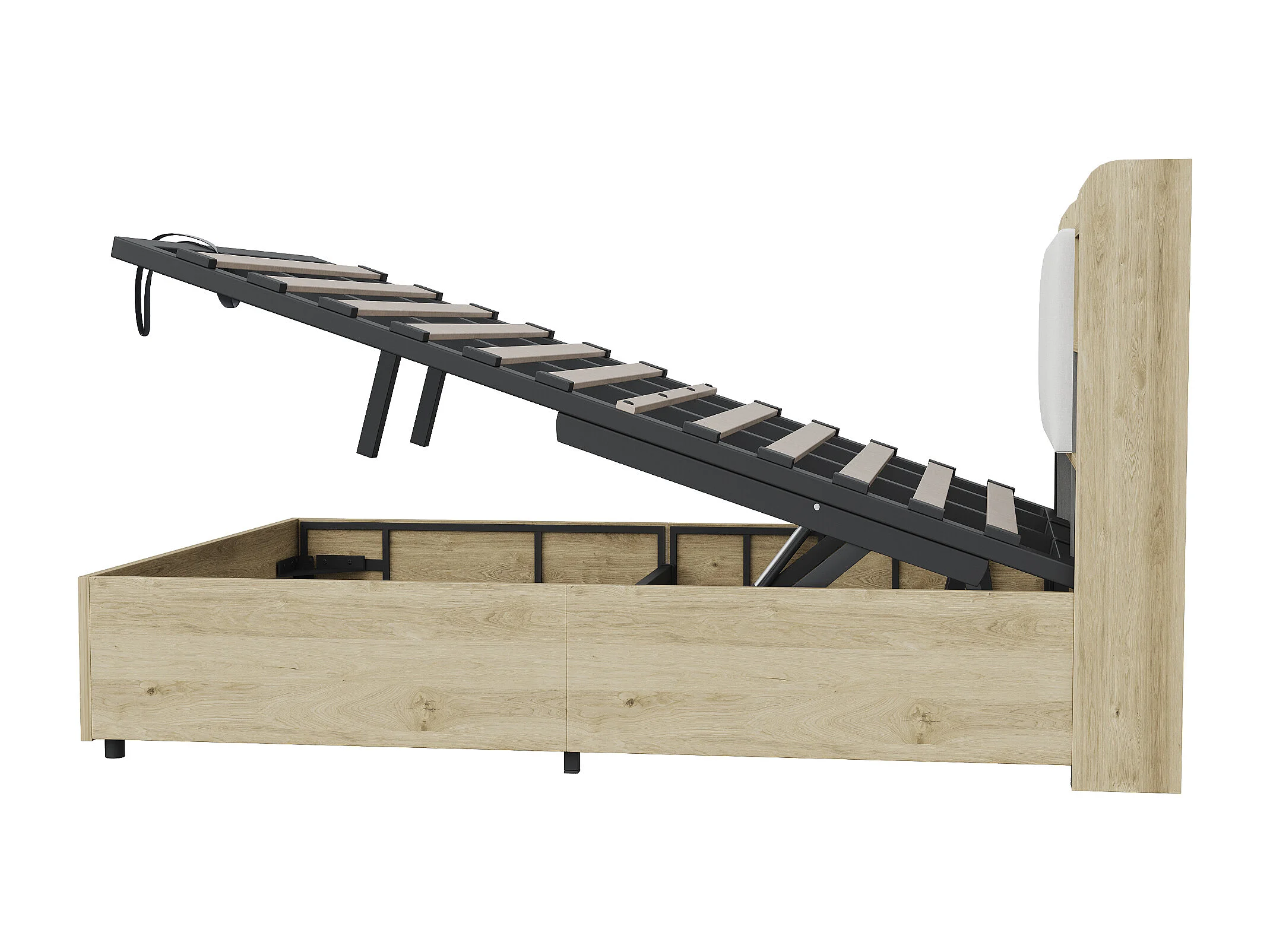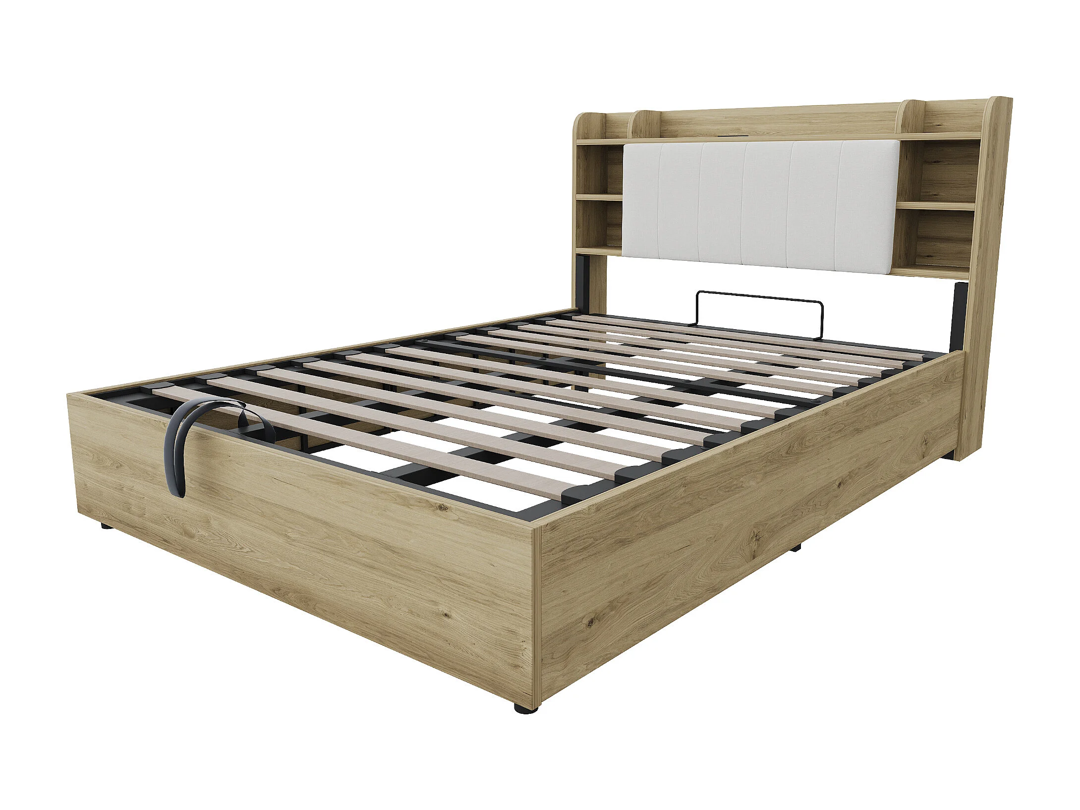 Lit coffre double - 180 x 200 cm - avec rangement hydraulique + tête de lit + USB - MDF - naturel