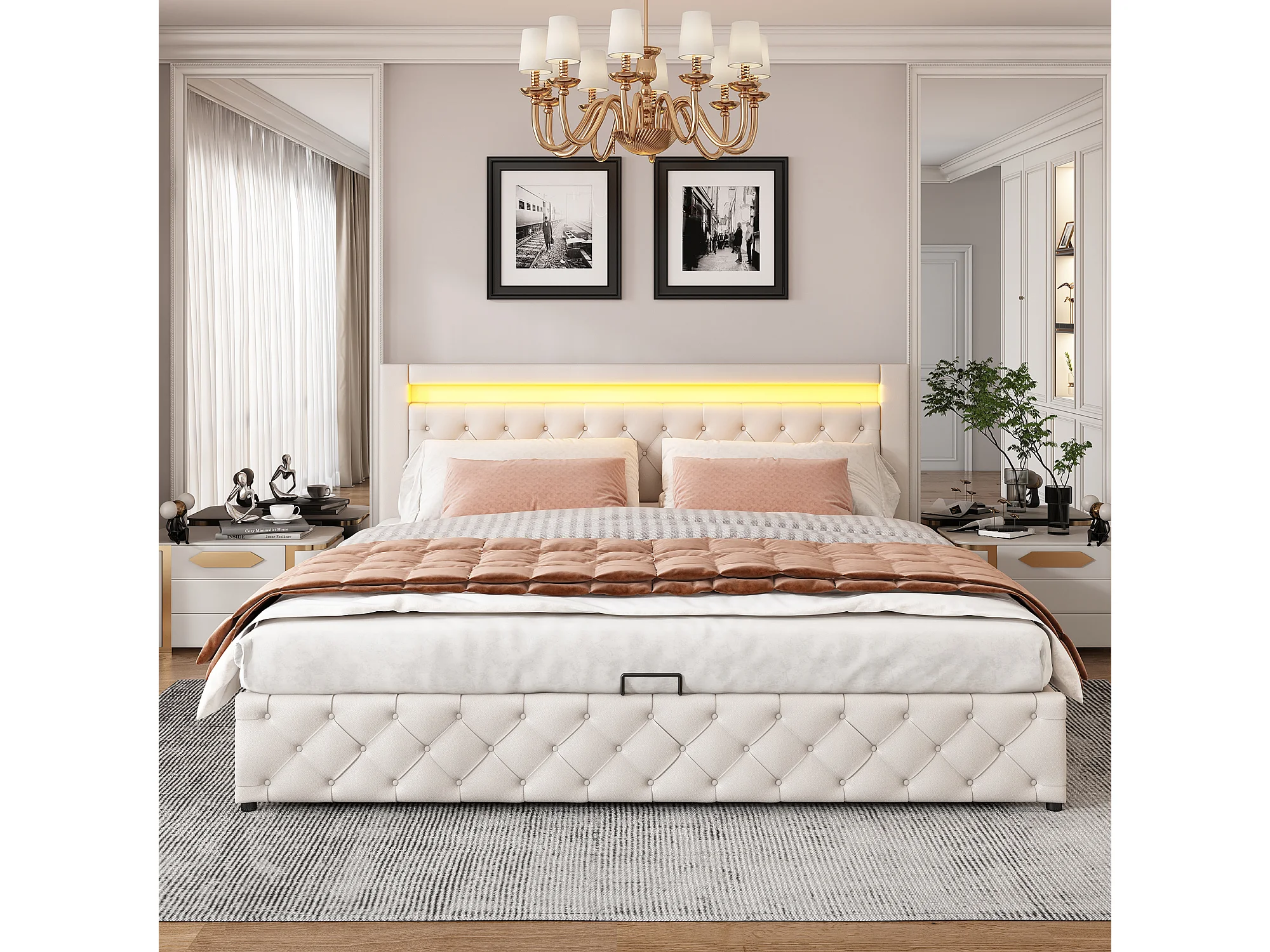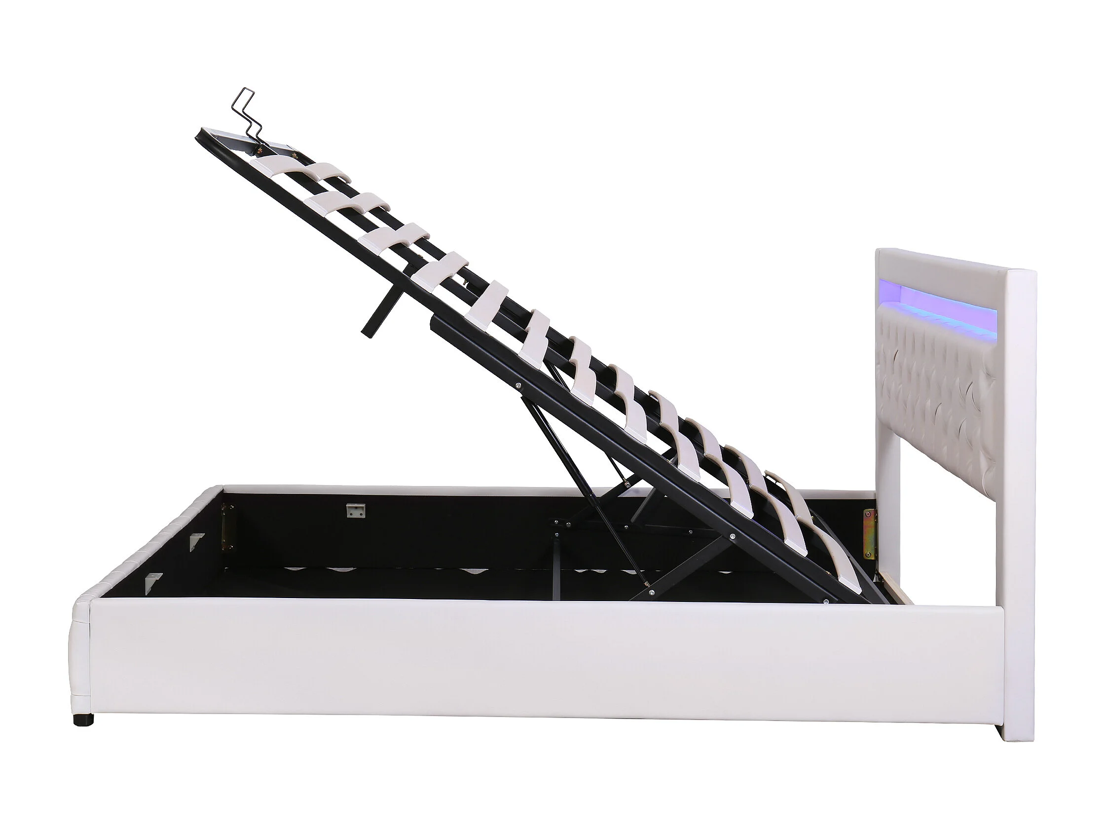 Lit coffre double 180x200cm, espace de rangement, LED, tissu en fond, en PU blanc, sans matelas