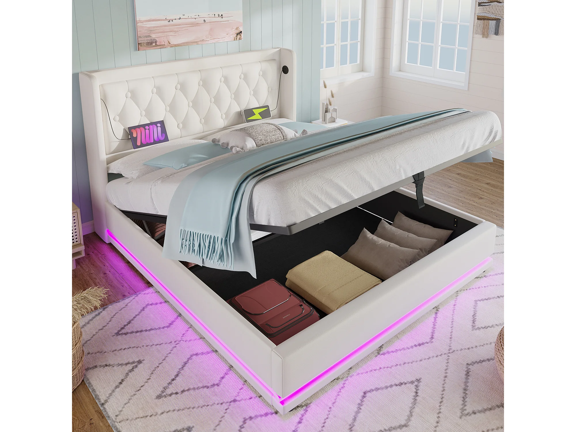Lit coffre double capitonné - 180 x 200 cm - avec tête de lit + USB + Leds + rangement hydraulique - Coton - blanc