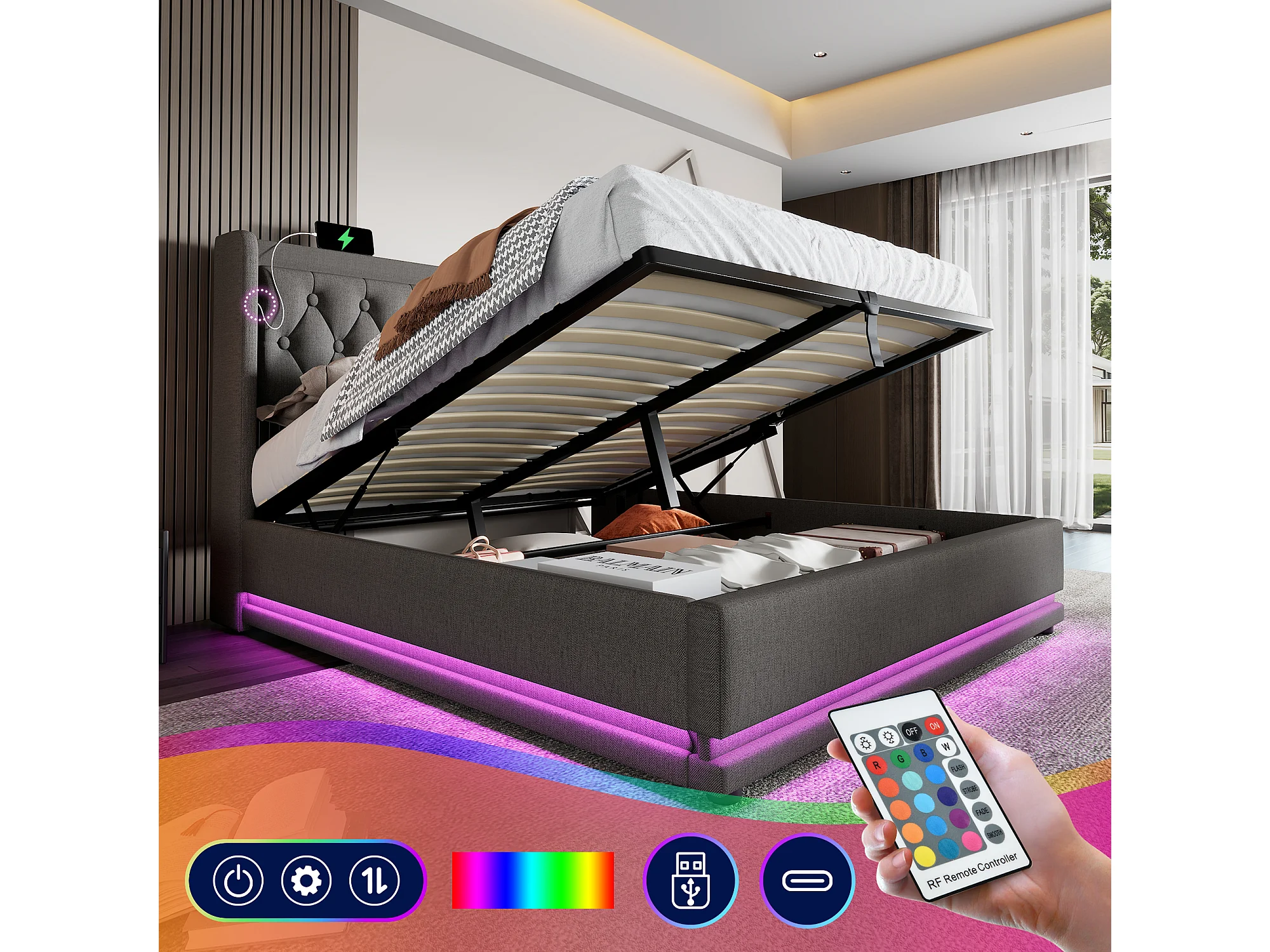 Lit coffre double capitonné - 180 x 200 cm - avec tête de lit + USB + Leds + rangement hydraulique - Coton - gris