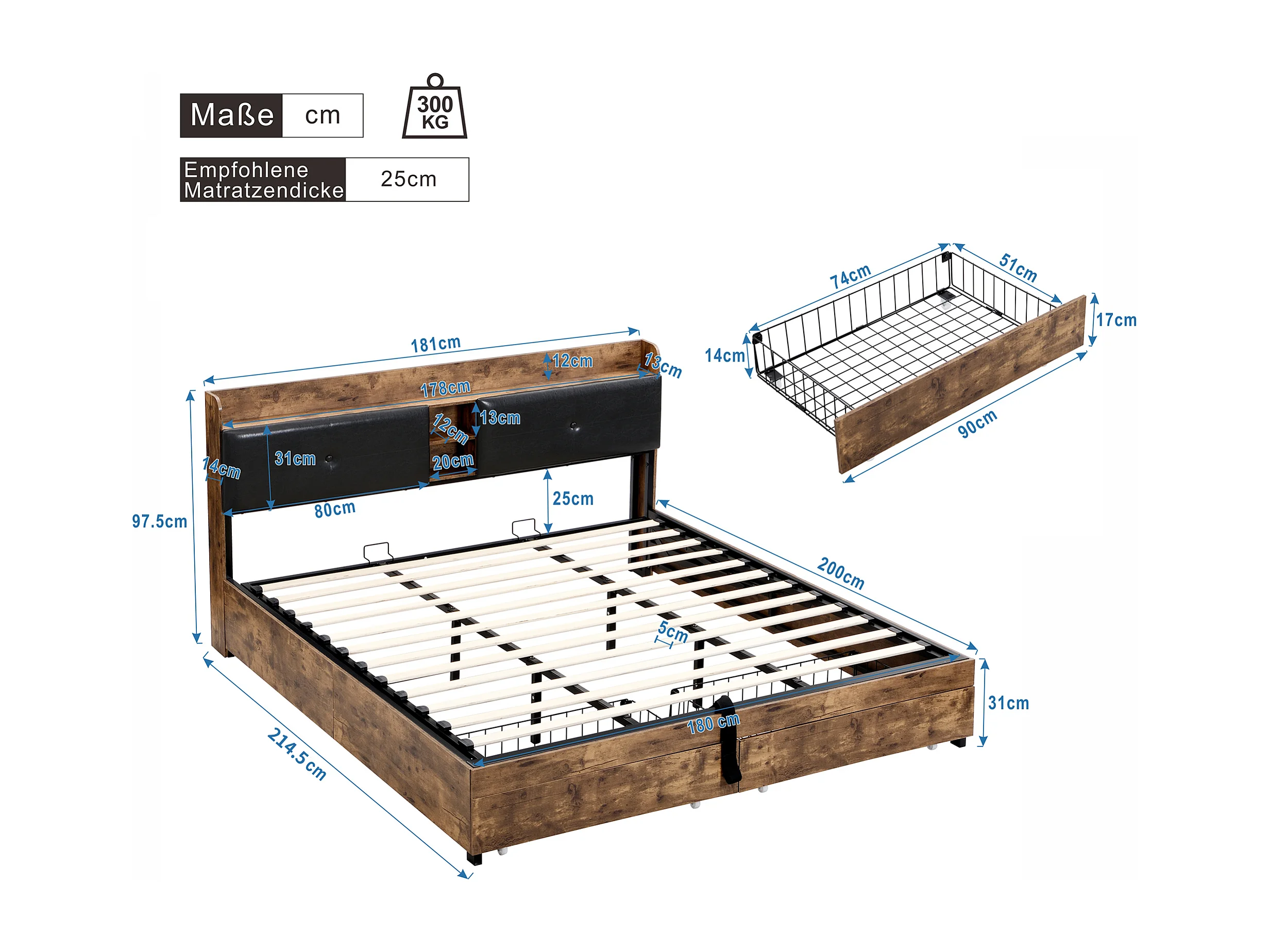 Lit coffre adulte en métal 180x200 cm avec tête de lit et sommier à lattes en métal, Bois + Noir (sans matelas)