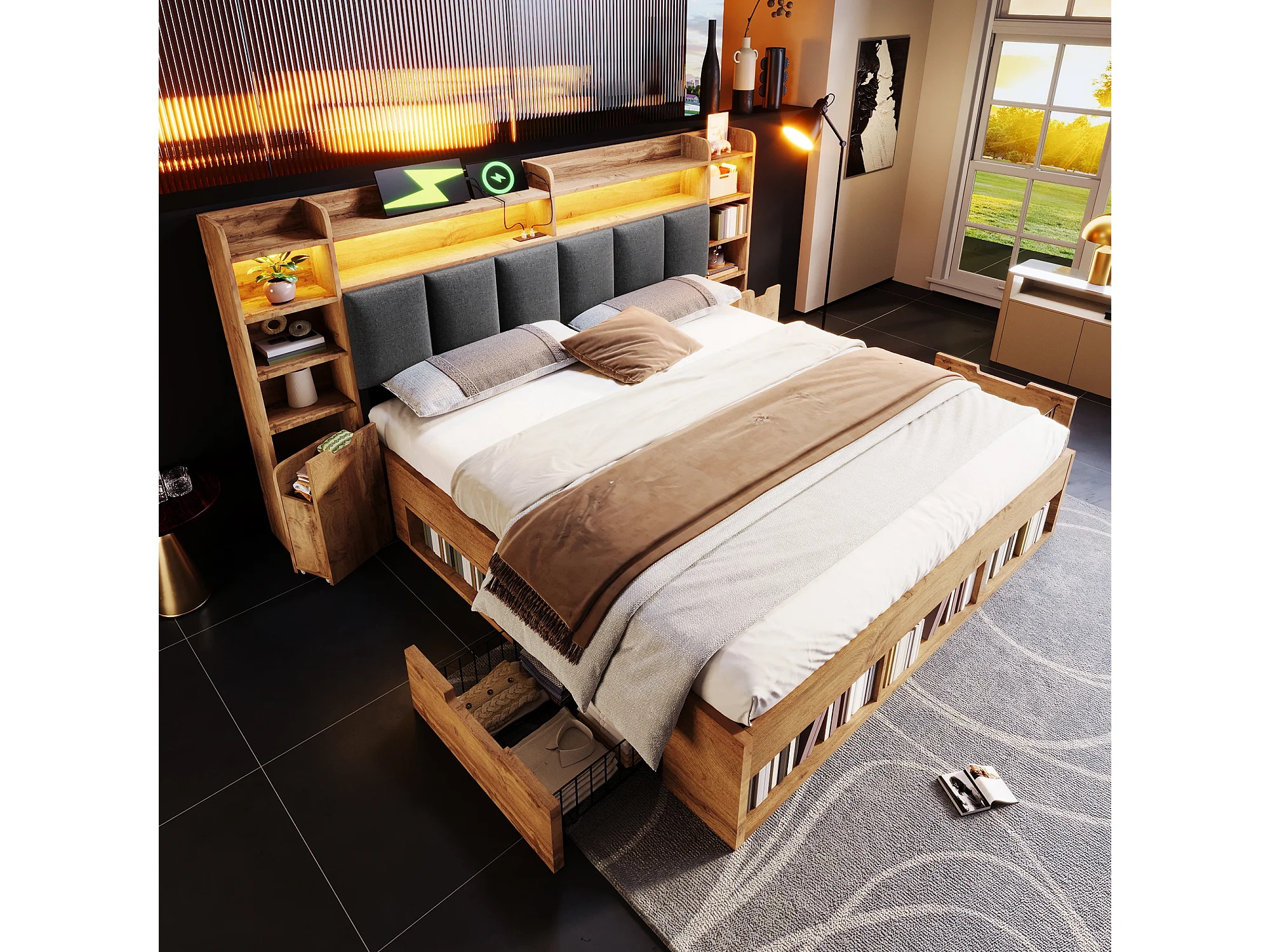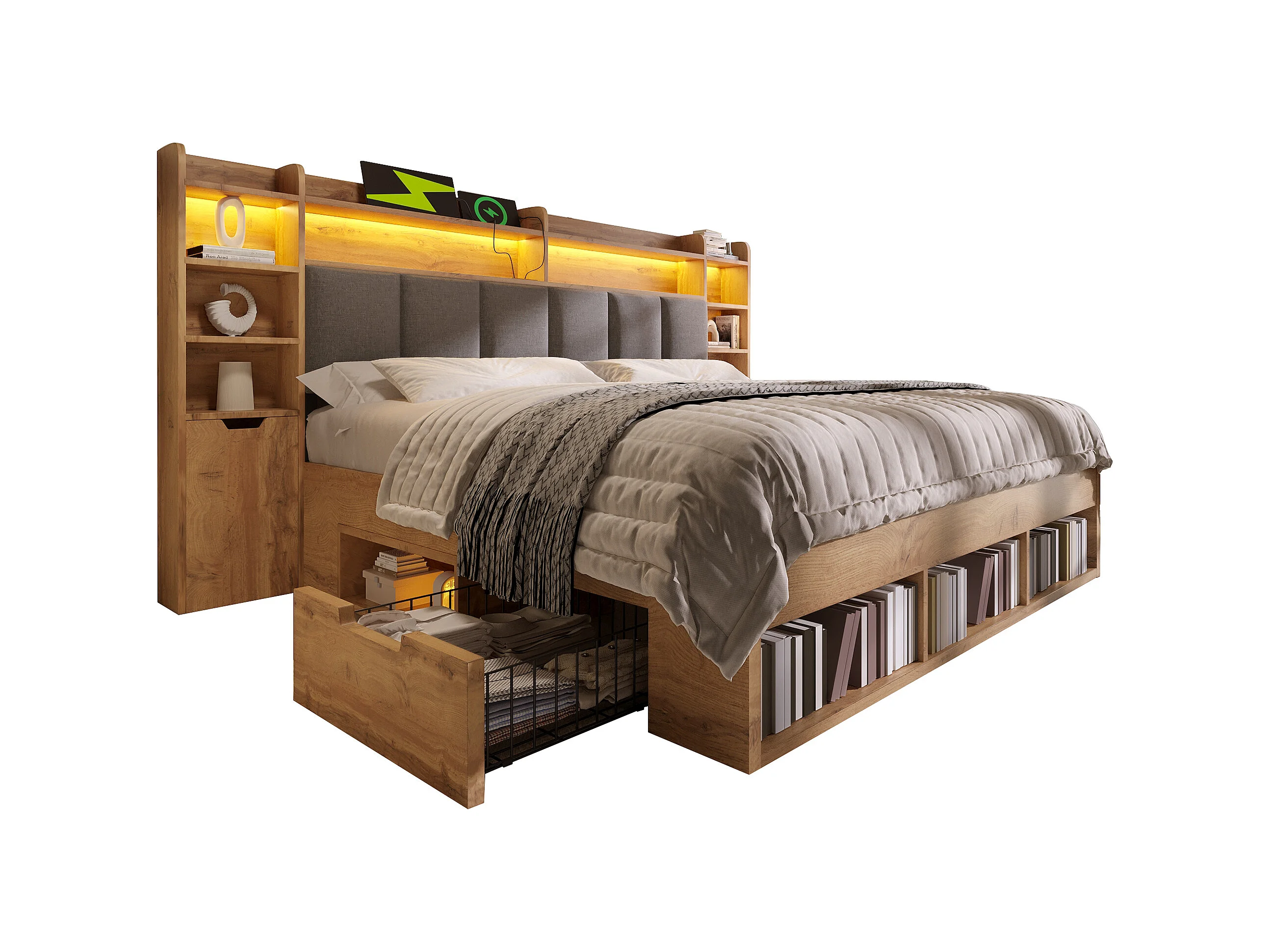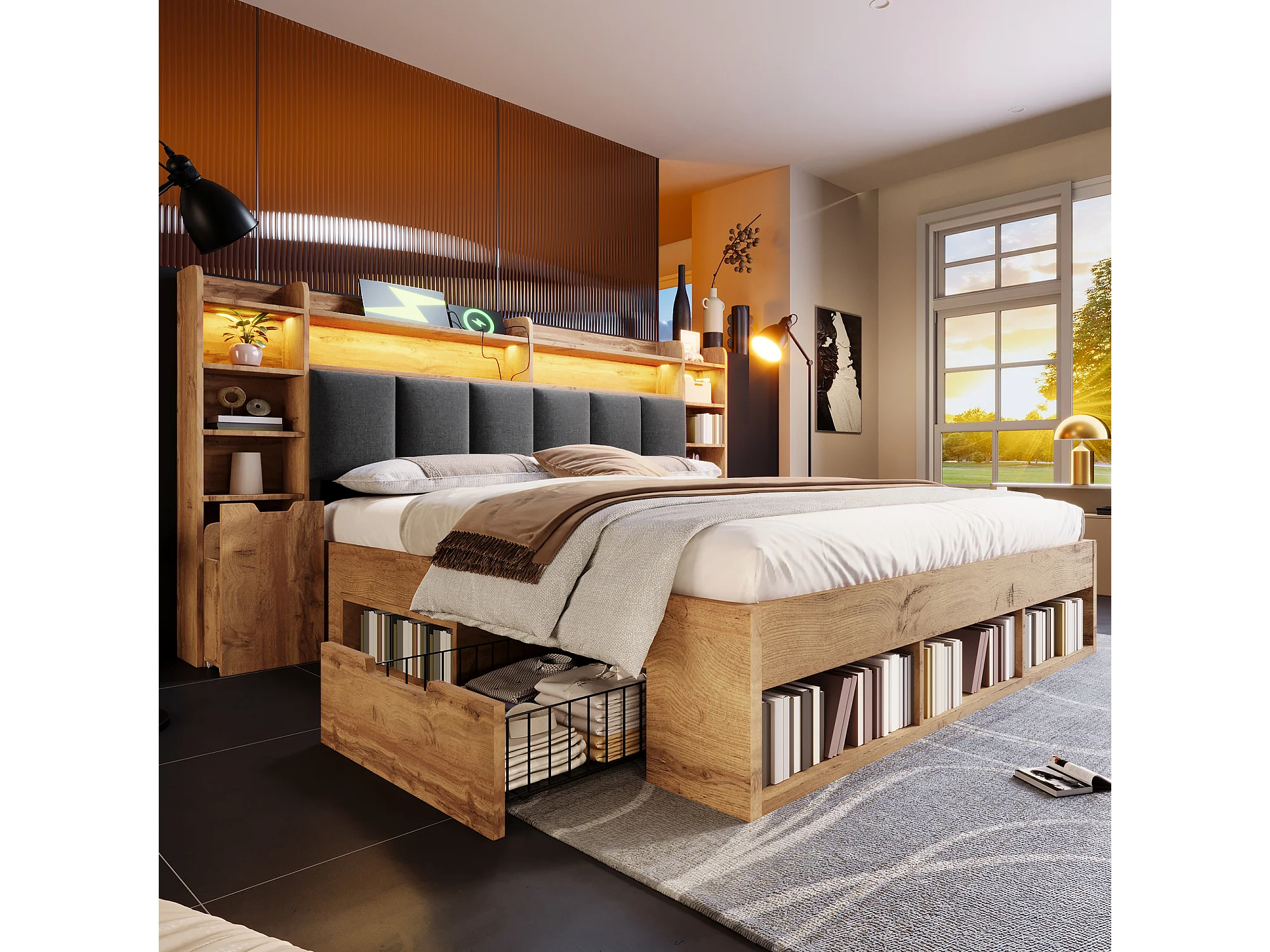 Lit coffre double finition chêne - 180 x 200 cm - avec tête de lit + Leds + tables de chevet + tiroirs - bois - naturel