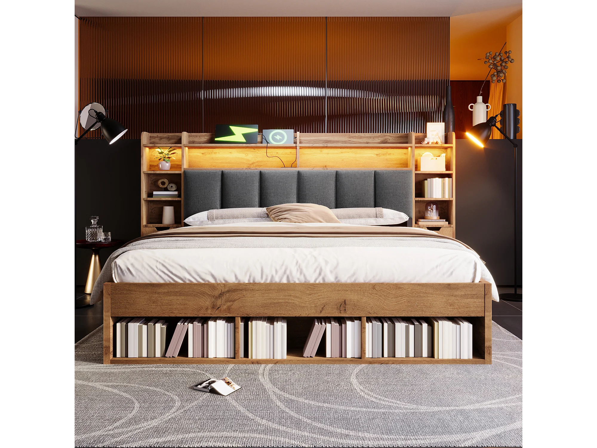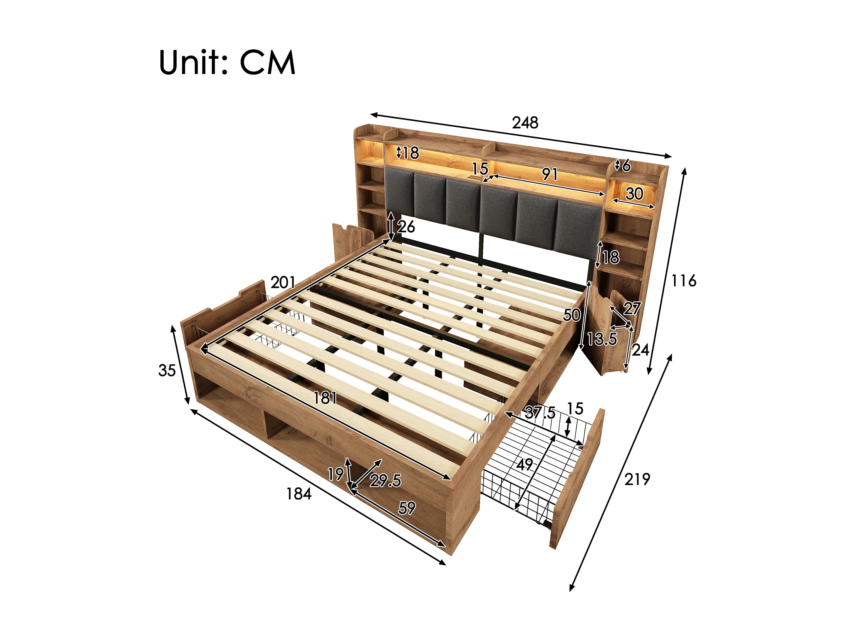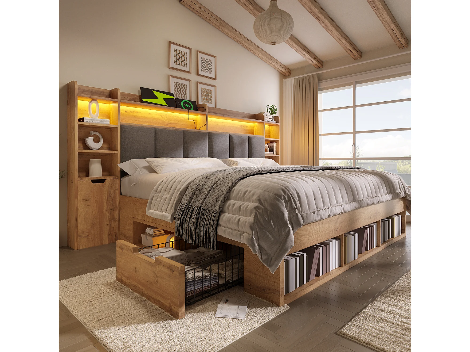 Lit coffre double finition chêne - 180 x 200 cm - avec tête de lit + Leds + tables de chevet + tiroirs - bois - naturel