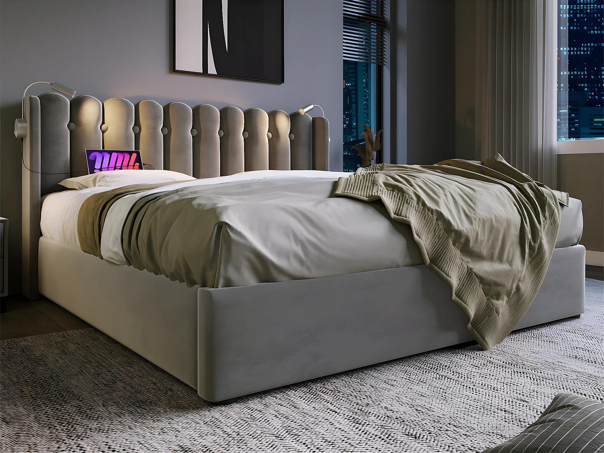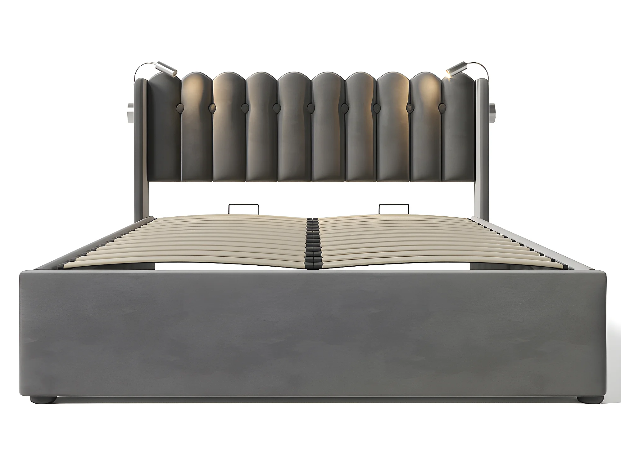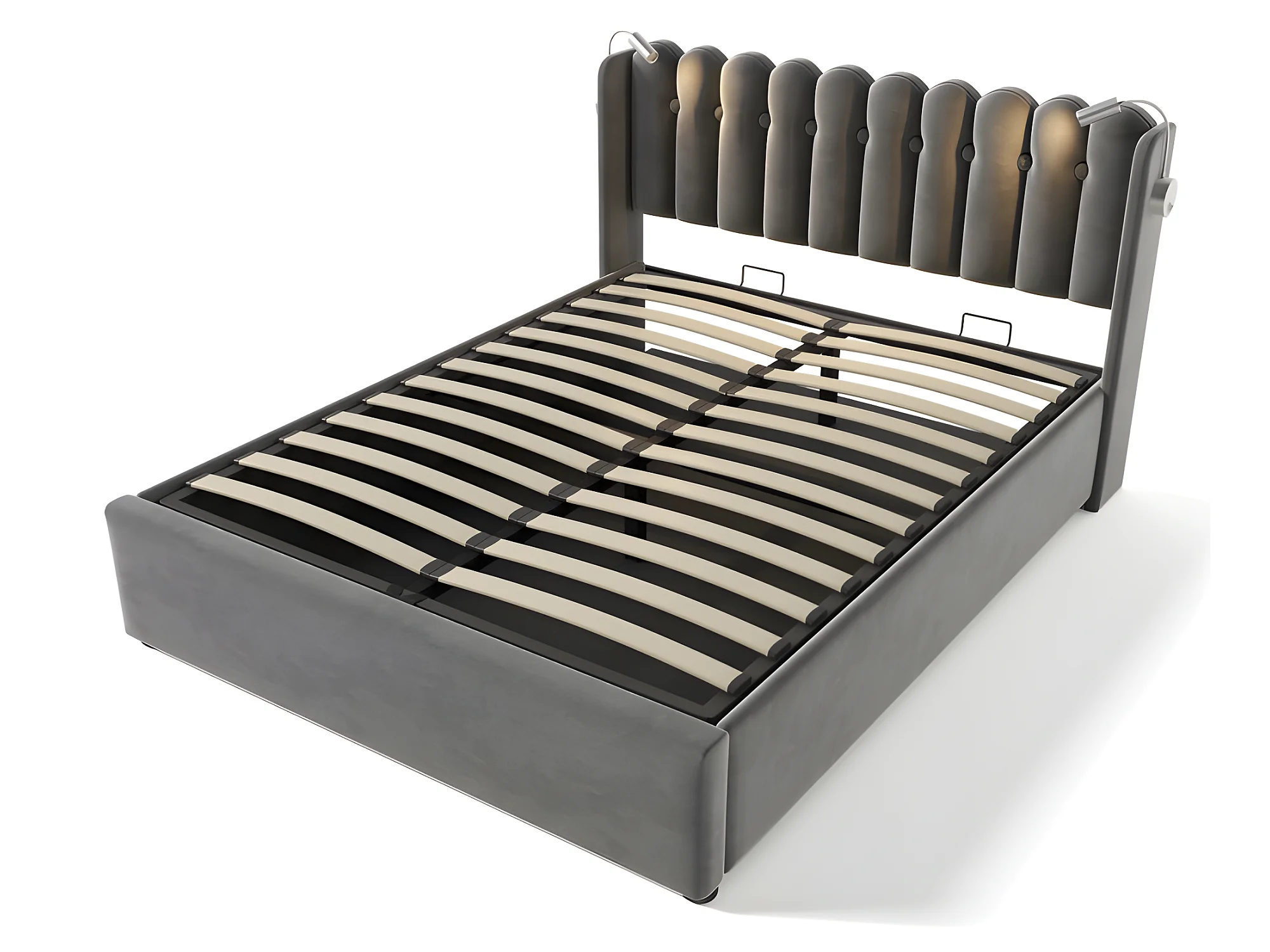 Lit coffre capitonné 160x200cm avec LED et Ports de chargement USB - Tissu en Velours - avec sommier à lattes - Gris