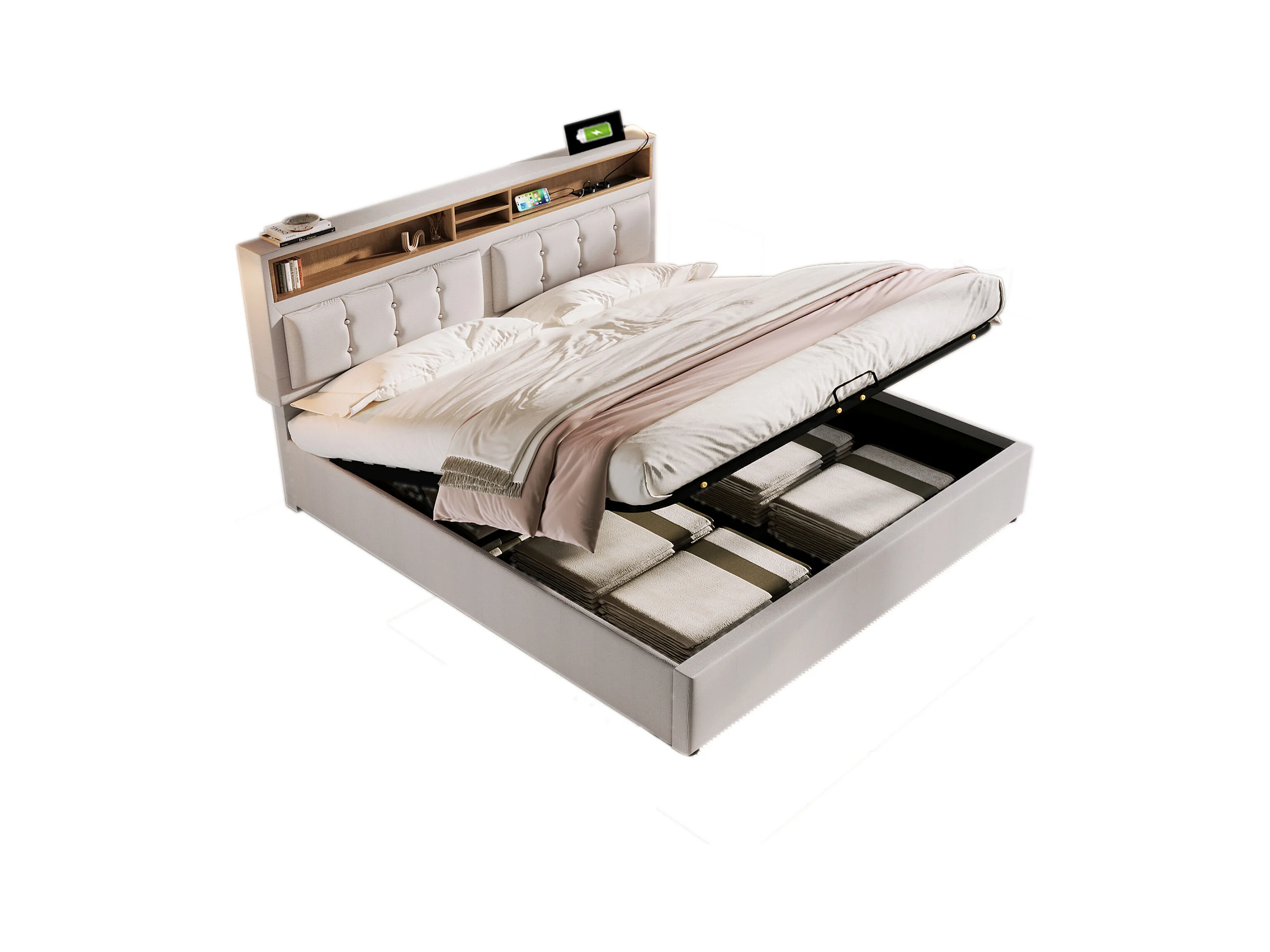 Lit coffre 140x200 cm en tissu lin - tête de lit réglable avec prises - avec sommier à lattes - Beige