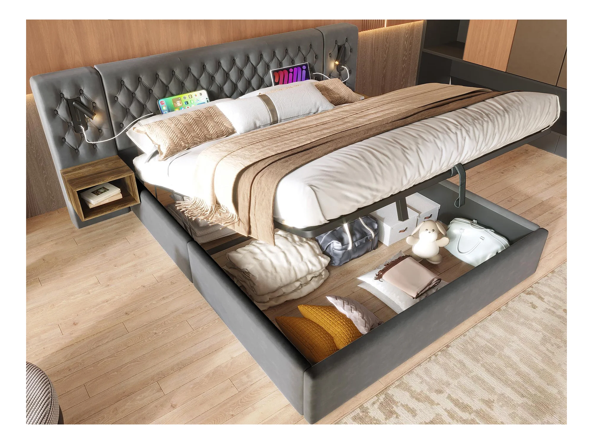 Lit coffre en velours 160x200 cm - 2 chevets + 2 liseuses avec prise USB - Gris (matelas non inclus)