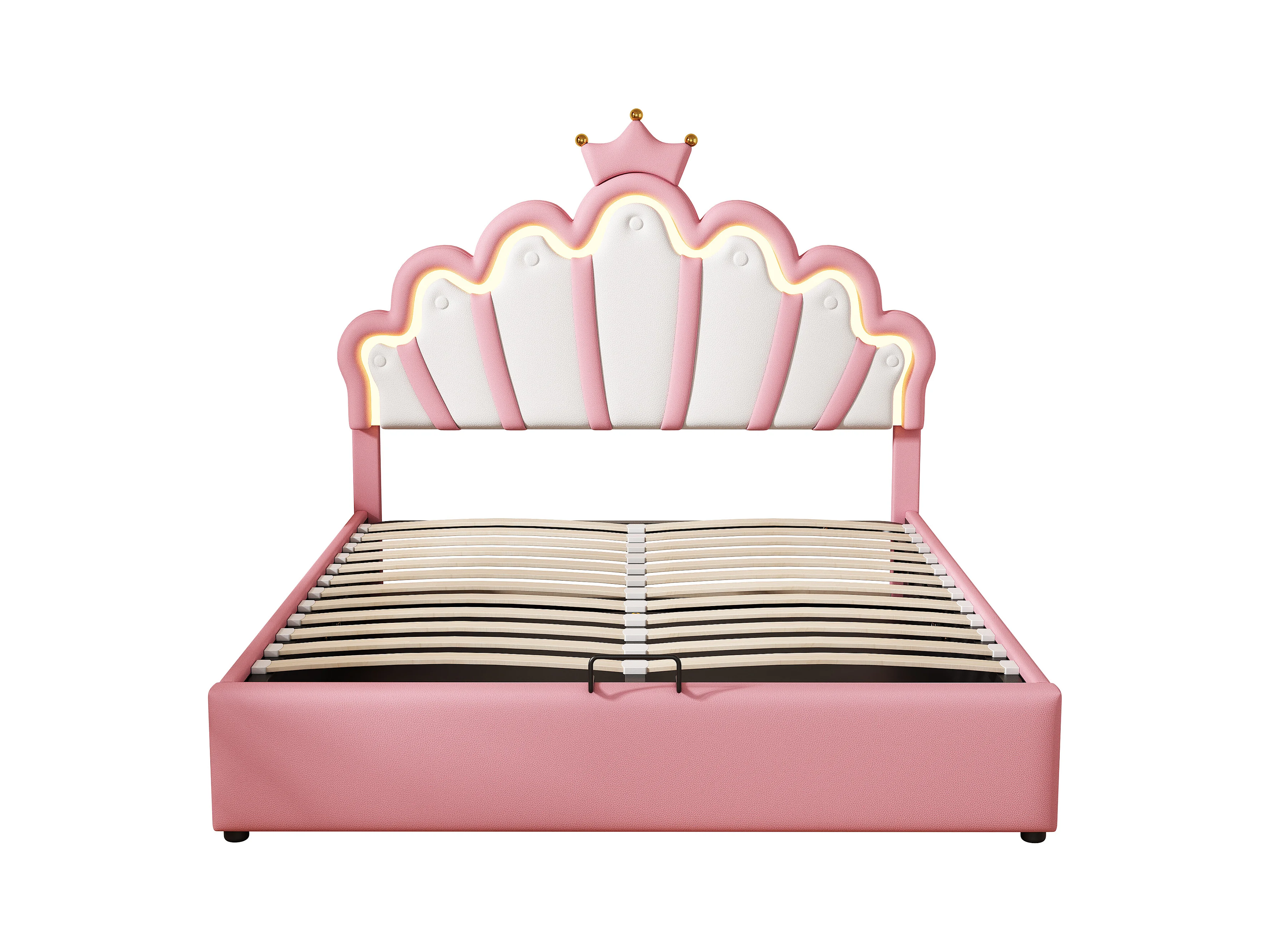 Lit coffre enfant 140x200cm avec LED et tête de lit en forme de couronne, lit princesse en PU rose, sans matelas