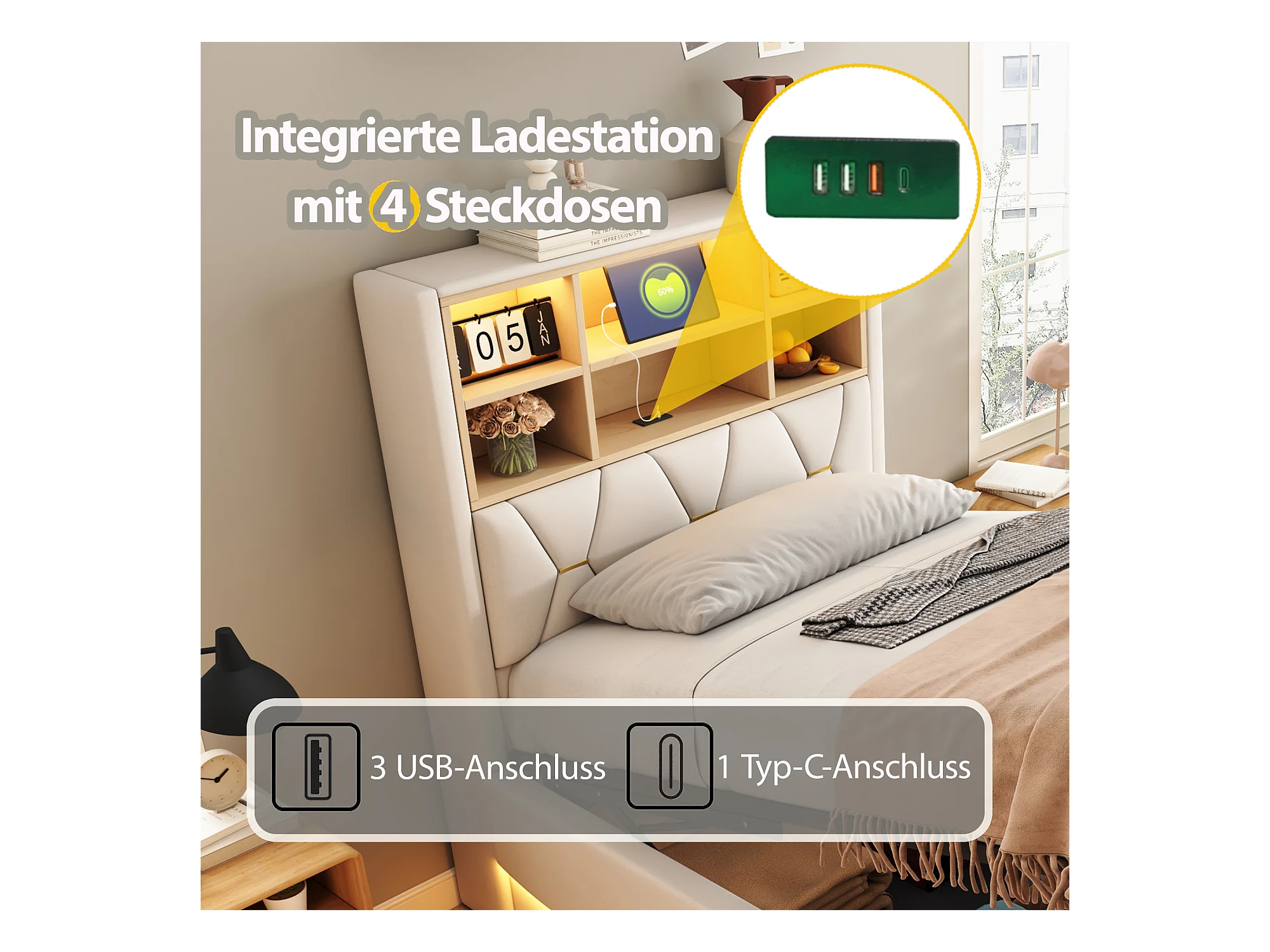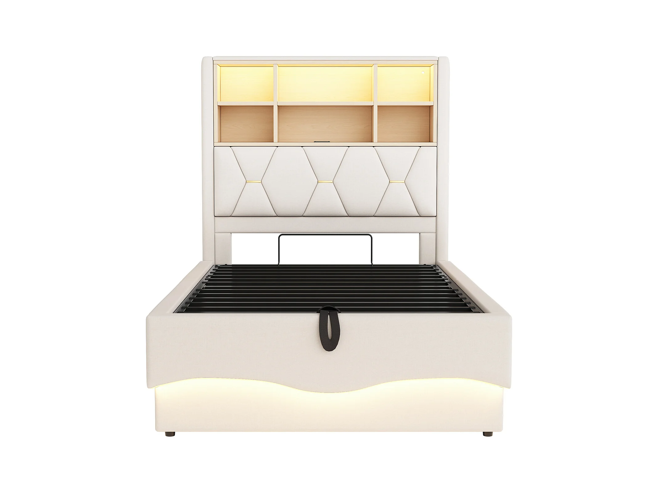 Lit coffre enfant - 90 x 200 cm - rangement hydraulique - avec Leds + USB - Lin + Métal + Contreplaqué + MDF - beige