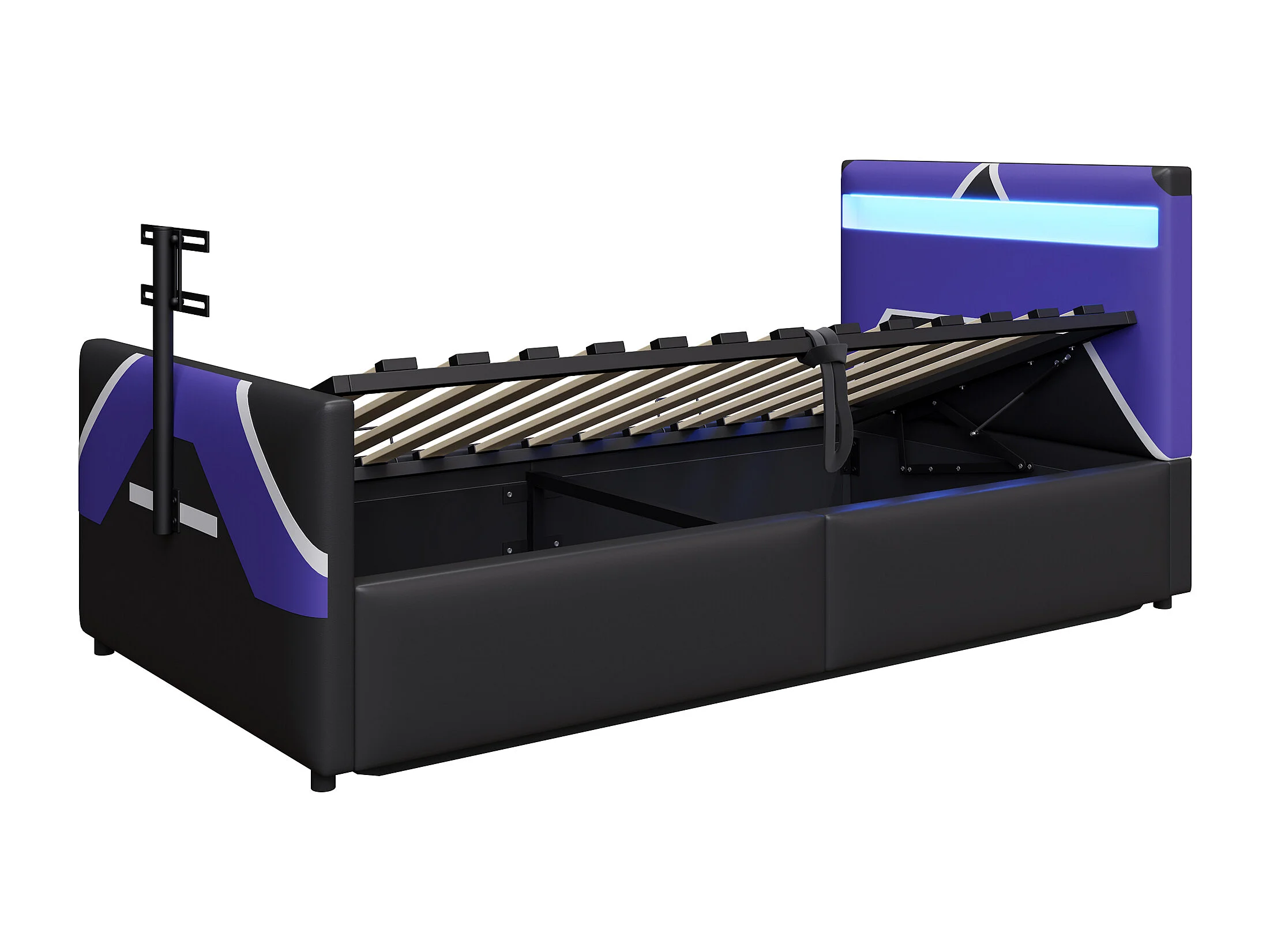 Lit coffre enfant 90x200cm - style e-sport - avec lumières LED - avec support TV intégré - noir + bleu (matelas non inclus)