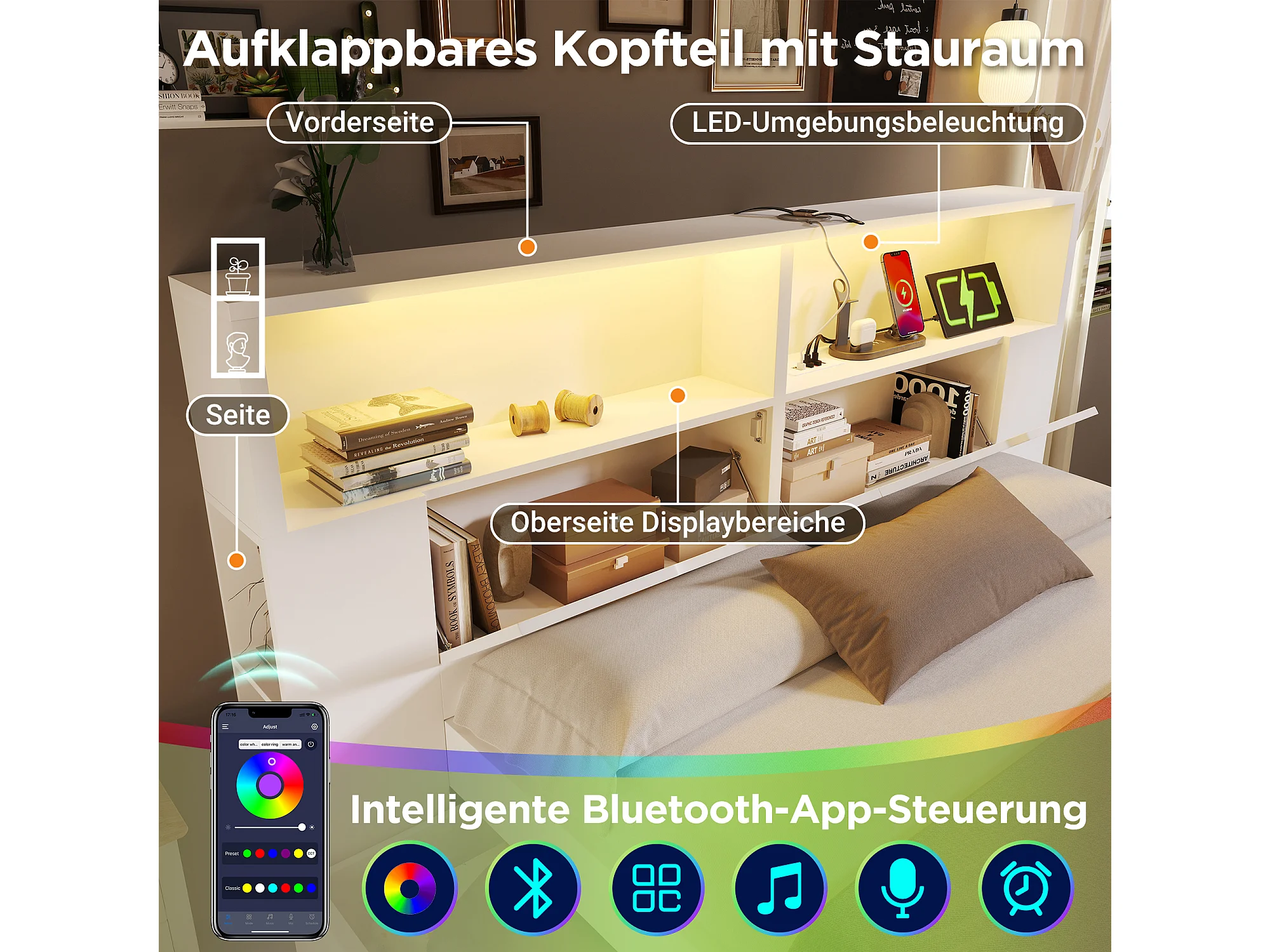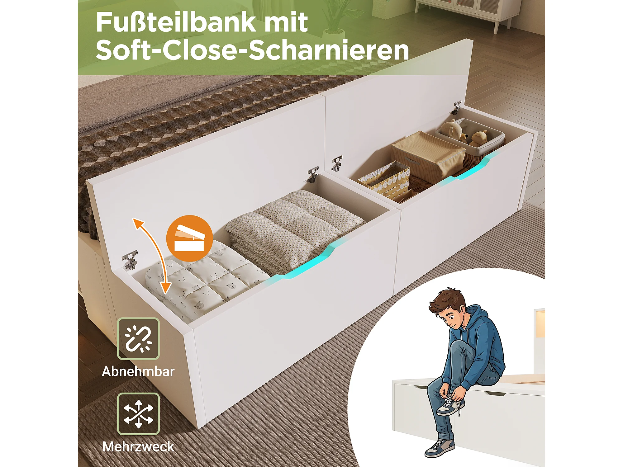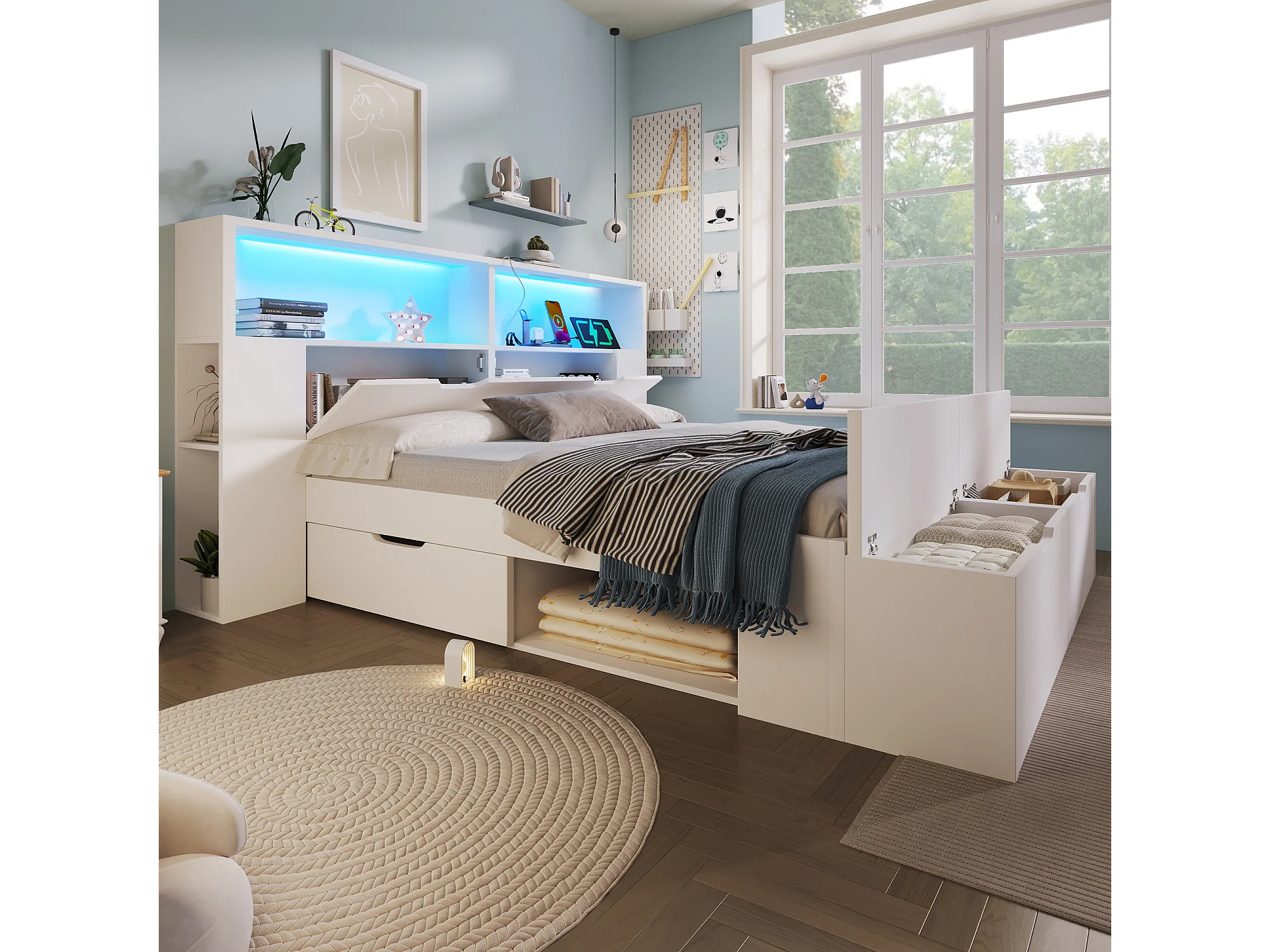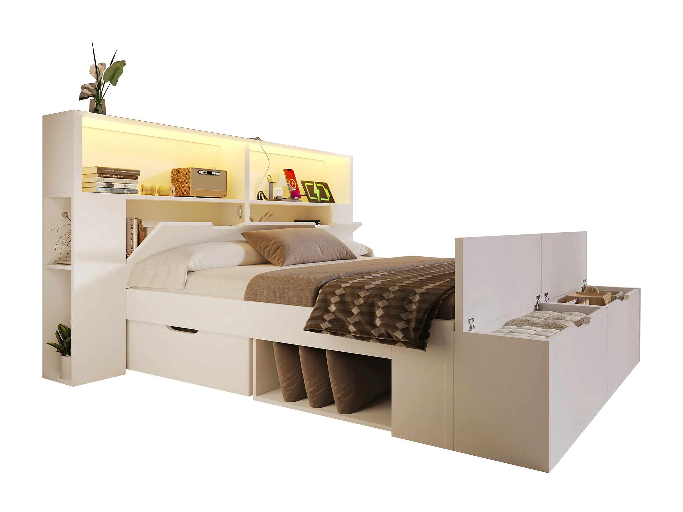 Lit coffre enfant en bois - 140 x 200 cm - avec tête de lit de rangements + Leds + USB + tiroirs + banquette - bois - blanc