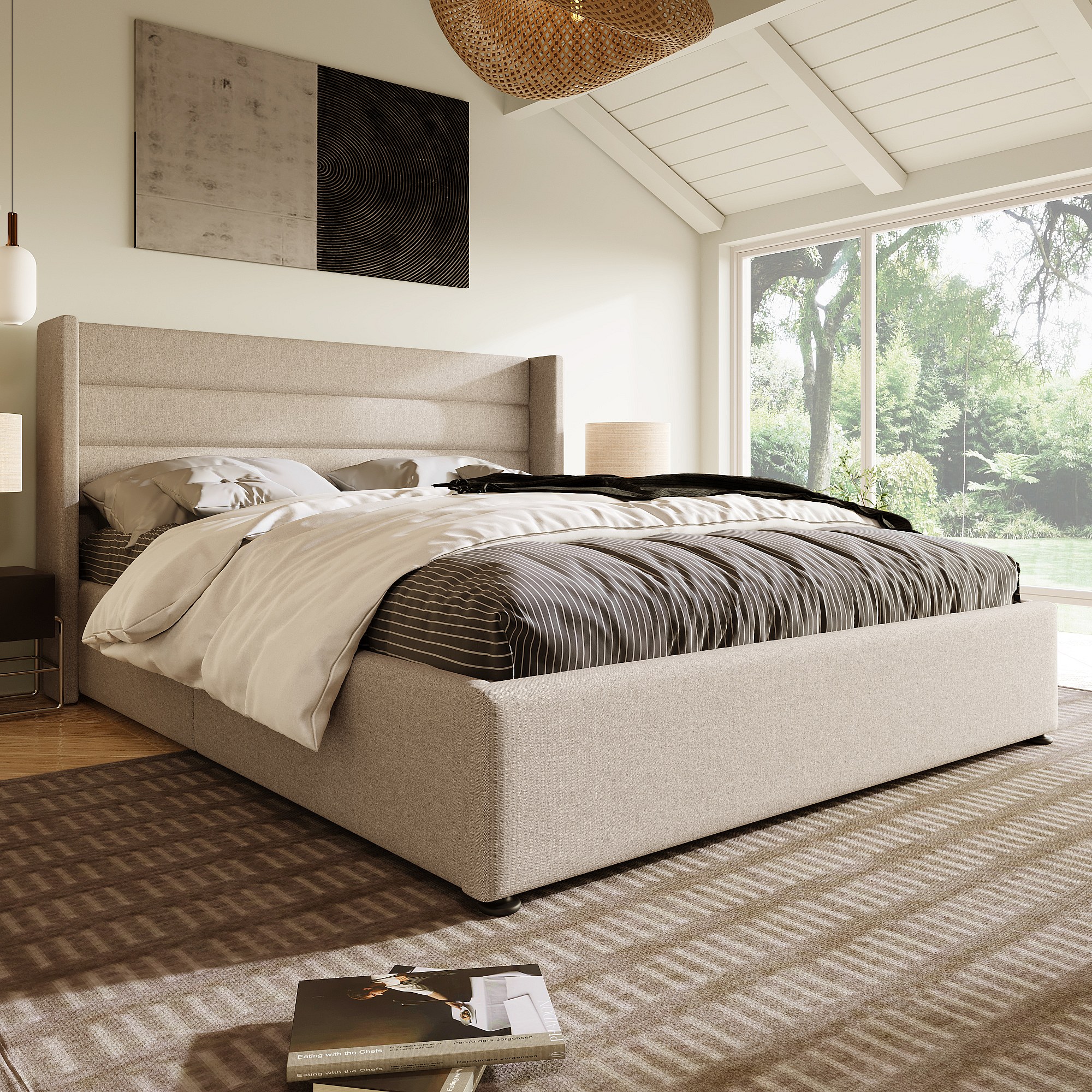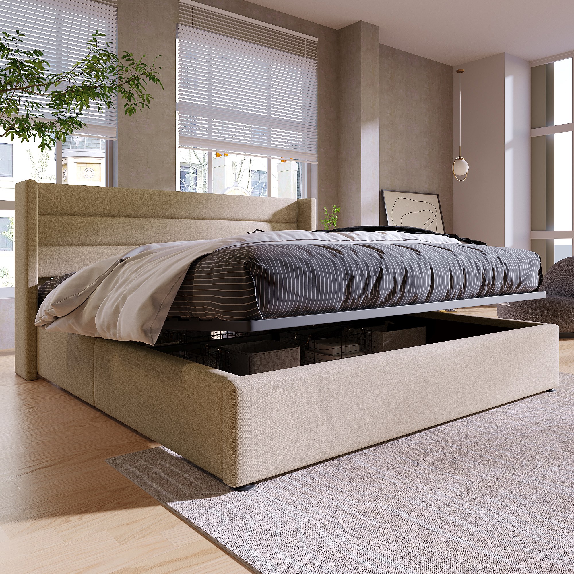 Lit coffre hydraulique 140x200 cm, beige, avec tête de lit rembourrée et rangement spacieux