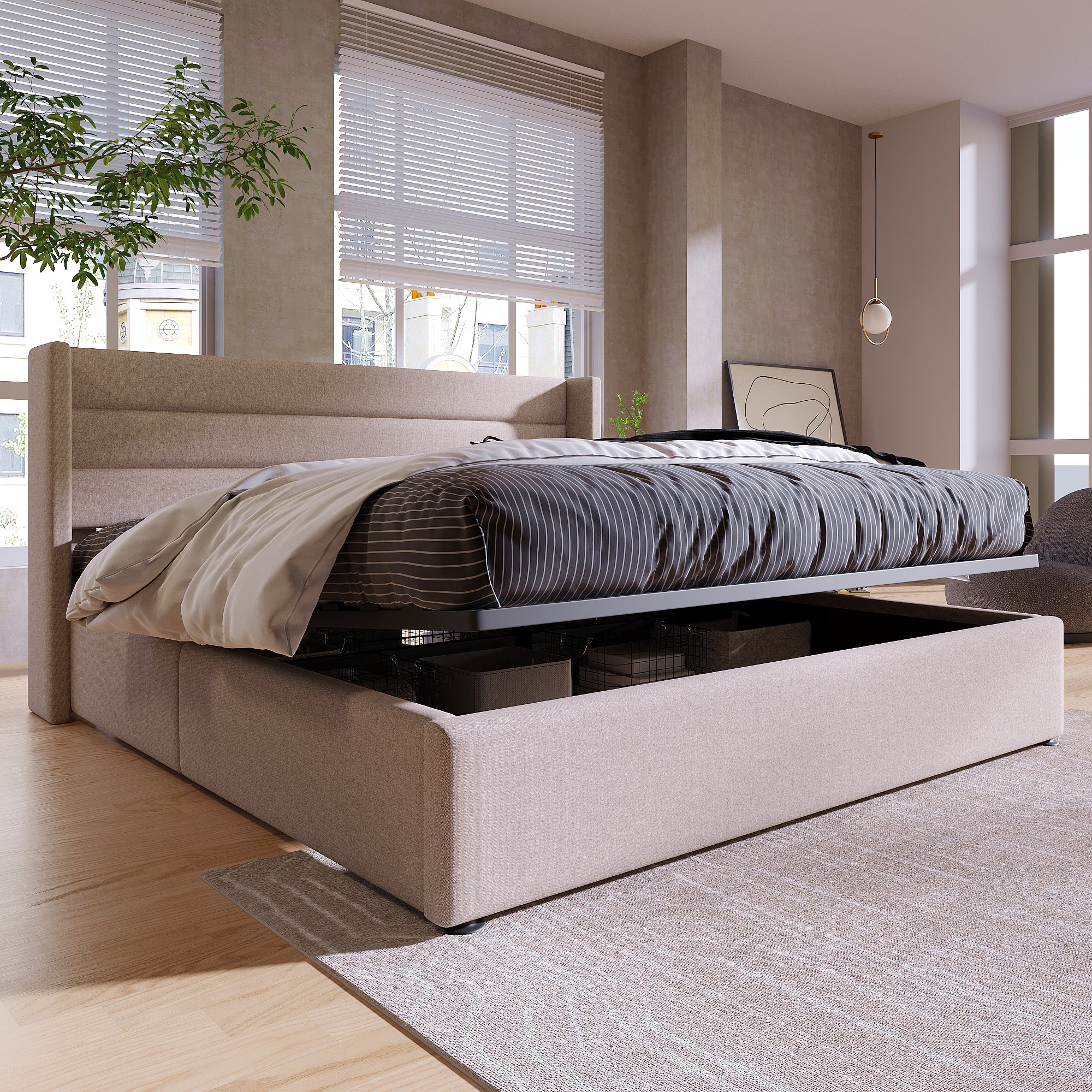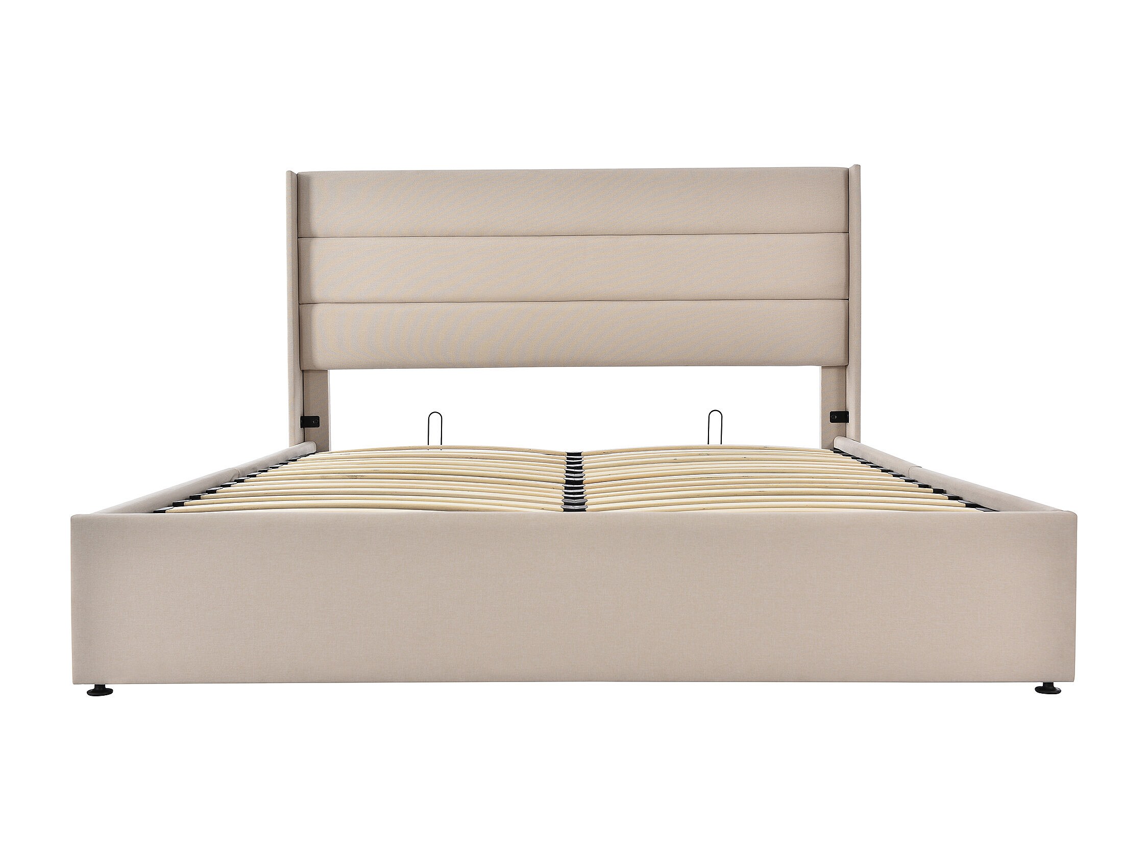 Lit coffre hydraulique 160x200 cm, beige, avec tête de lit rembourrée et espace de rangement