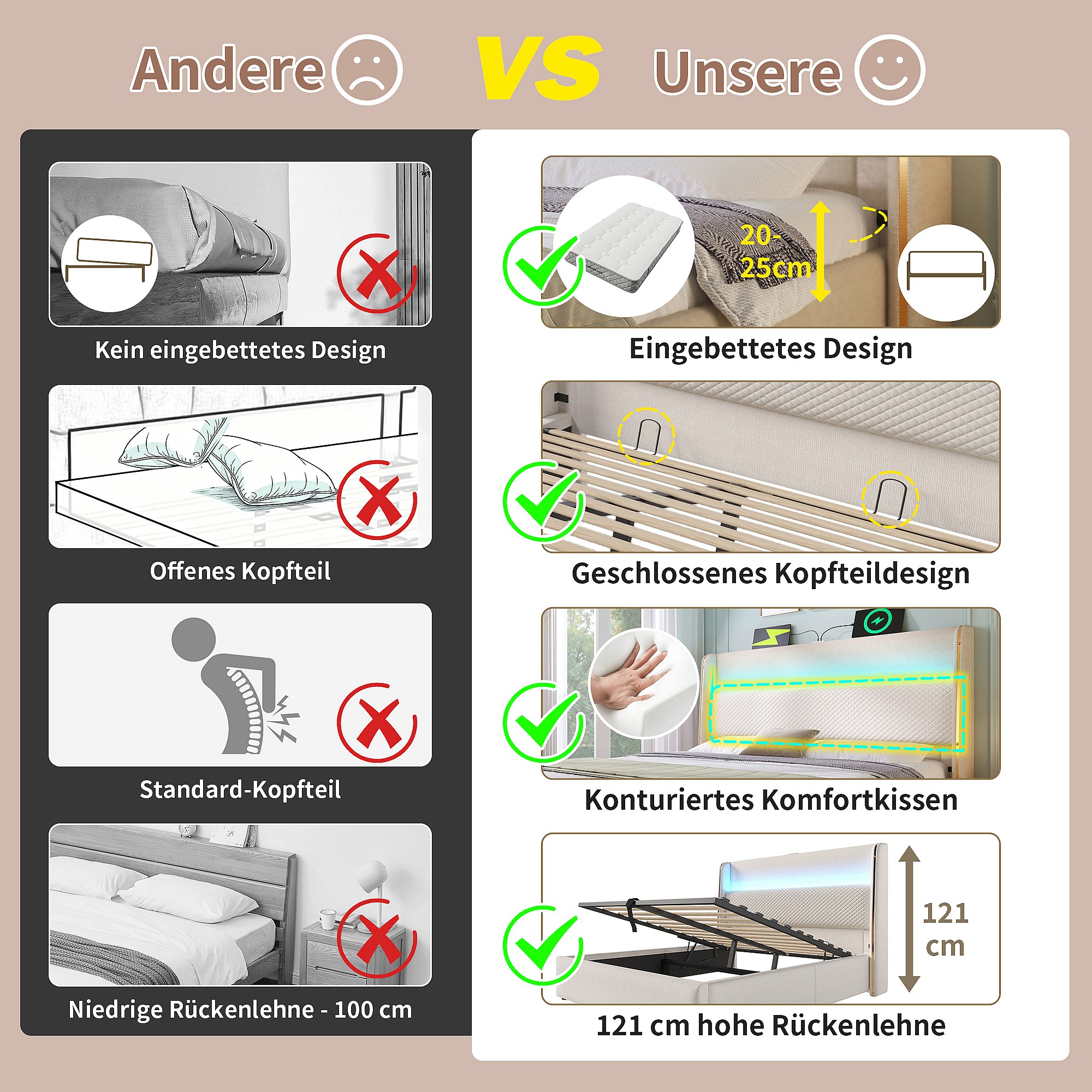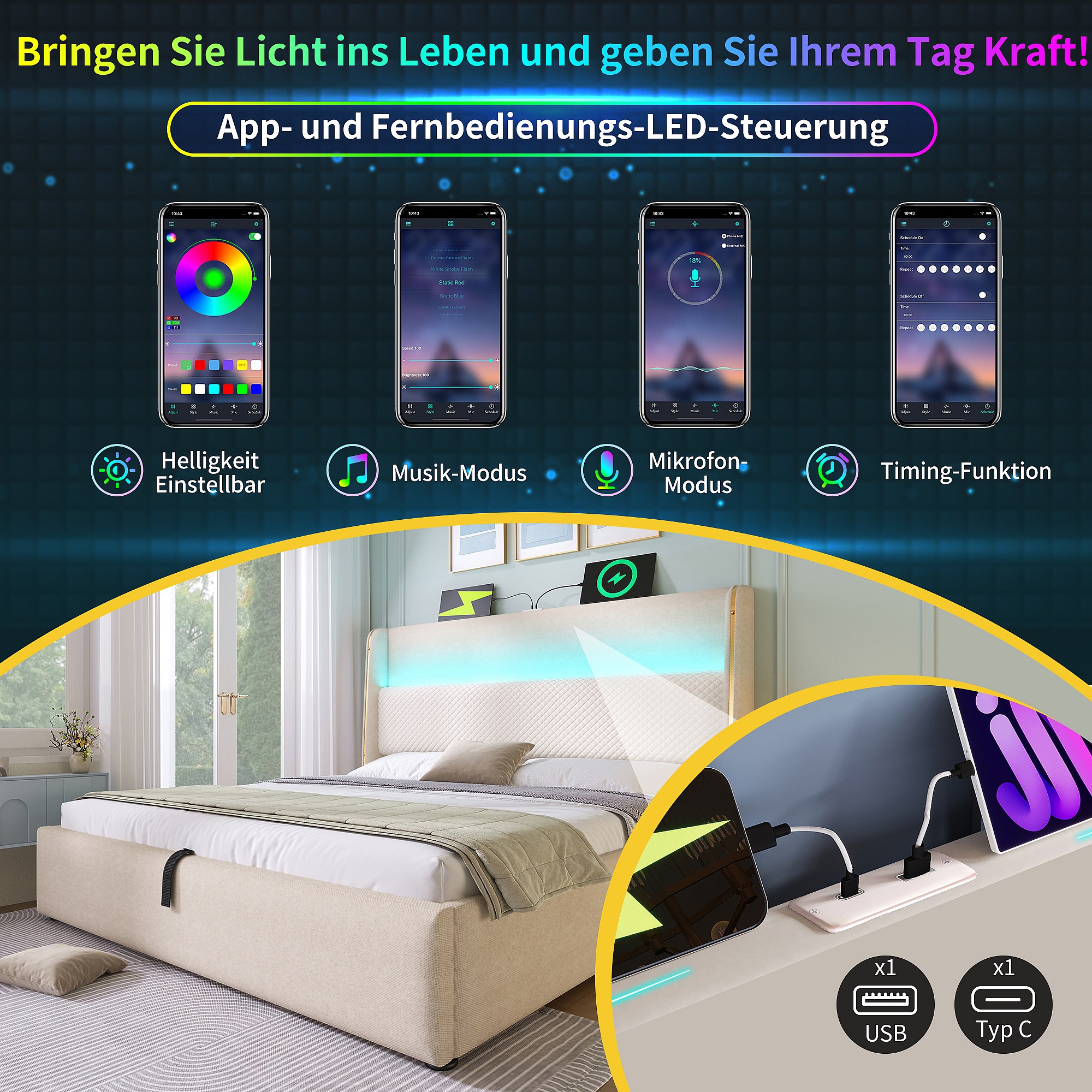 Lit coffre hydraulique avec tête de lit + Leds et ports USB/Type-C - 90 x 200 cm - lin - beige(avec matelas)