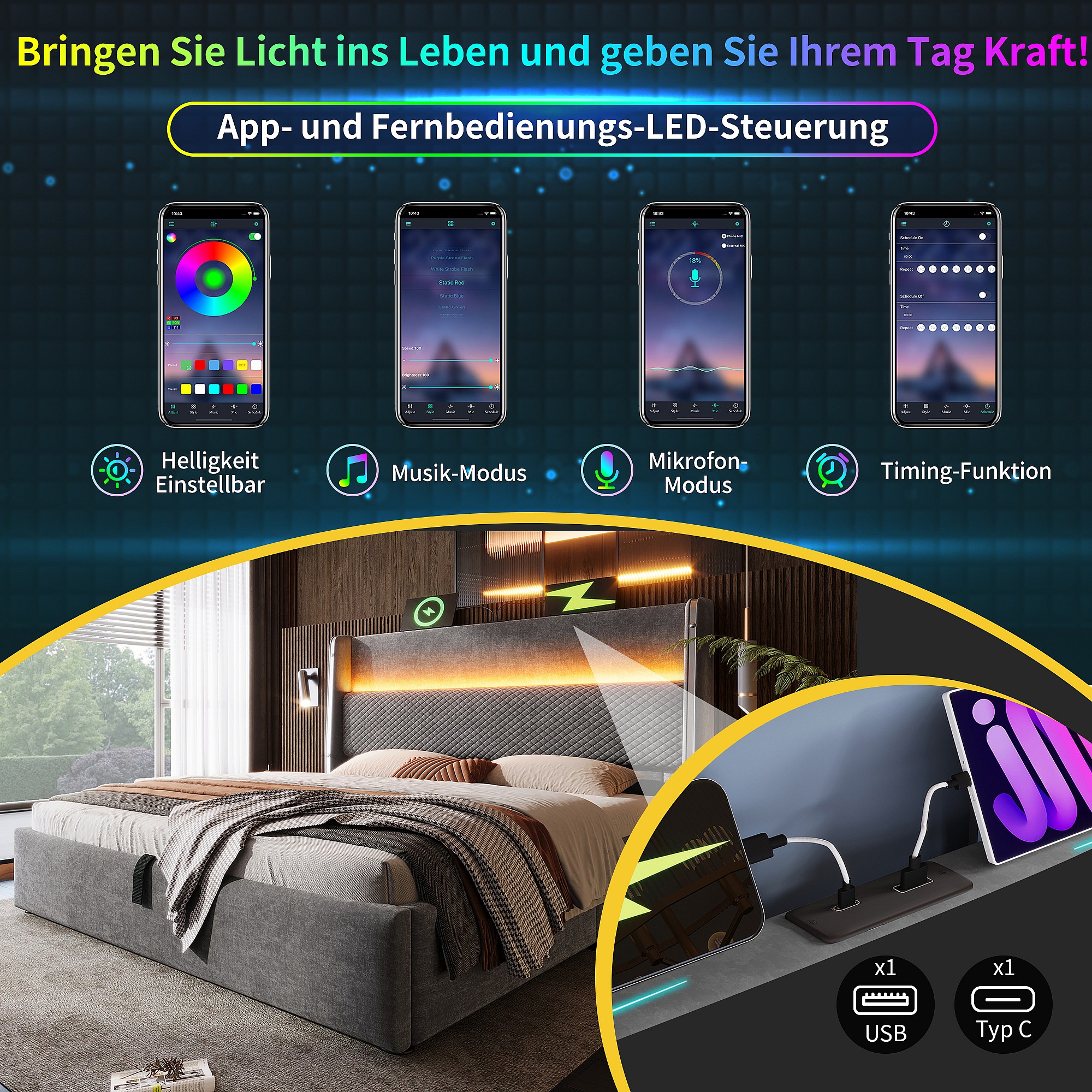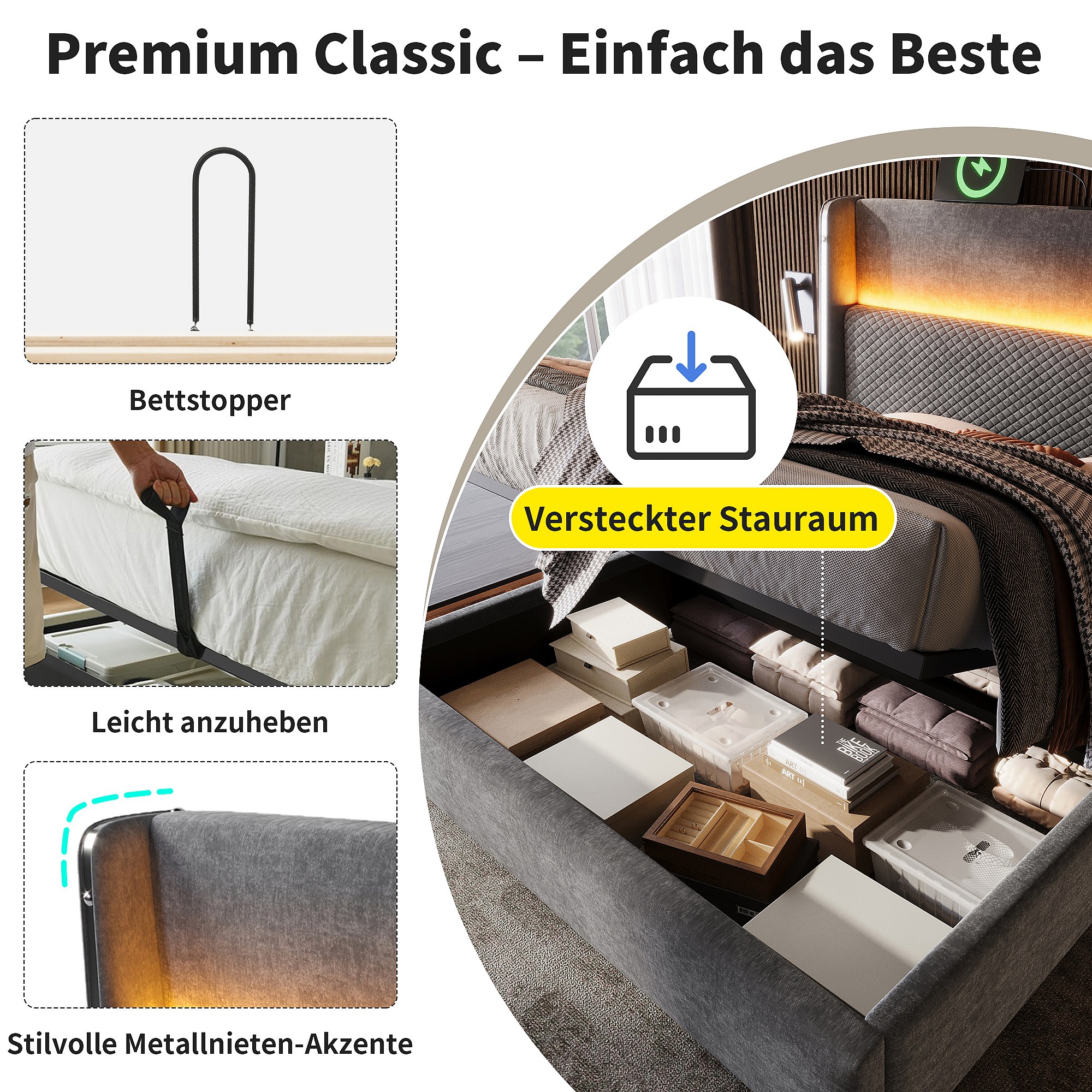Lit coffre hydraulique avec tête de lit + Leds et ports USB/Type-C - 90 x 200 cm - lin - gris(avec matelas)
