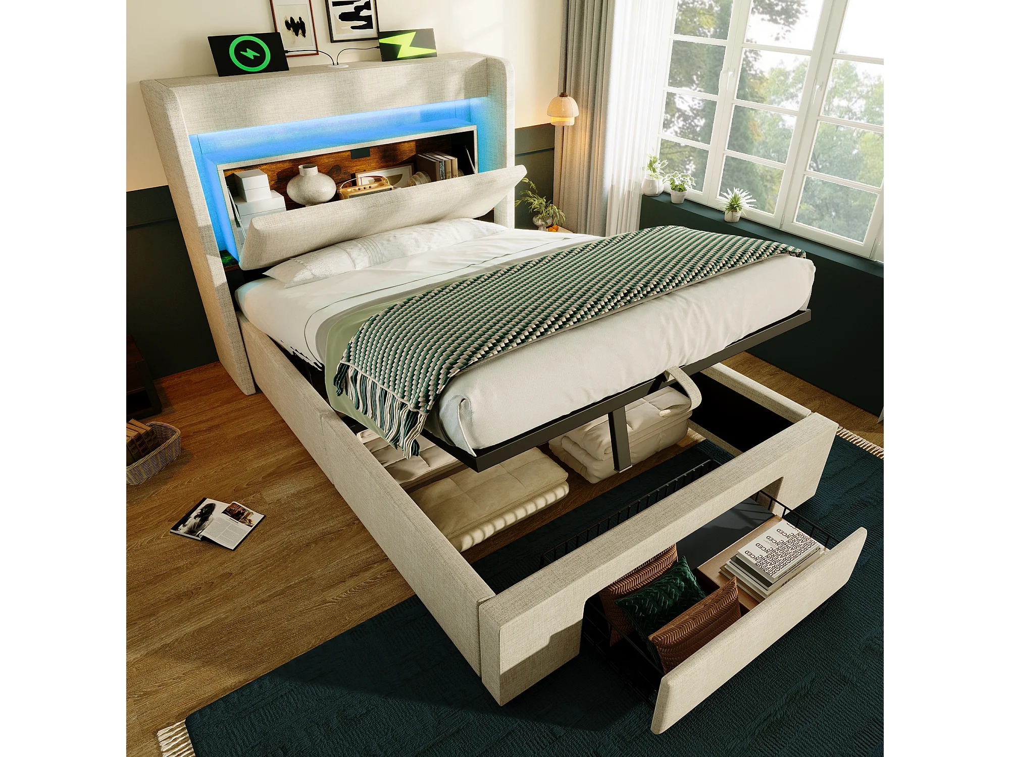 Lit coffre hydraulique capitonné - 90 x 200 cm - avec tête de lit de rangement + Leds + USB + tiroir - lin - beige