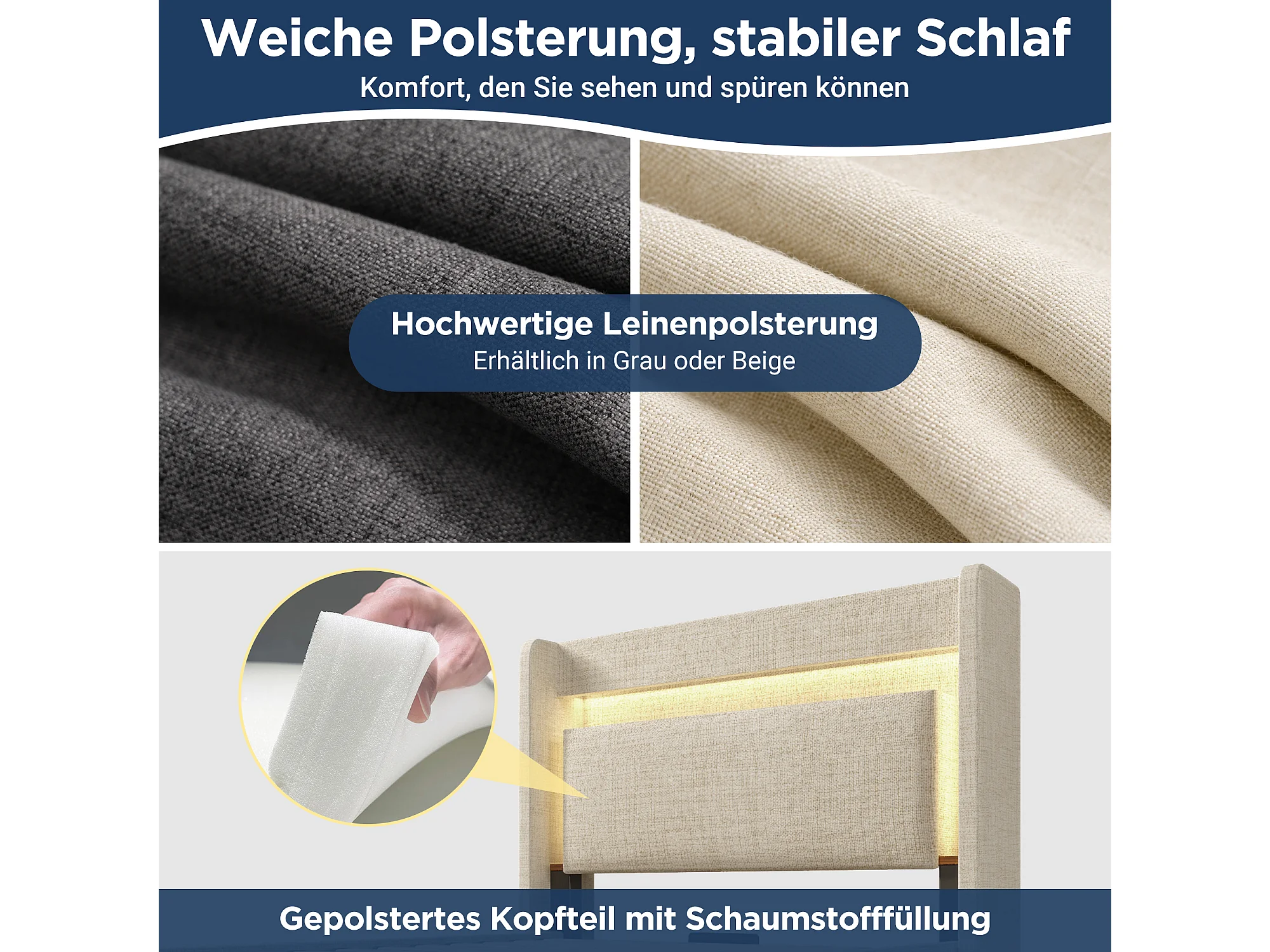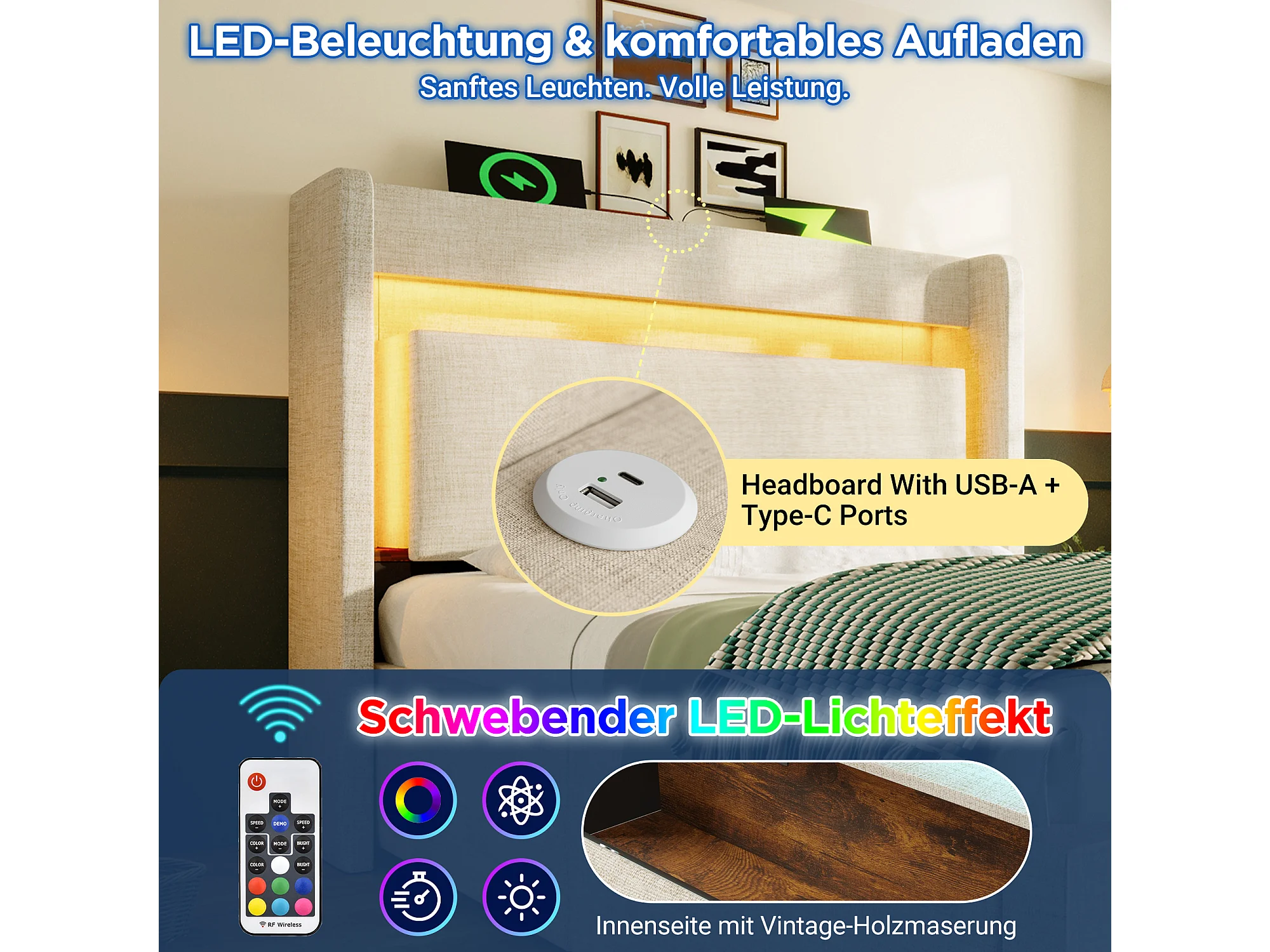 Lit coffre hydraulique capitonné - 90 x 200 cm - avec tête de lit de rangement + Leds + USB + tiroir - lin - beige(avec matelas)