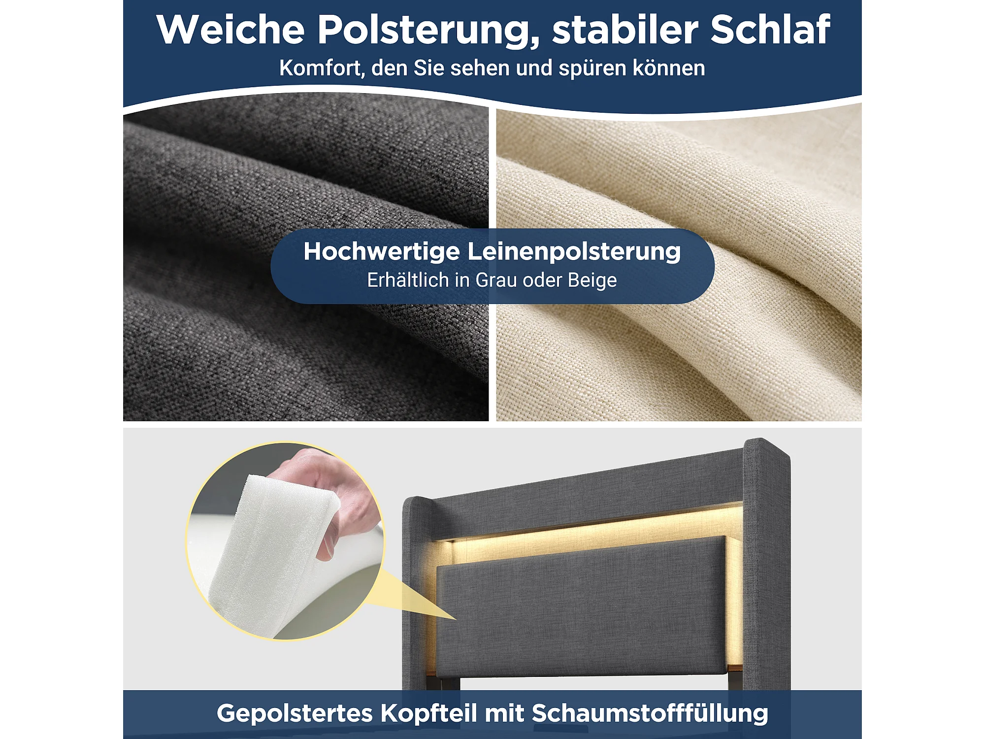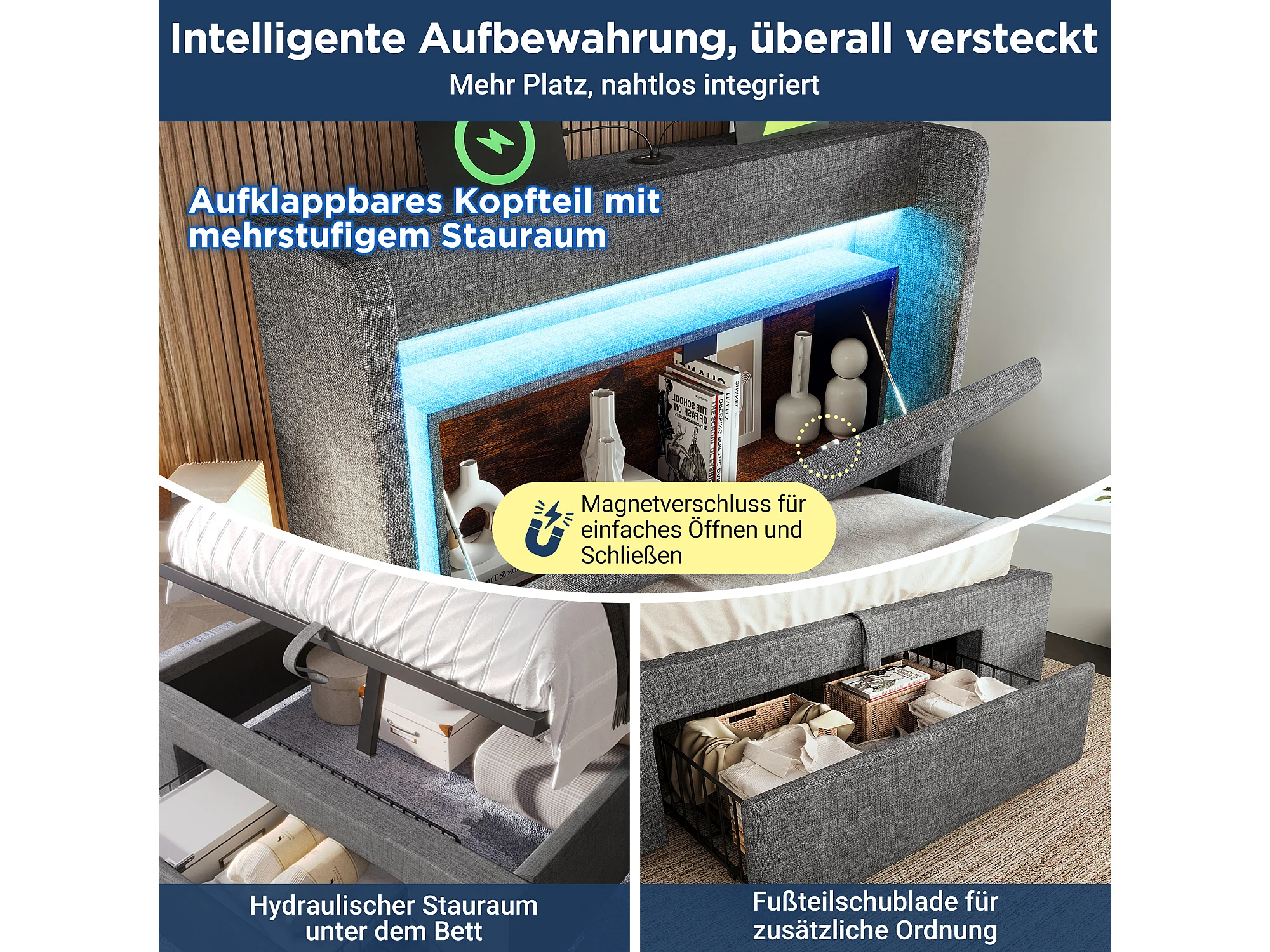 Lit coffre hydraulique capitonné - 90 x 200 cm - avec tête de lit de rangement + Leds + USB + tiroir - lin - gris(avec matelas)