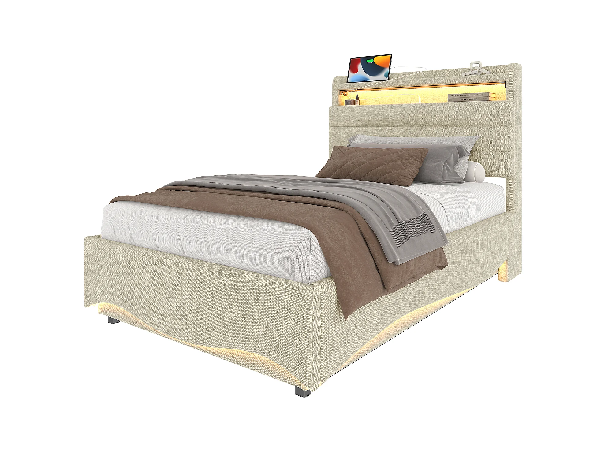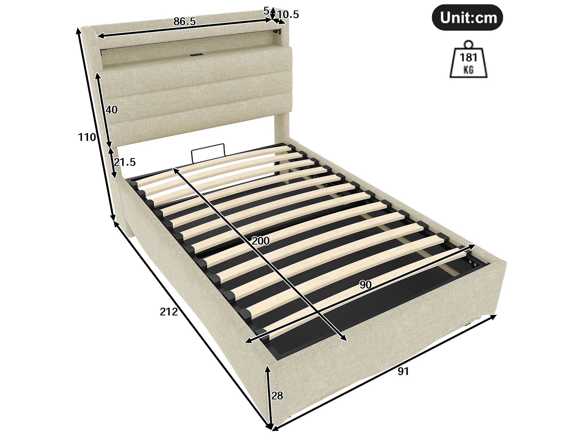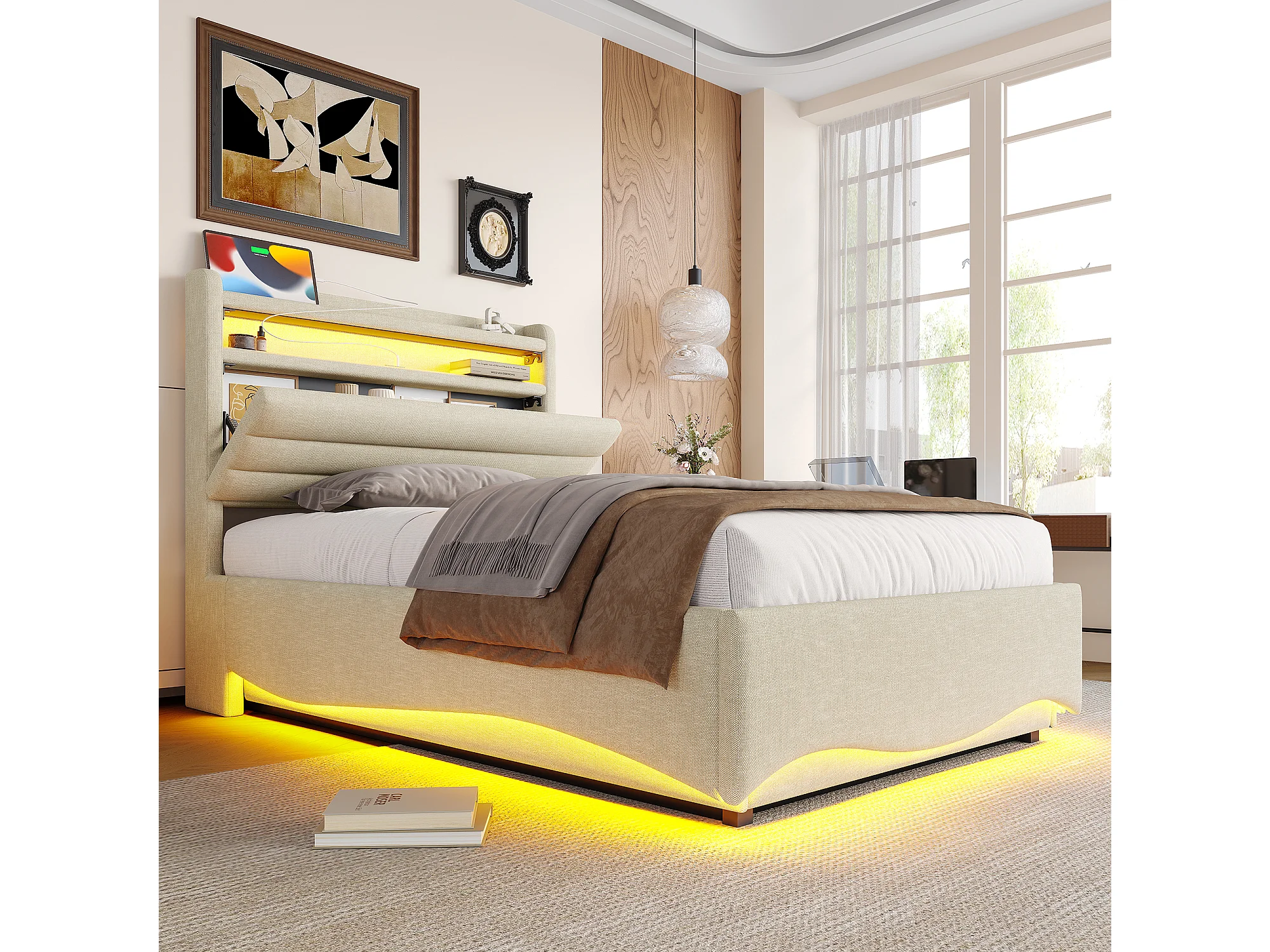 Lit coffre hydraulique pour enfant - 90 x 200 cm - avec Leds + USB + tête de lit de rangement - lin - beige