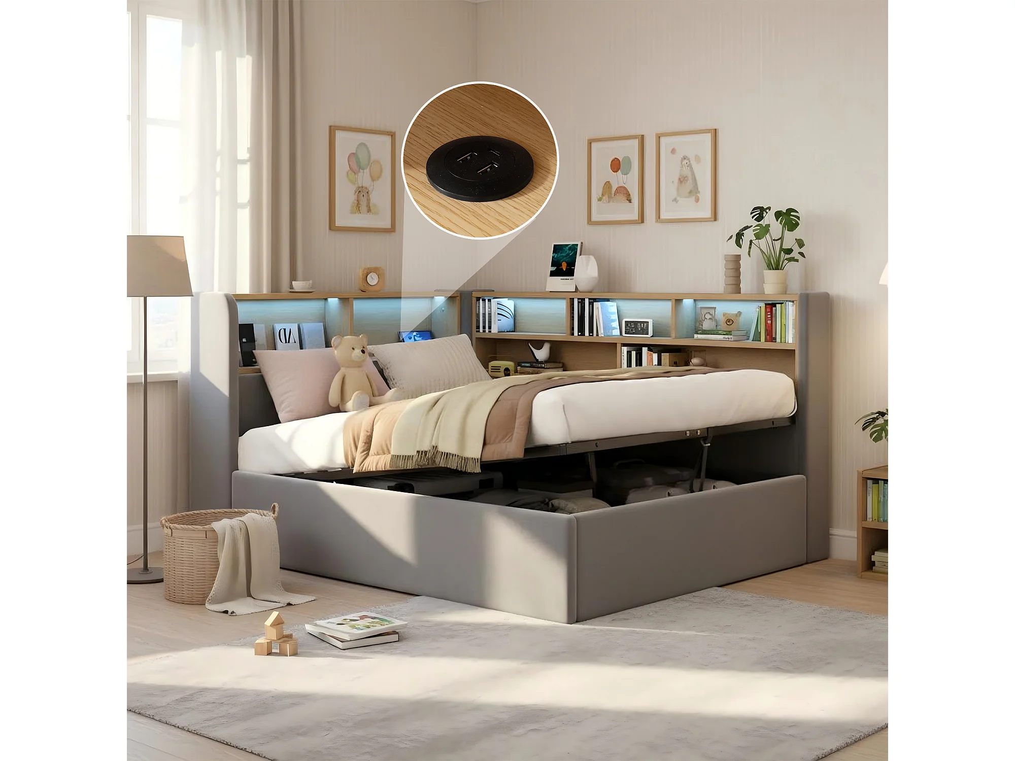 Lit coffre hydraulique pour enfant - 90 x 200 cm - canapé-lit rembourré avec étagère + Leds + USB - velours - gris