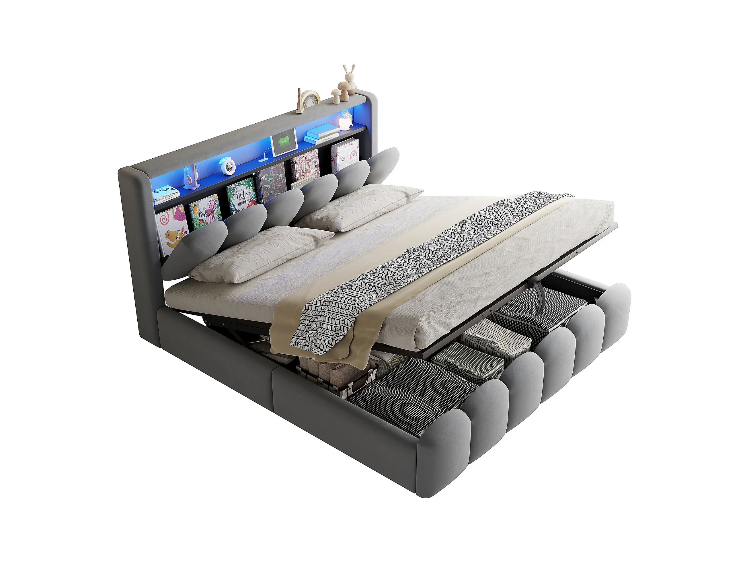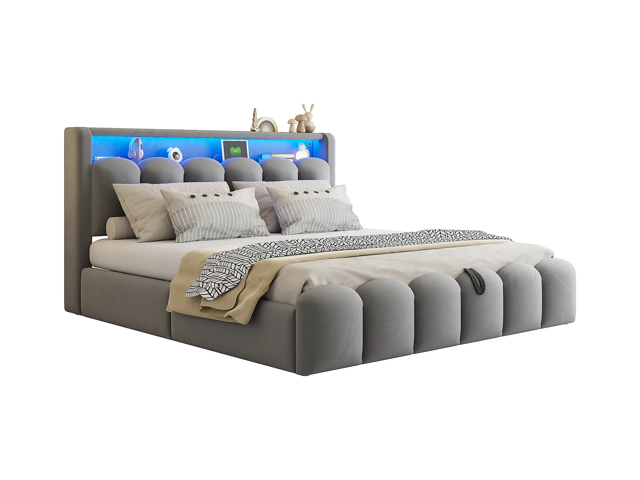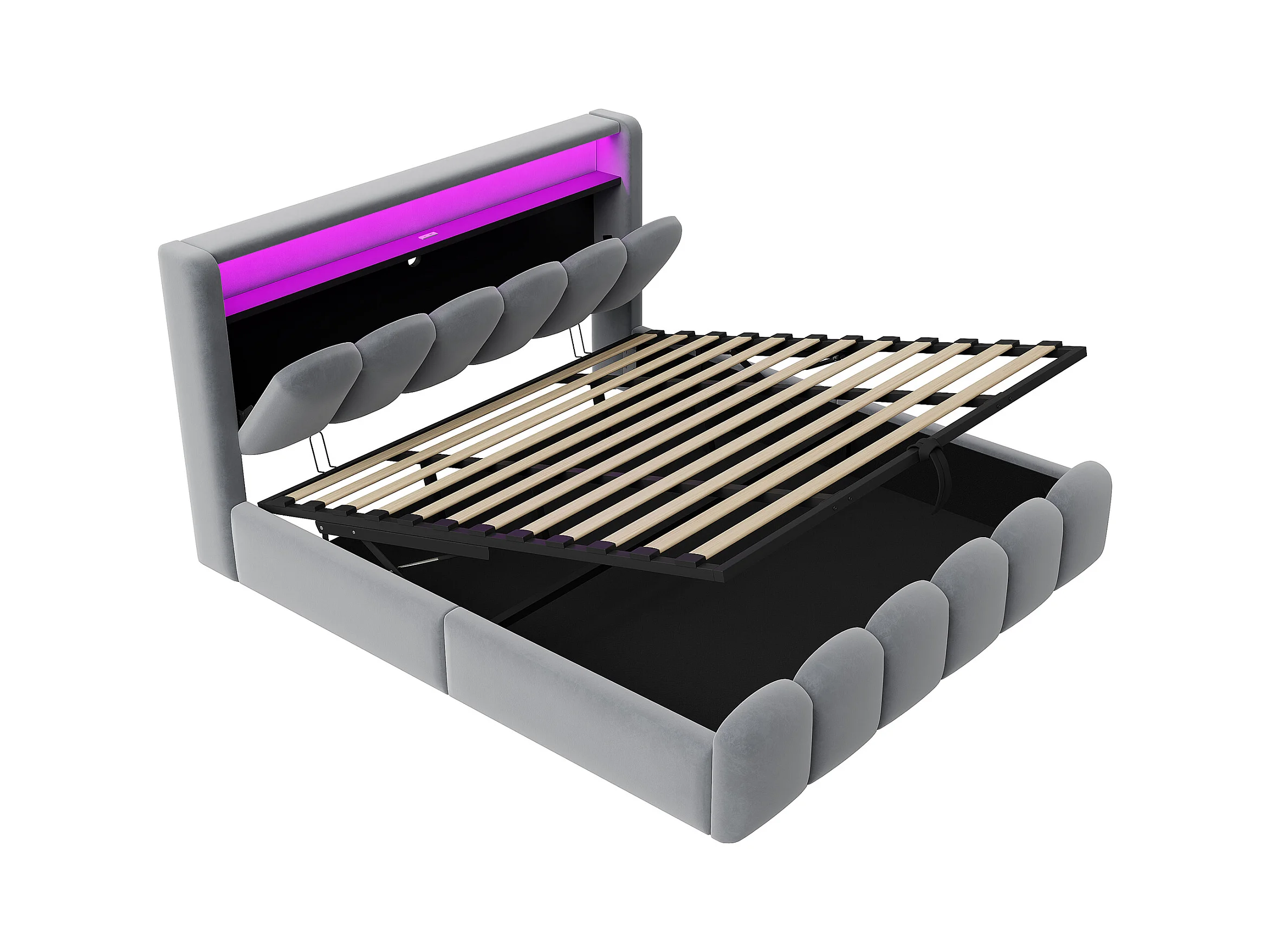 Lit coffre hydraulique rembourré - 180 x 200 cm - tête de lit avec rangement - avec USB + Leds - velours - gris