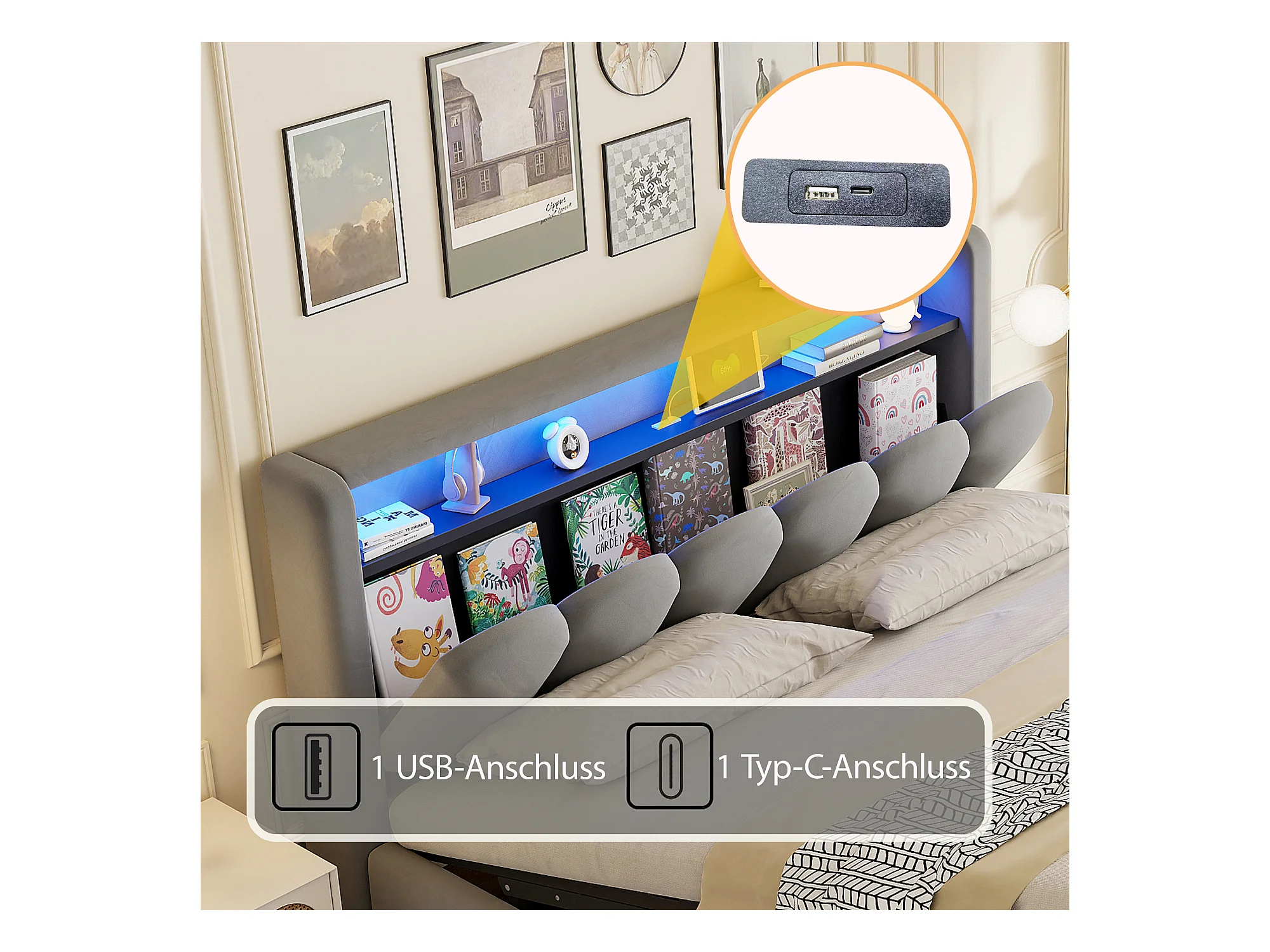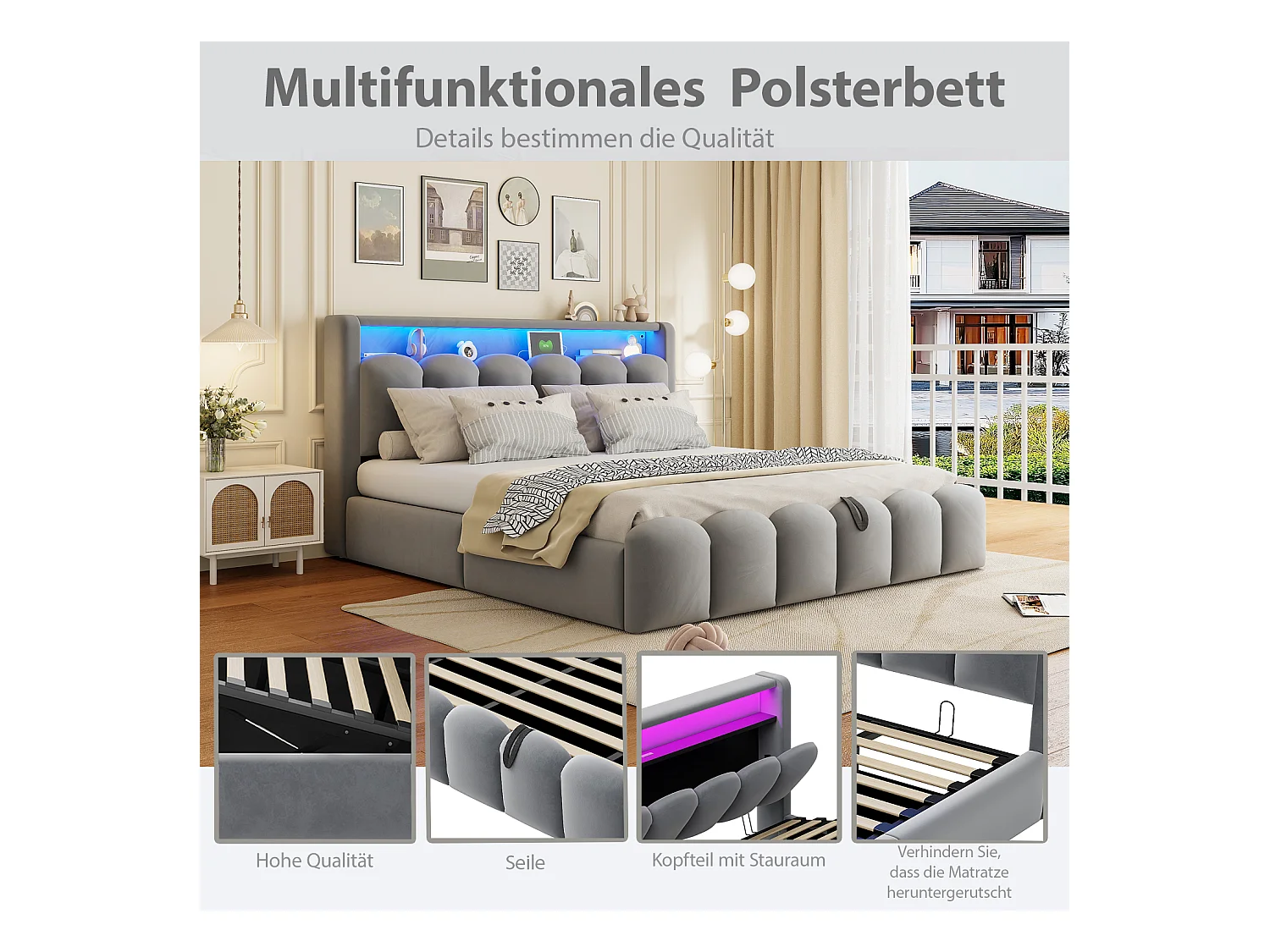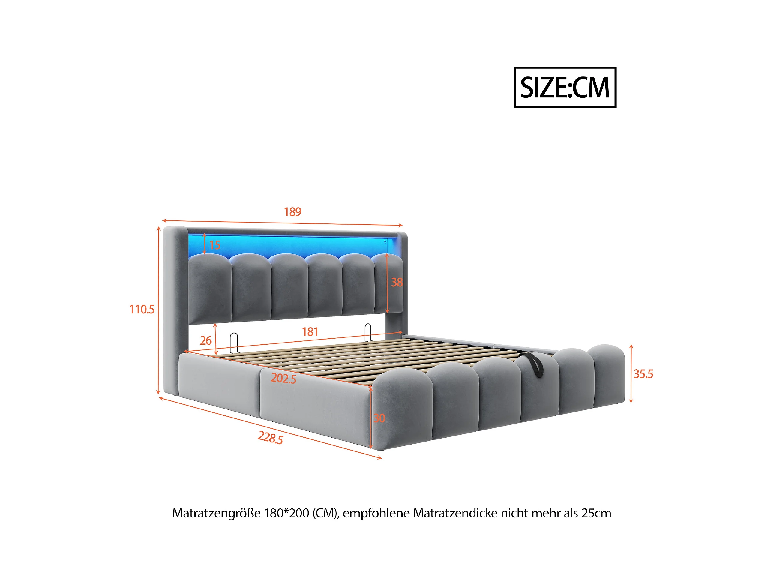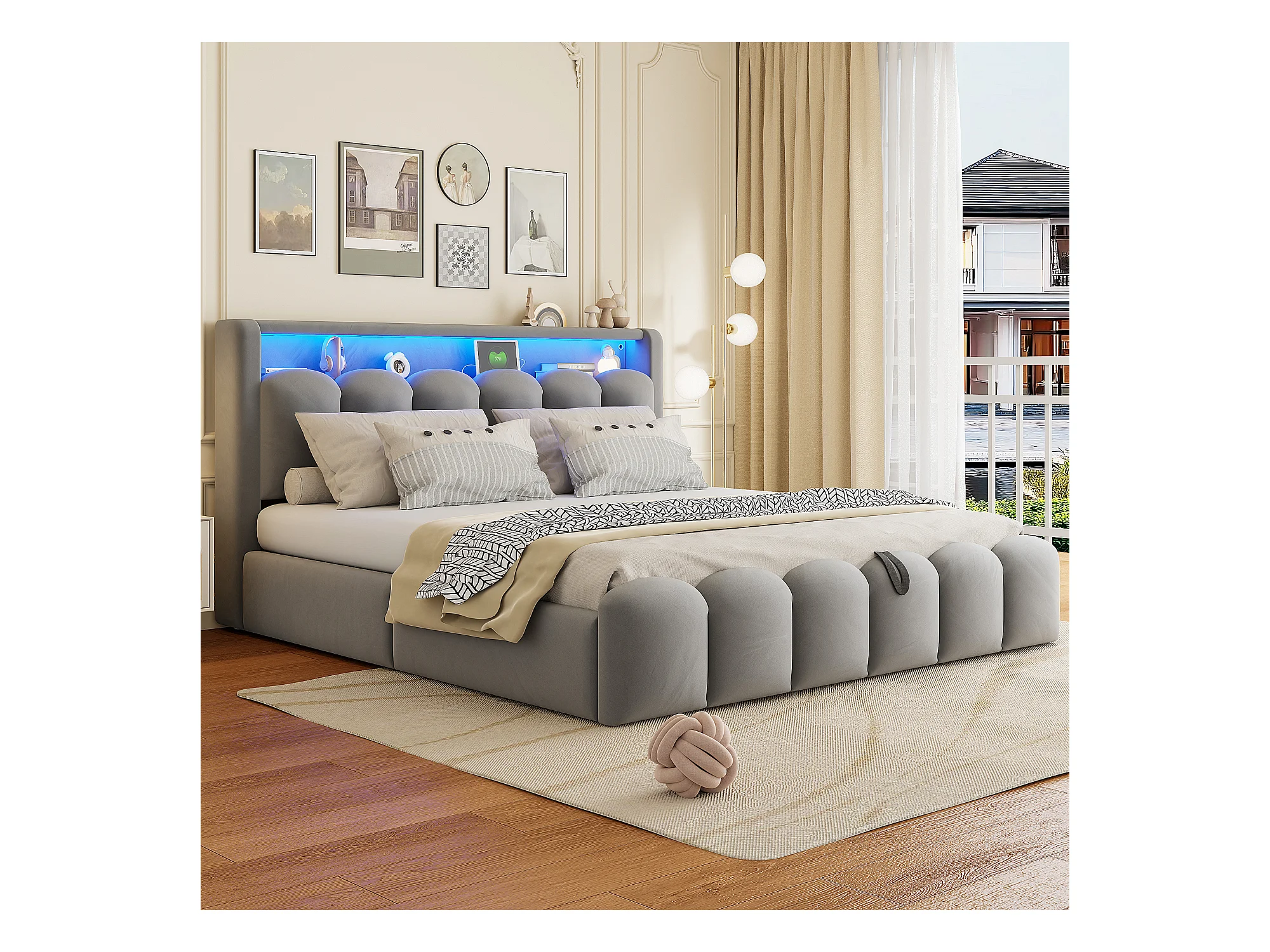 Lit coffre hydraulique rembourré - 180 x 200 cm - tête de lit avec rangement - avec USB + Leds - velours - gris