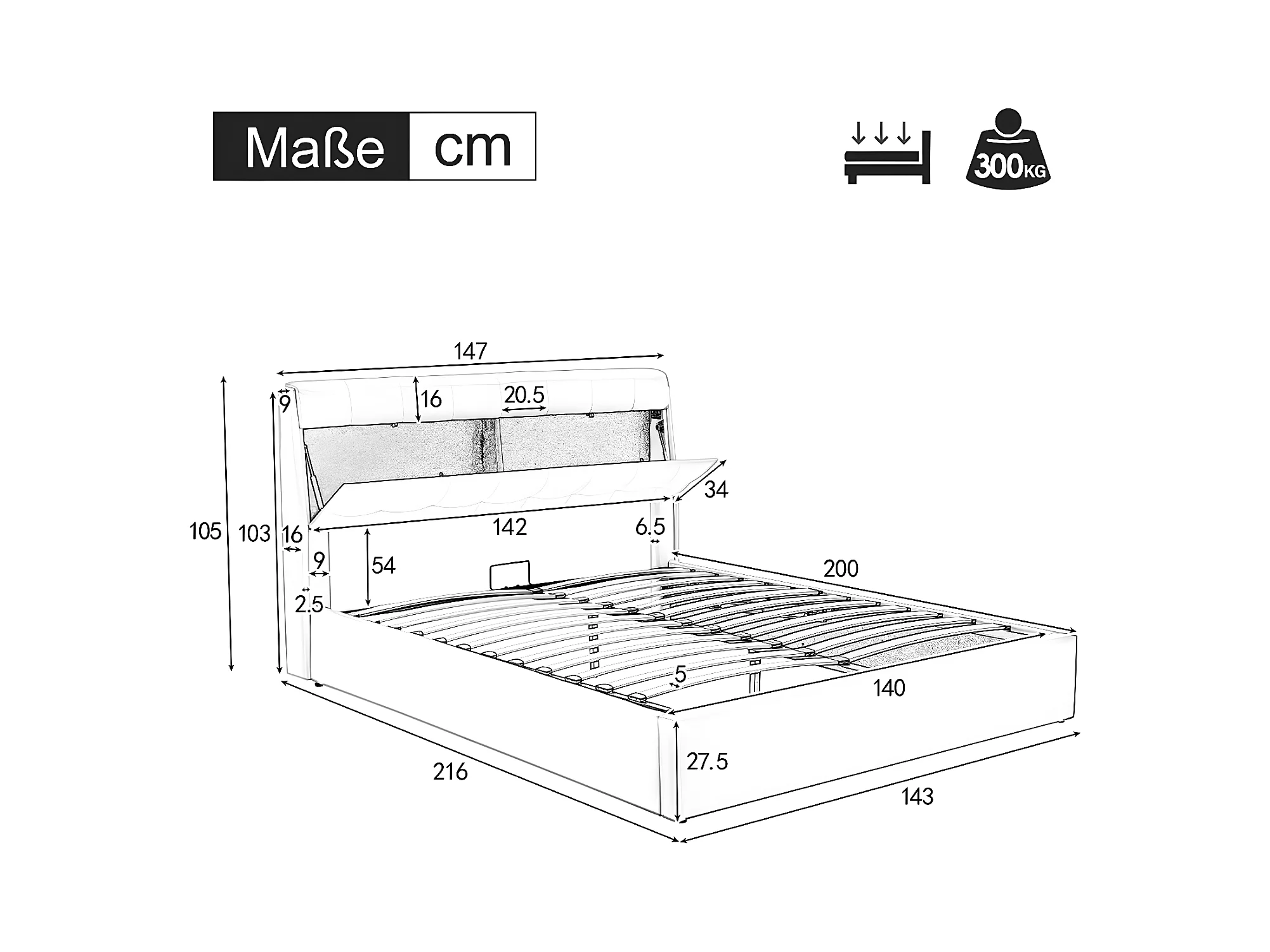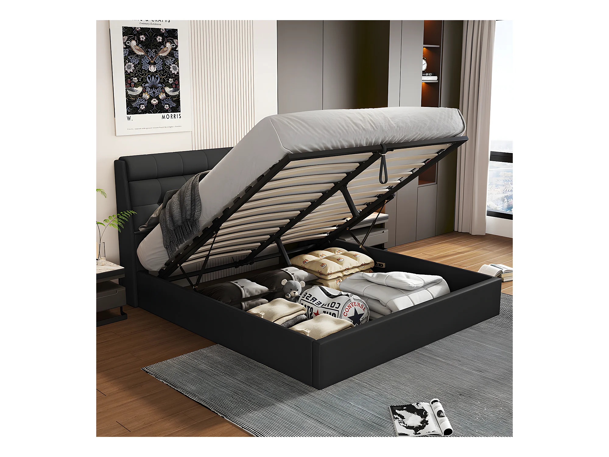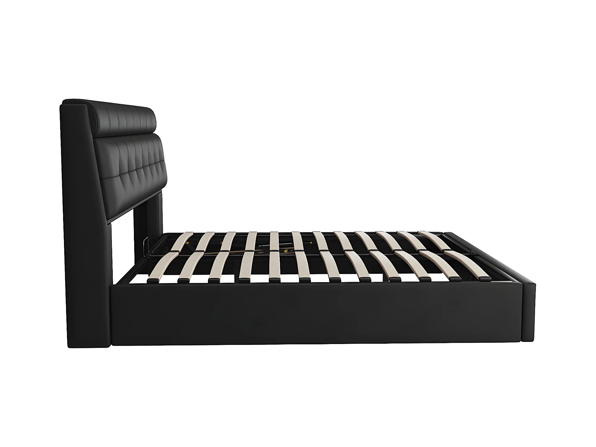 Lit coffre Lit 140x200 cm lit hydraulique rangement tête de lit caché avec sommier à lattes PU Noir