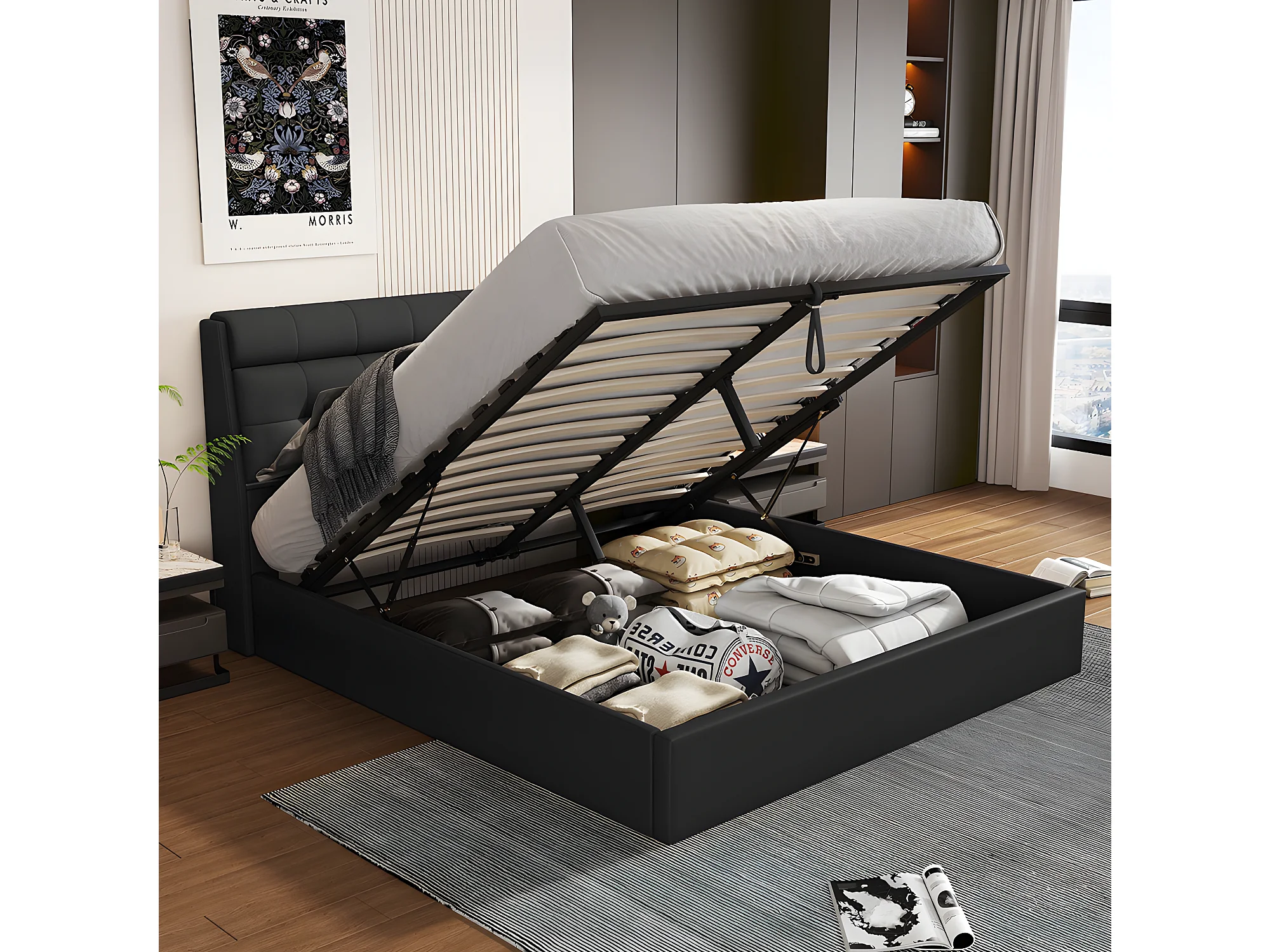 Lit coffre Lit 90x200 cm lit hydraulique rangement tête de lit caché avec sommier à lattes PU Noir