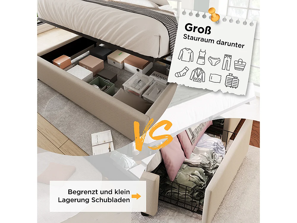 Lit coffre Lit adulte Lit 140x200 cm Poches de Chargement Latérales Hydraulique Lit Simple Lin Beige