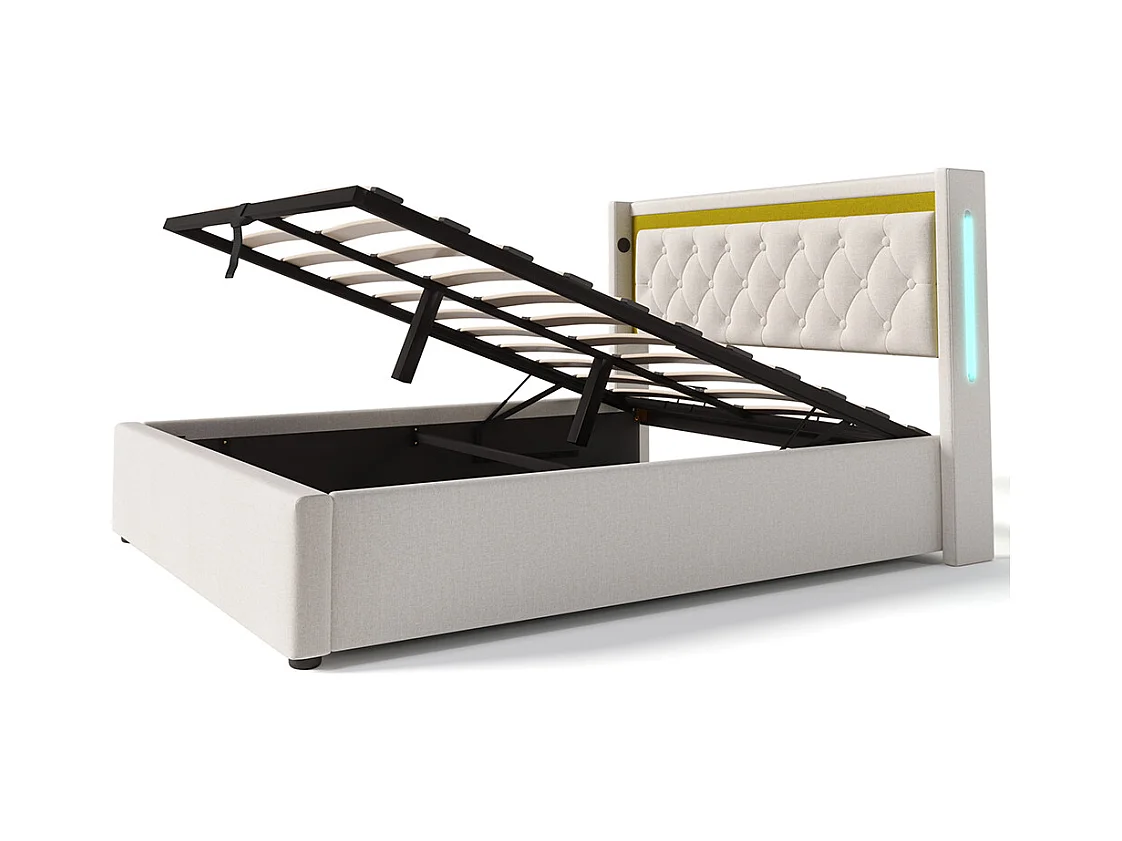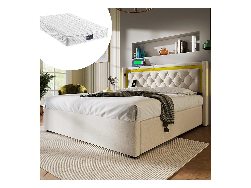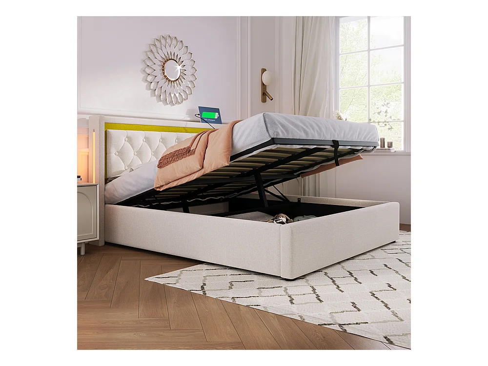 Lit coffre Lit double LED avec rangement et tête de lit USB type C lit de rangement lit d'adolescent 140x200 cm-Avec matelas