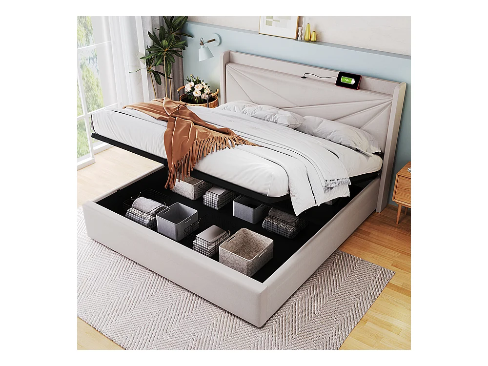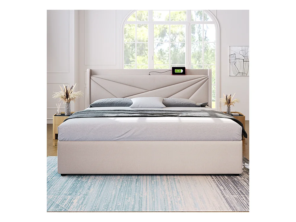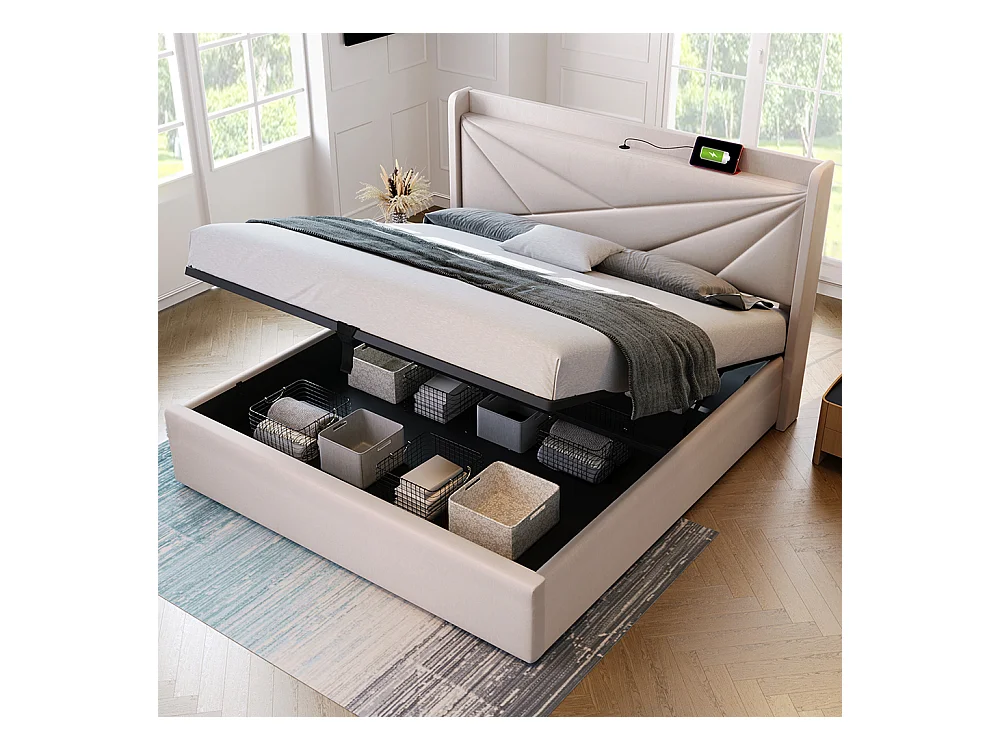 Lit coffre Lit double rembourré Lit de rangement Tête de lit avec fonction de chargement USB Lit de jeune Lit 180x200 cm Beige
