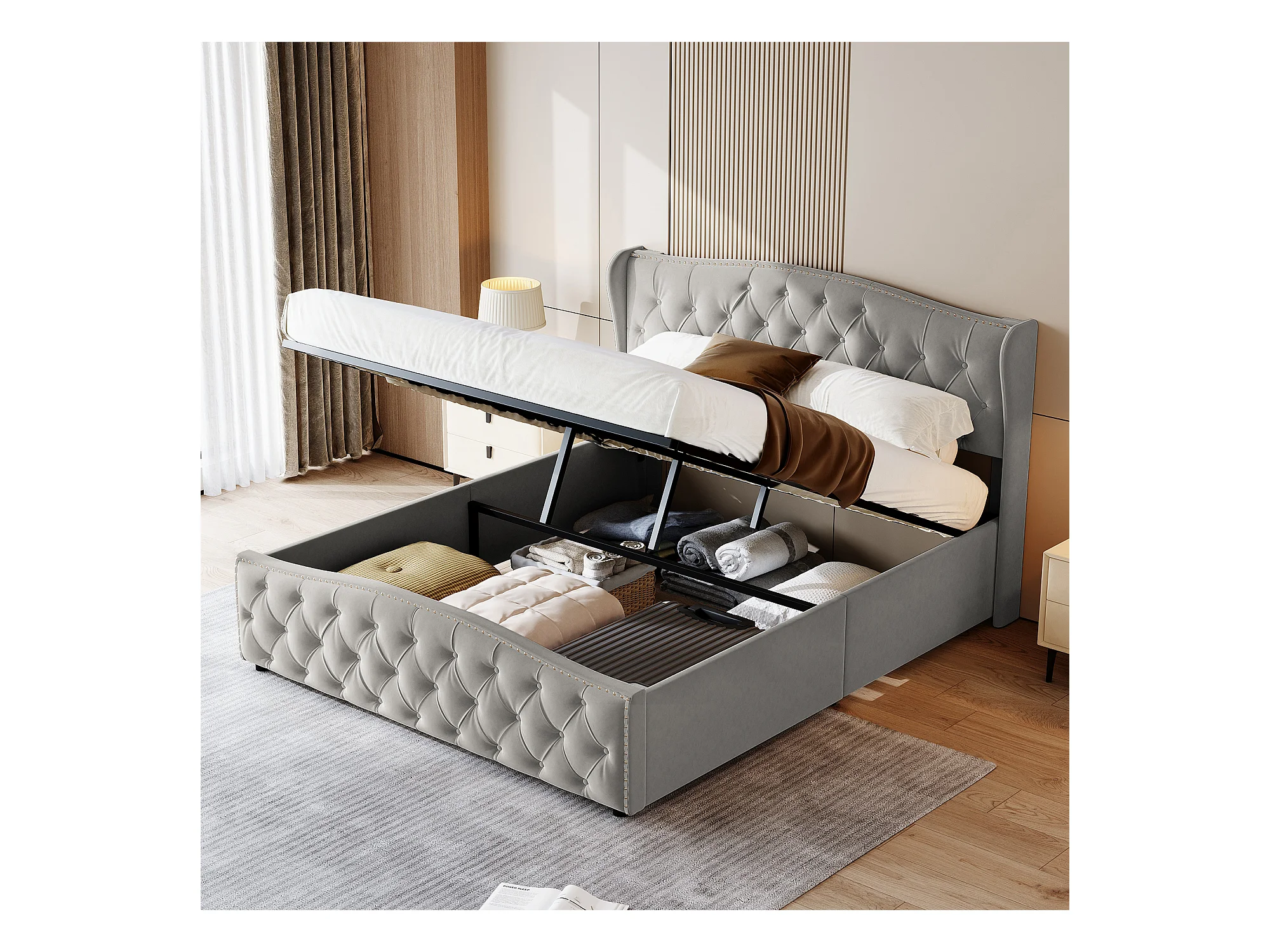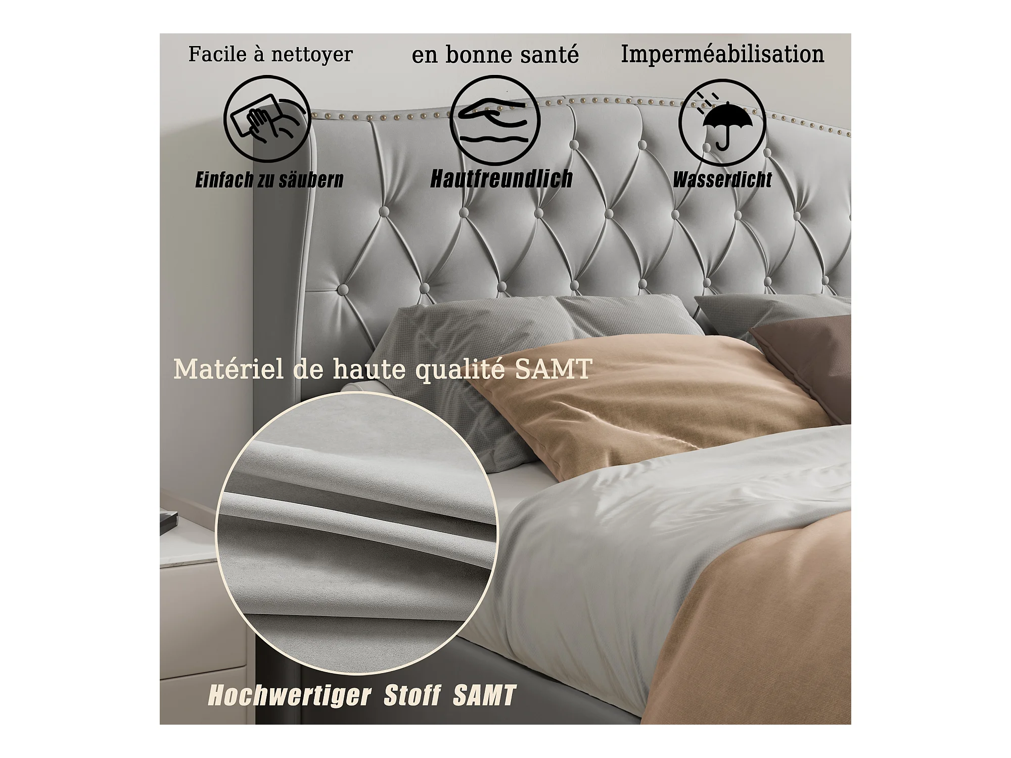 Lit Coffre - Lit Rembourré 140x200 cm - Lit Adulte en Velours - Rivets Décoratifs - Coffre de Rangement et Sommier