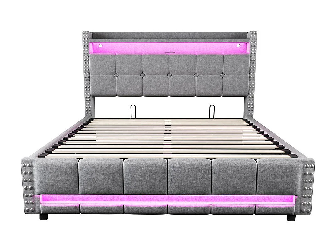 Lit coffre lit rembourré 160x200 avec éclairage LED et prise USB tête de lit avec système hydraulique lit double pour adulte lin gris clair