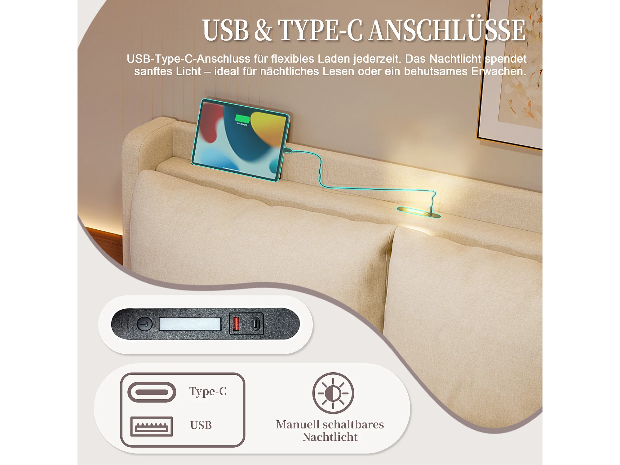 Lit coffre moderne - 140 x 190 cm - avec tête de lit + USB-C + Leds + coussins amovibles - velours - beige