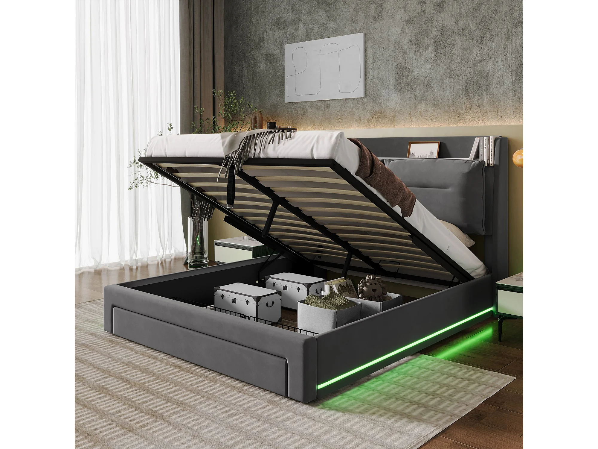 Lit Capitonné 140 x 190 cm - Lit Coffre Hydraulique Avec Tiroir 2 en 1 Et Bandes LED Intégrées Réglables - En Velours - Gris Foncé - Sans matelas