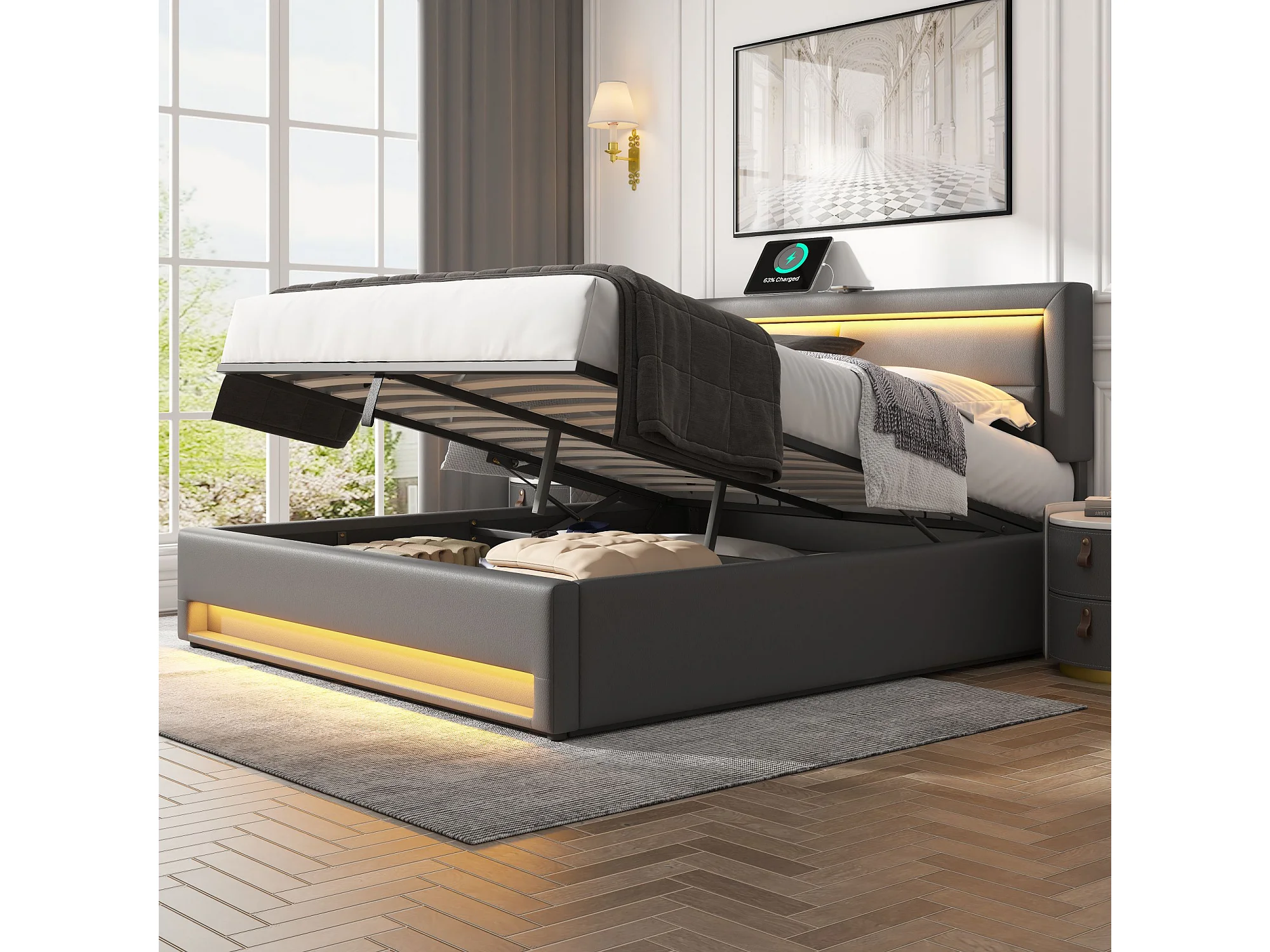 Lit coffre moderne 140x190 cm, port USB (charge sans fil et filaire), LED, rangement, PU gris, sans matelas