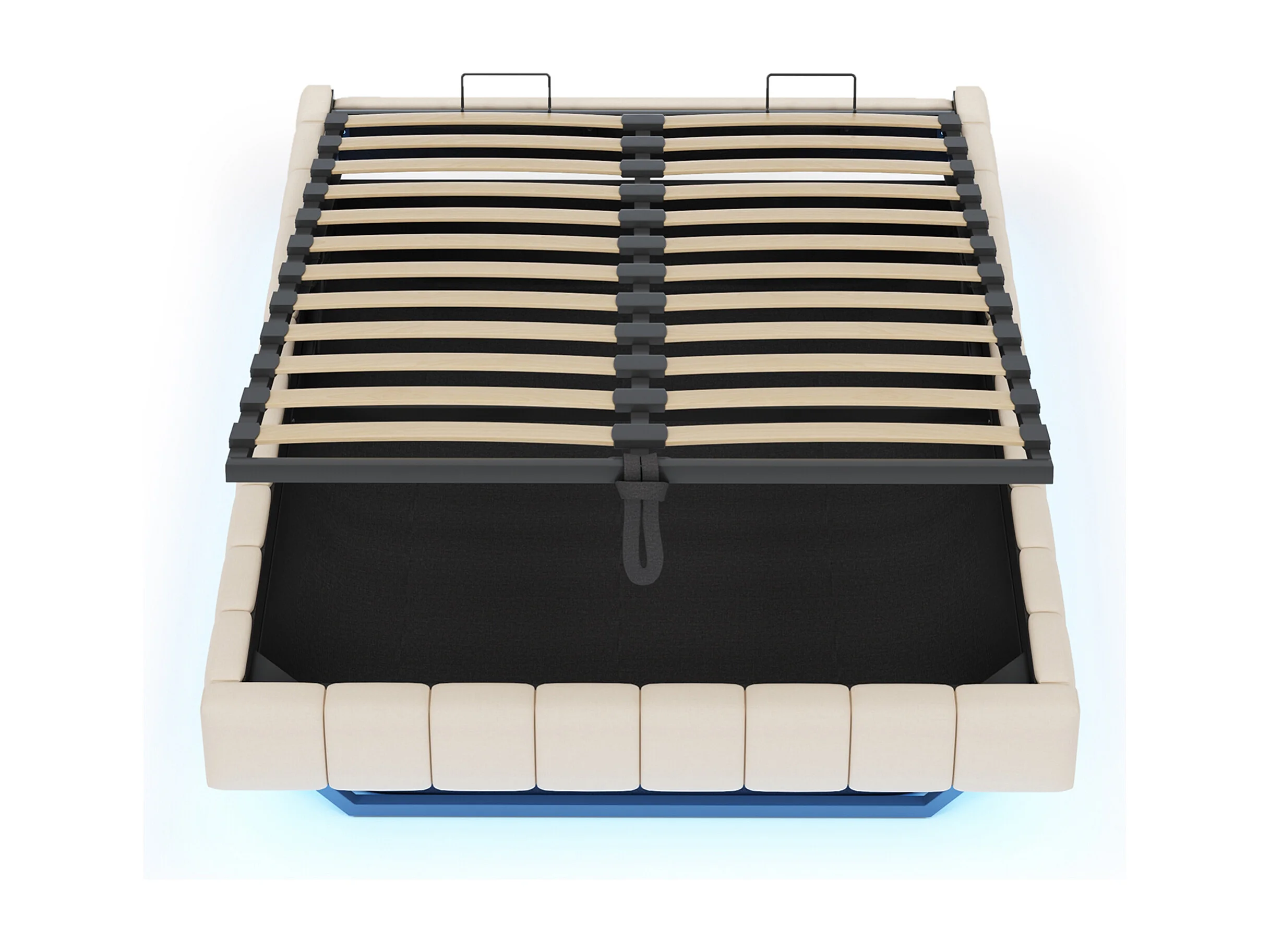 Lit coffre moderne 140x200 cm, tissu en fond, rangement, sans tête de lit, LED, lin beige, sans matelas