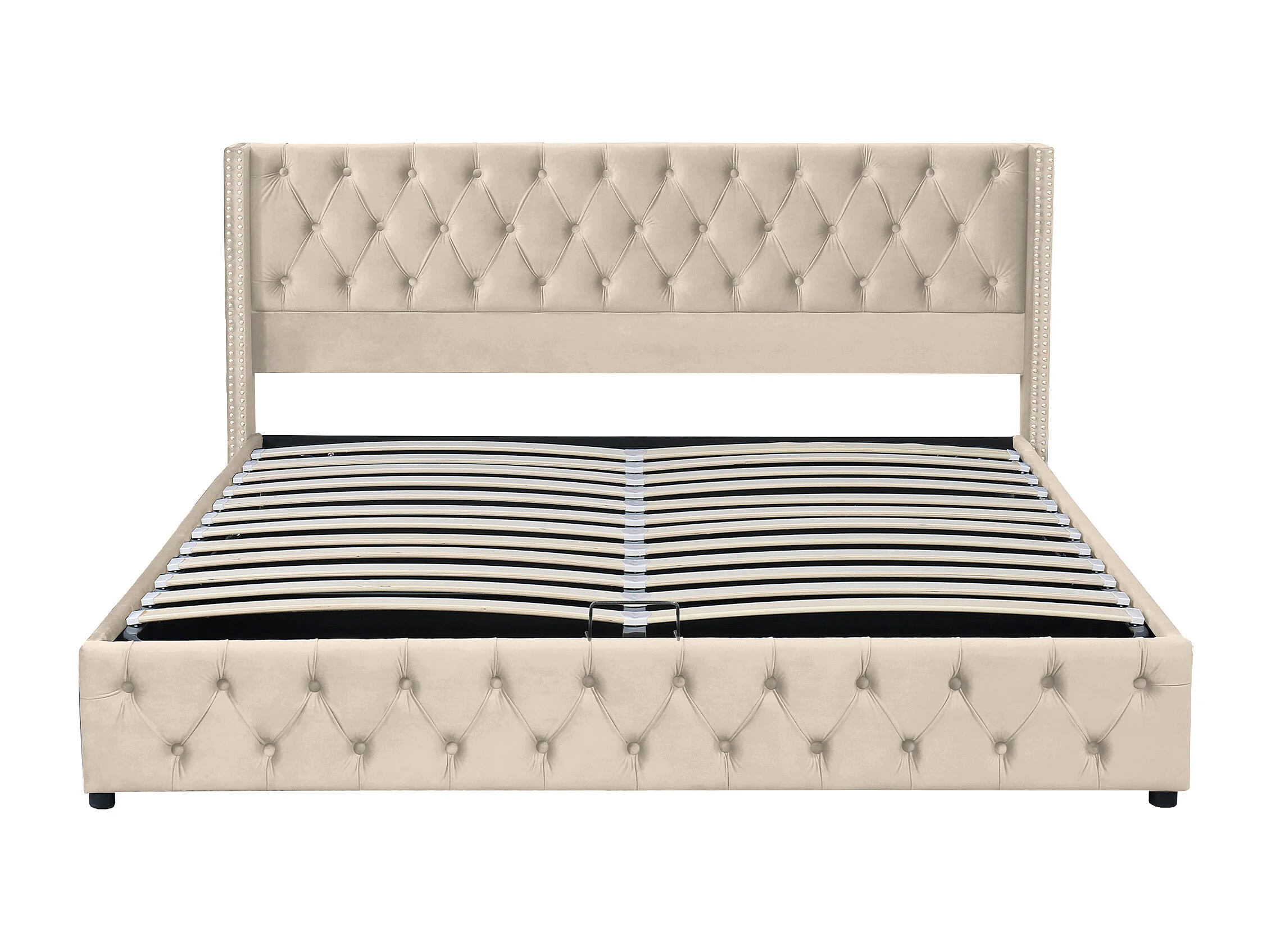 Lit coffre moderne 160x200 cm avec rangement, tissu en fond, sommier à lattes, velours beige, sans matelas