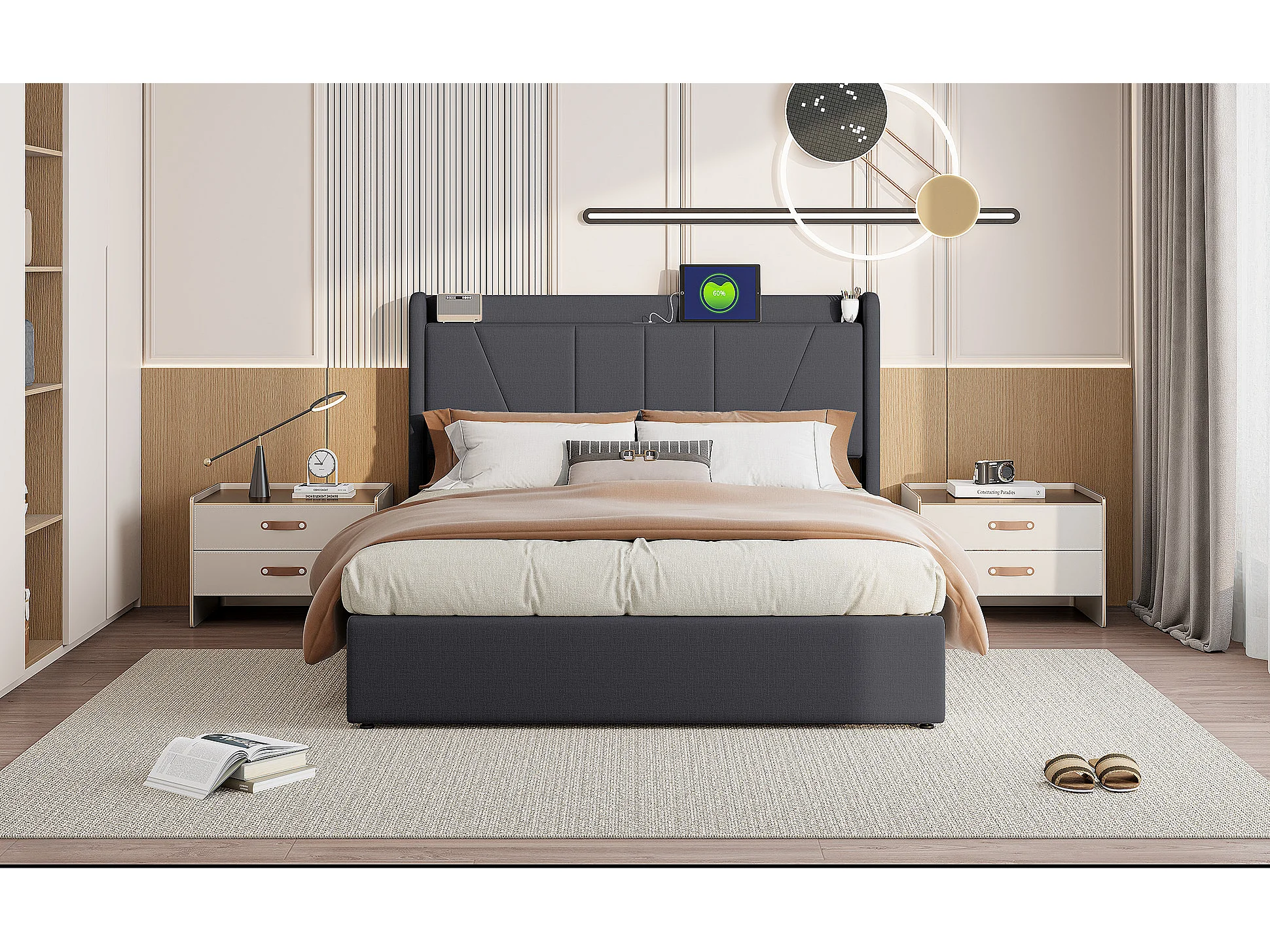 Lit Coffre Moderne avec Ccoffre de Rangement - Lit Capitonné - Cadre de Lit Double - Tête de Lit avec Port de Chargement USB - Gray - 160x200 - Linge